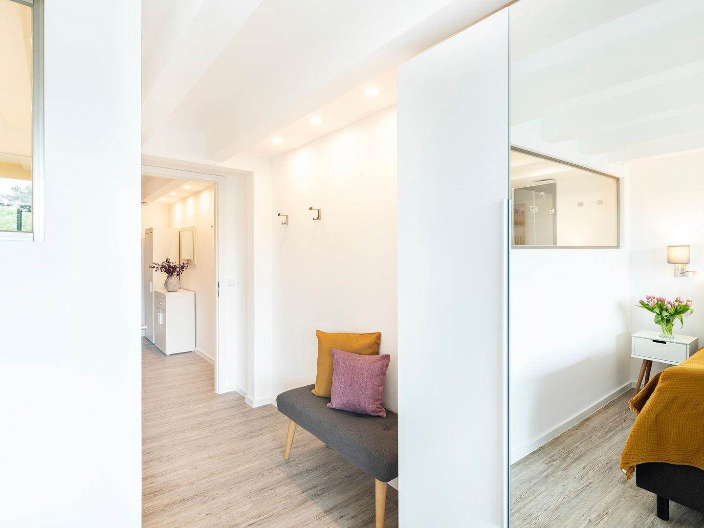 Im Haus Zudar erwartet dich eine lichtdurchflutete Ferienwohnung nur wenige Schritte vom Meer entfernt. Zwei ruhige Schlafzimmer und zwei Balkone öffnen den Blick über Dünen und Wasser, oben lädt eine private Dachterrasse zum Schauen in den weiten Himmel ein. Ein heller Wohnbereich, zwei Bäder, WLAN und sanfte Details schenken Komfort – und der Strand liegt direkt vor der Tür.