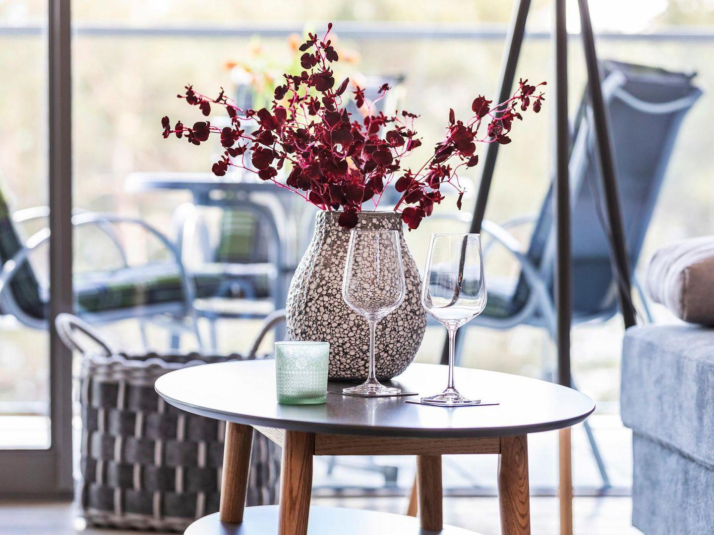 - Wohn-/Essbereich: Sofa, Sitzgruppe, Essbereich, TV, Zugang zum Balkon