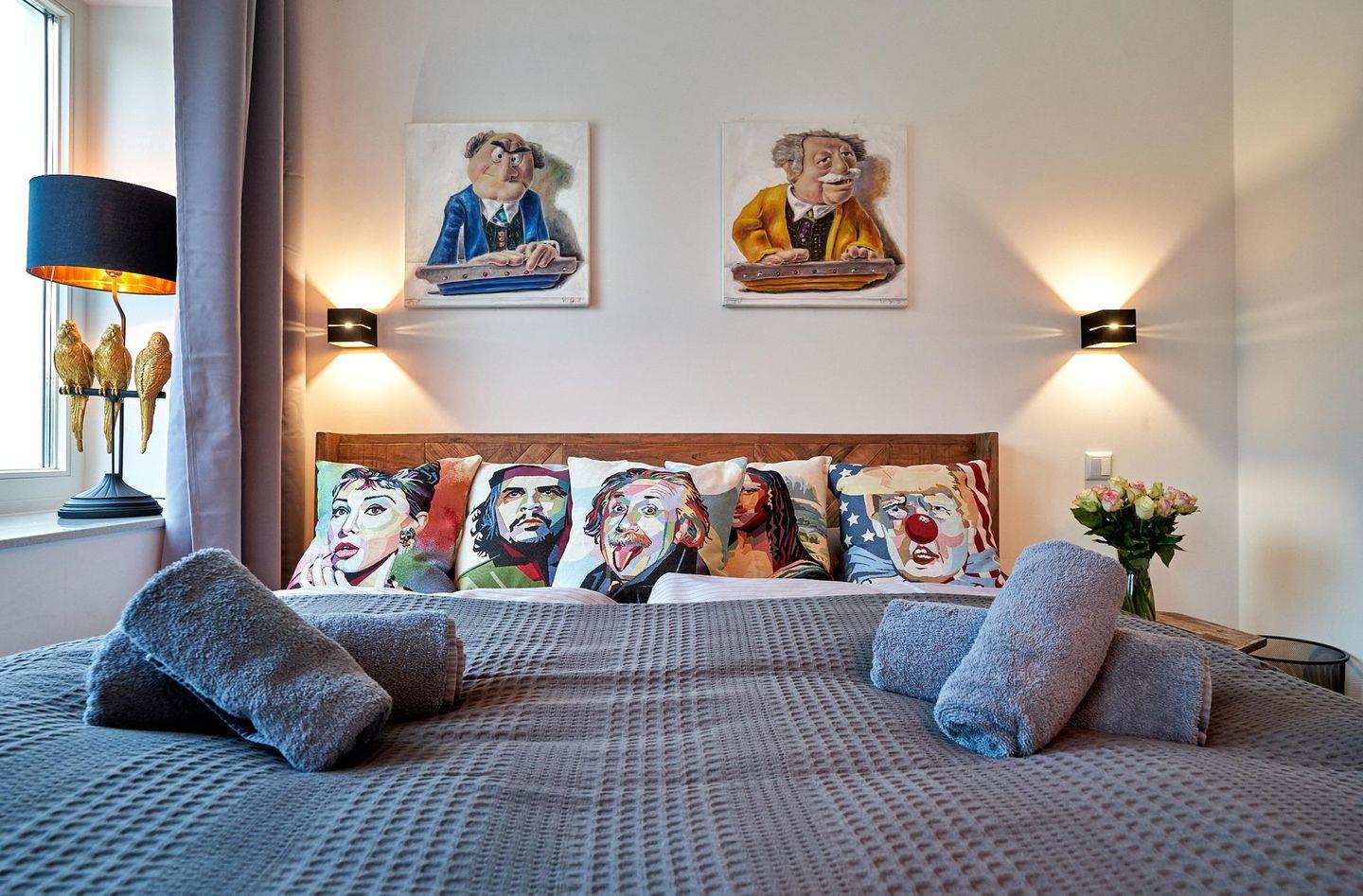 - Schlafzimmer 1 (Seeseite): 1 Doppelbett (180x200), Kleiderschrank, TV, Zugang zum Balkon