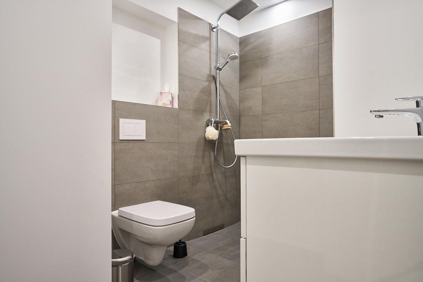 - Badezimmer: Regendusche, WC, Waschbecken, Haartrockner