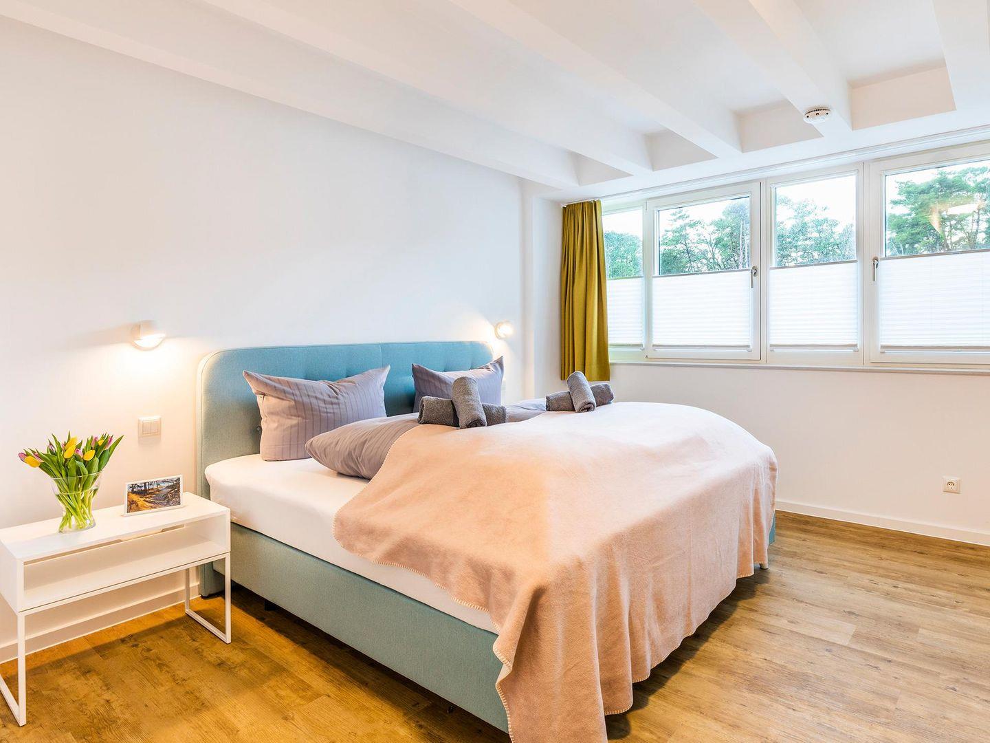 - Schlafzimmer 1 (Seeseite): Boxspringbett (180x200), Kleiderschrank, Sideboard, TV- Flachbild, Gardinen, Zugang zur Terrasse