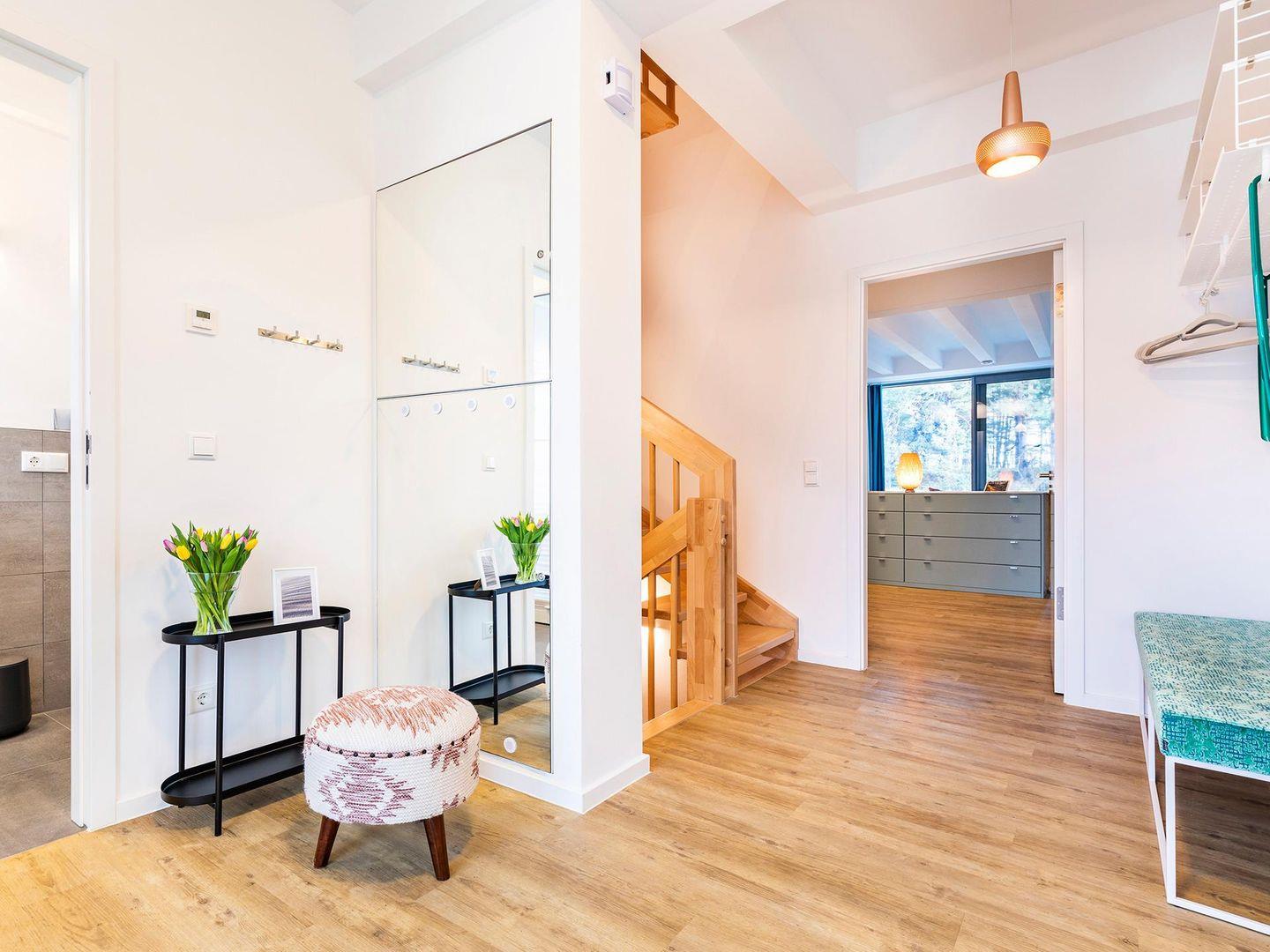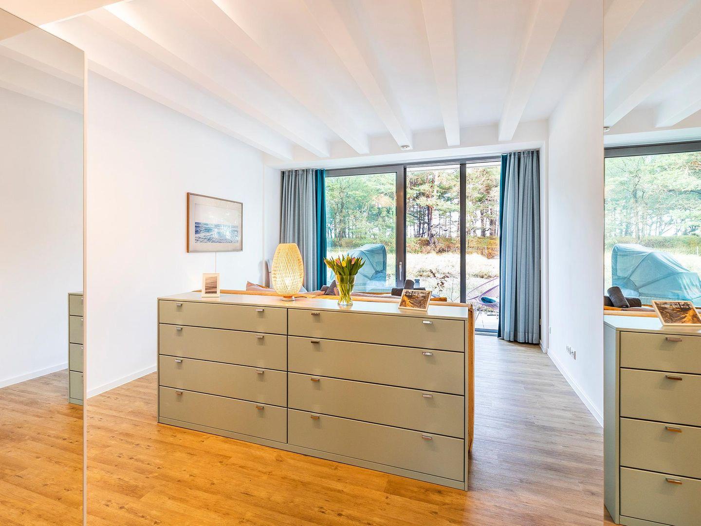 Im EG befindet sich der Garderobenbereich, ein Gäste-WC und meerseitig ein großes "Prinzessinnenschlafzimmer" mit eigener Terrasse und komfortabler Liegeinsel. Im 1. OG befindet sich meerseitig der großzügige offene Wohnbereich mit exzellenter Küchenausstattung, Weinkühlschrank und ein "Quooker Wasserhahn", der Ihnen auch gekühltes sowie kochendes Wasser auf Knopfdruck bietet. Eine große Sofalandschaft, eine bodentiefe Panoramaglasfront und ein 16 m² großer Balkon mit Loungemöbeln lässt Sie mit Blick aufs Meer herrlich entspannen.