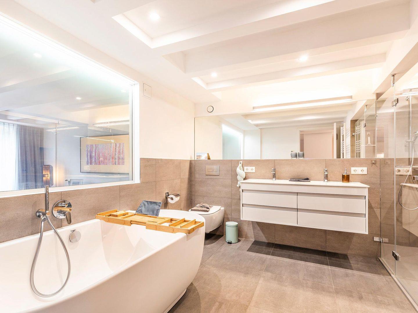- Badezimmer: Badewanne, Regendusche, WC, Doppelwaschbecken, Haartrockner
