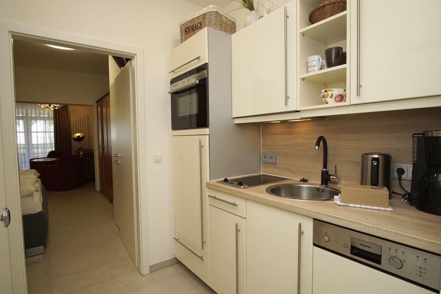 KÜCHE // Küchenzeile, 2-Platten Ceranherd, Kühlschrank mit Gefrierfach, Toaster, Wasserkocher, Kaffeemaschine, Spülmaschine, reichlich Besteck, Geschirr und Küchenutensilien ++