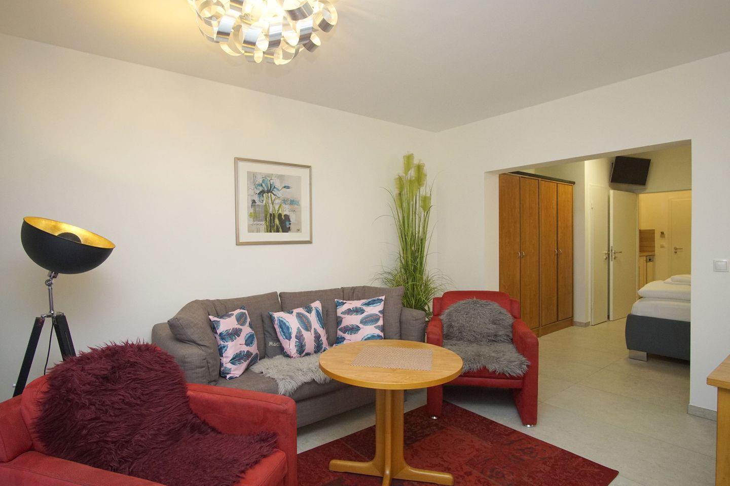 WOHNEN // Wohnraum mit Essbereich, Sitzgarnitur mit bequemer Schlafcouch, Kabel-TV ++
