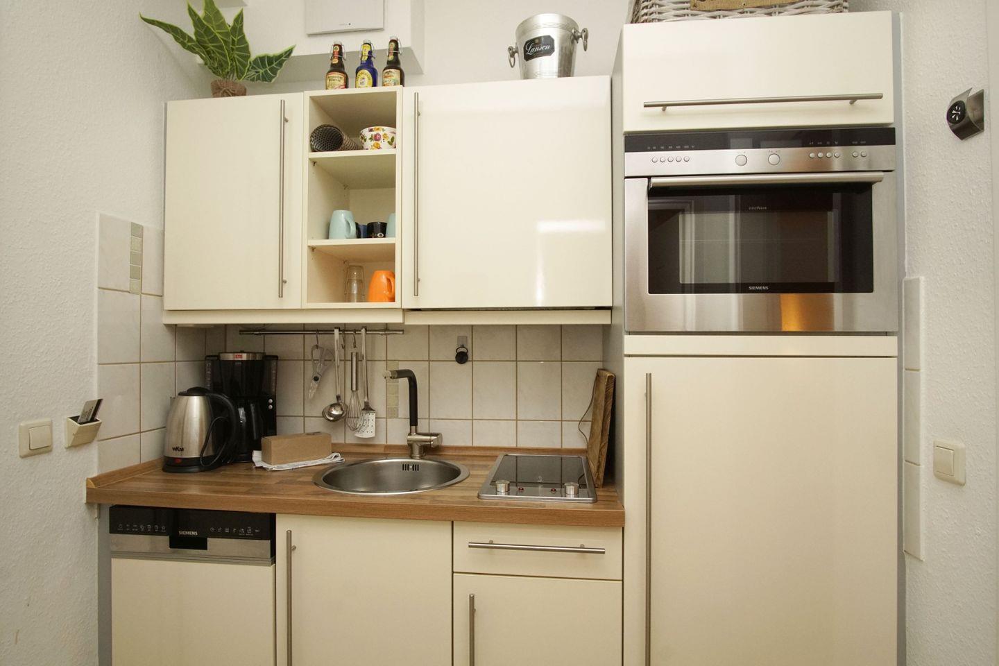 KÜCHE // Küchenzeile, 2-Platten Ceranherd, Kühlschrank mit Gefrierfach, Toaster, Wasserkocher, Kaffeemaschine, Spülmaschine, reichlich Besteck, Geschirr und Küchenutensilien ++