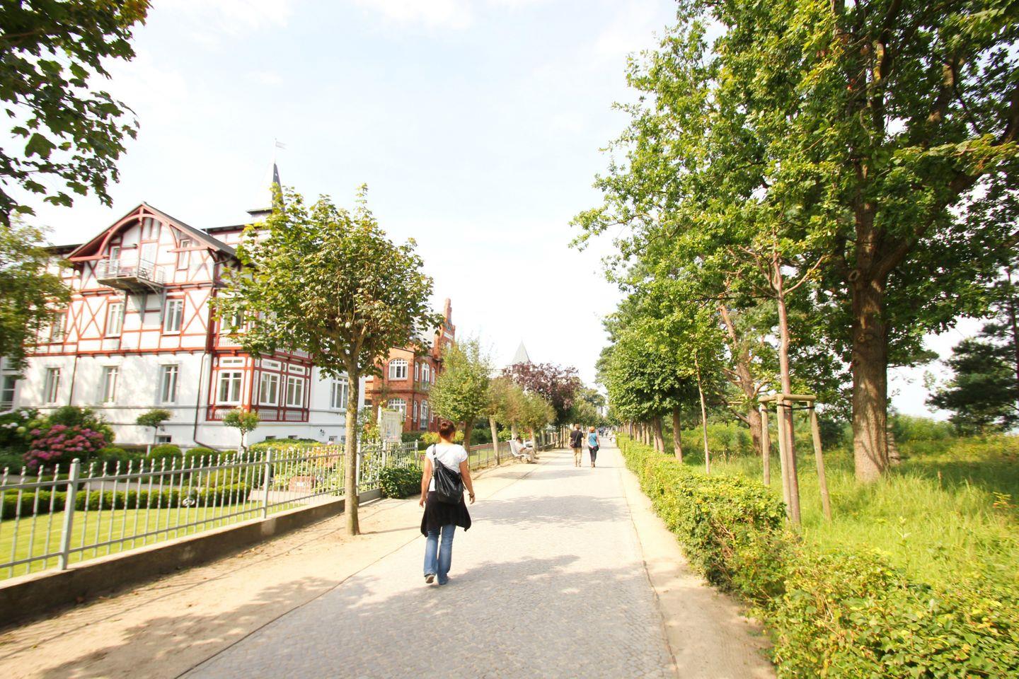 Von der Villa sind es nur wenige Minuten bis zum Ostseestrand. Der feinsandige Badestrand und gemütliche Strandkörbe schmücken die Strandpromenade. Zahlreiche Geschäfte, Cafés und Restaurants sind im Ortskern des Ostseebades zu finden.