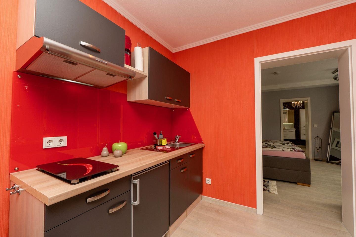 KÜCHE // Küchenzeile, 2-Platten Herd, Kühlschrank, Toaster, Wasserkocher, Kaffeemaschine, Eierkocher, reichlich Besteck, Geschirr und Küchenutensilien ++