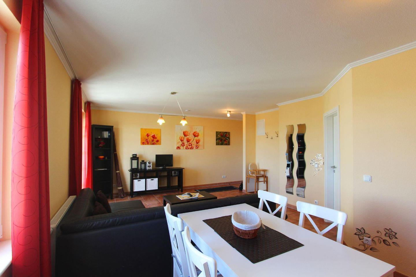 WOHNEN // Wohnraum mit Essbereich, Sitzgarnitur mit bequemer Schlafcouch, Flachbild-TV (Kabel), Radio, CD-Player, DVD-Player ++