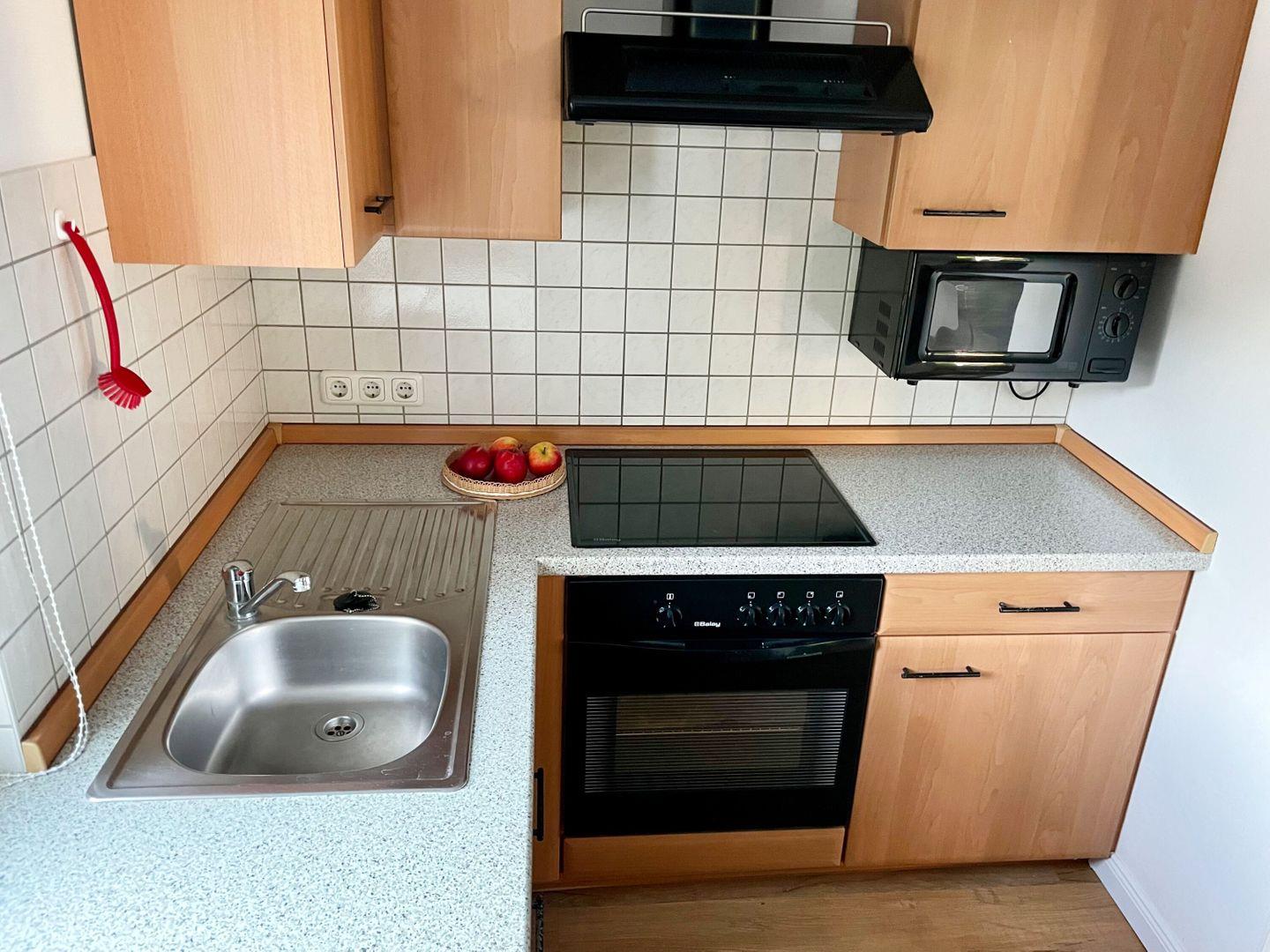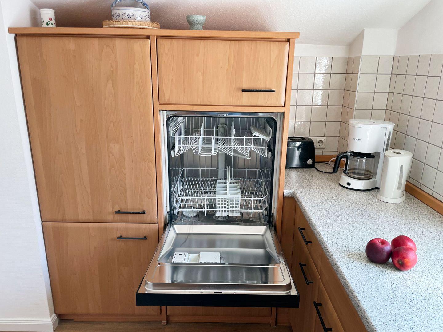 KÜCHE // Offene Küche, 4-Platten Cerankochfeld, Backofen, Kühlschrank, Toaster, Wasserkocher, Kaffeemaschine, Geschirrspüler, reichlich Besteck, Geschirr und Küchenutensilien ++