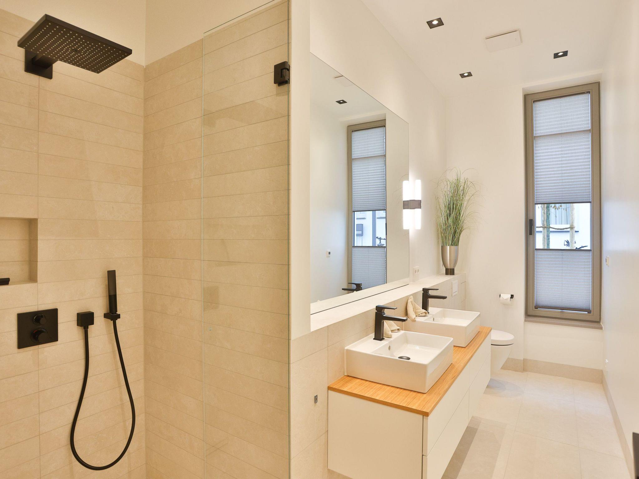 BadezimmerIm Badezimmer finden Sie eine große bodenebene Dusche , ein Doppelwaschbecken und eine Toilette mit Fenster.