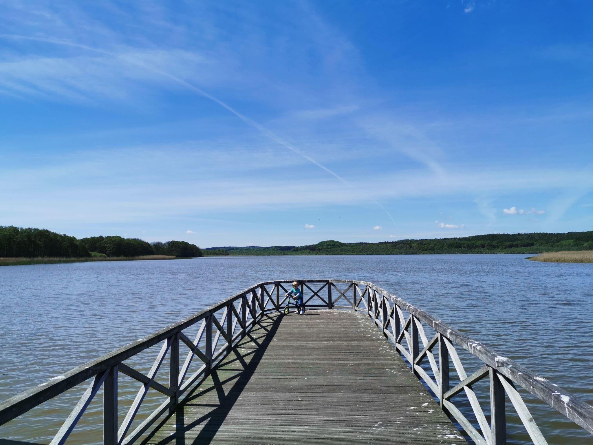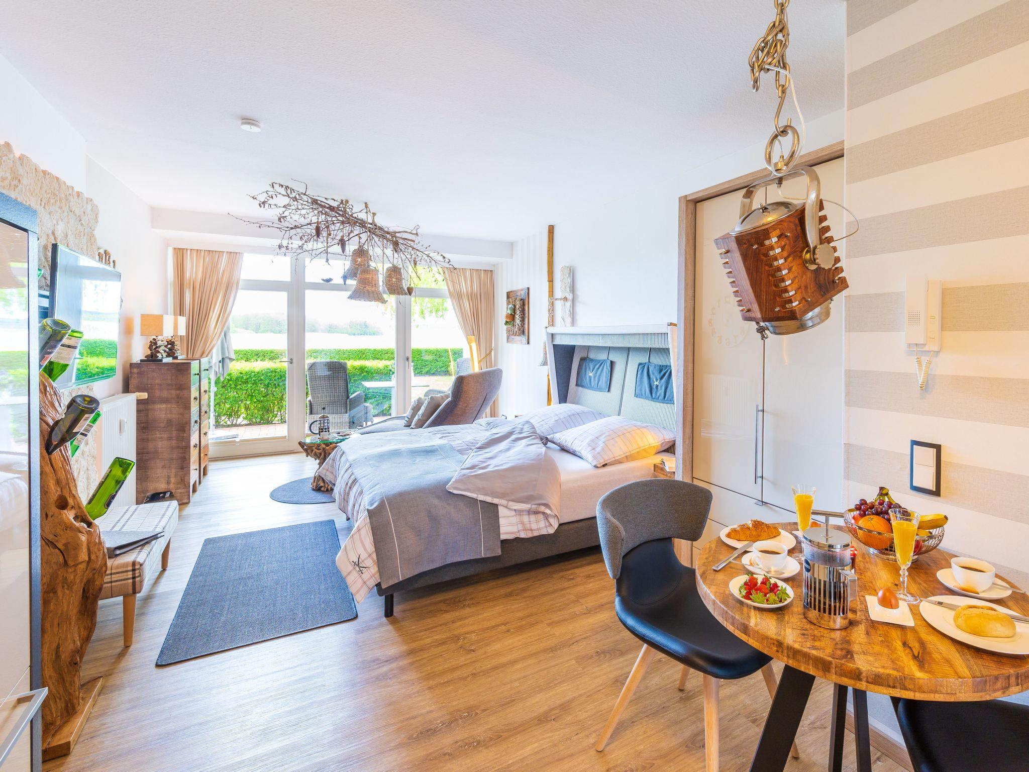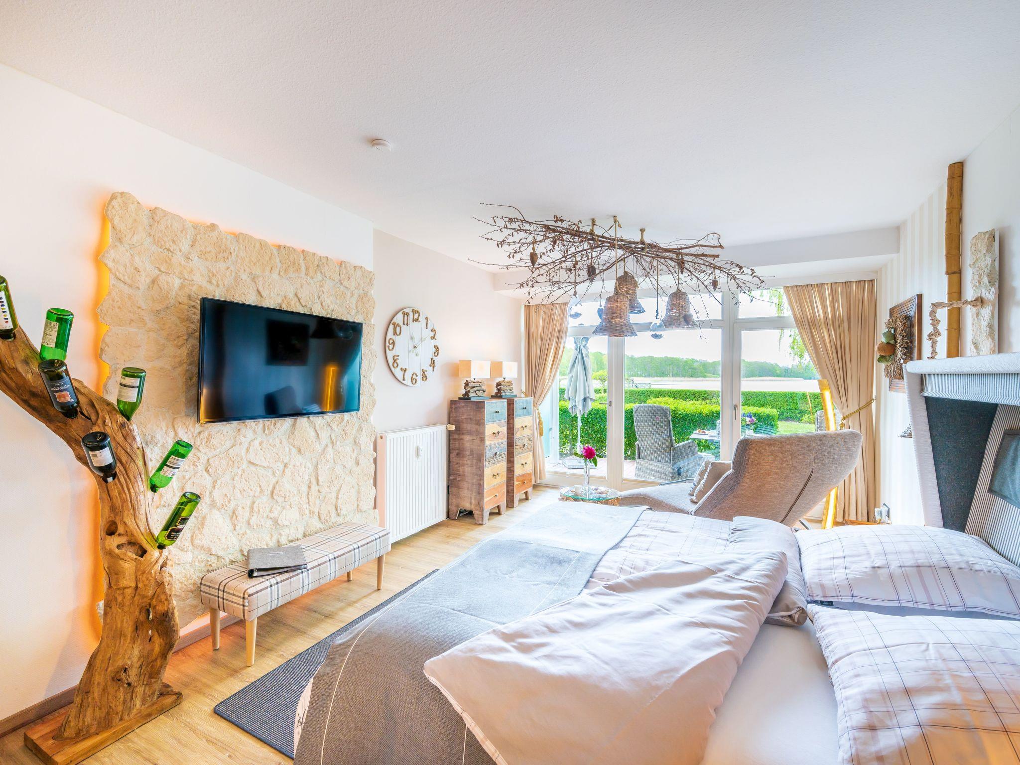 Die exklusive und mit viel Liebe eingerichtete Ferienwohnung Seeblick ist lichtdurchflutet. Sie verfügt über einen Wohnraum mit elektrisch verstellbarem Sitzmöbel, ein Sansibar-Boxspringbett (180 x 200 cm), einen 46-Zoll-LED-Fernseher, Kabel-TV, Digitalradio und kostenloses WLAN. Vom gesamten Wohnbereich aus haben Sie einen schönen Blick auf den Schmachter See.