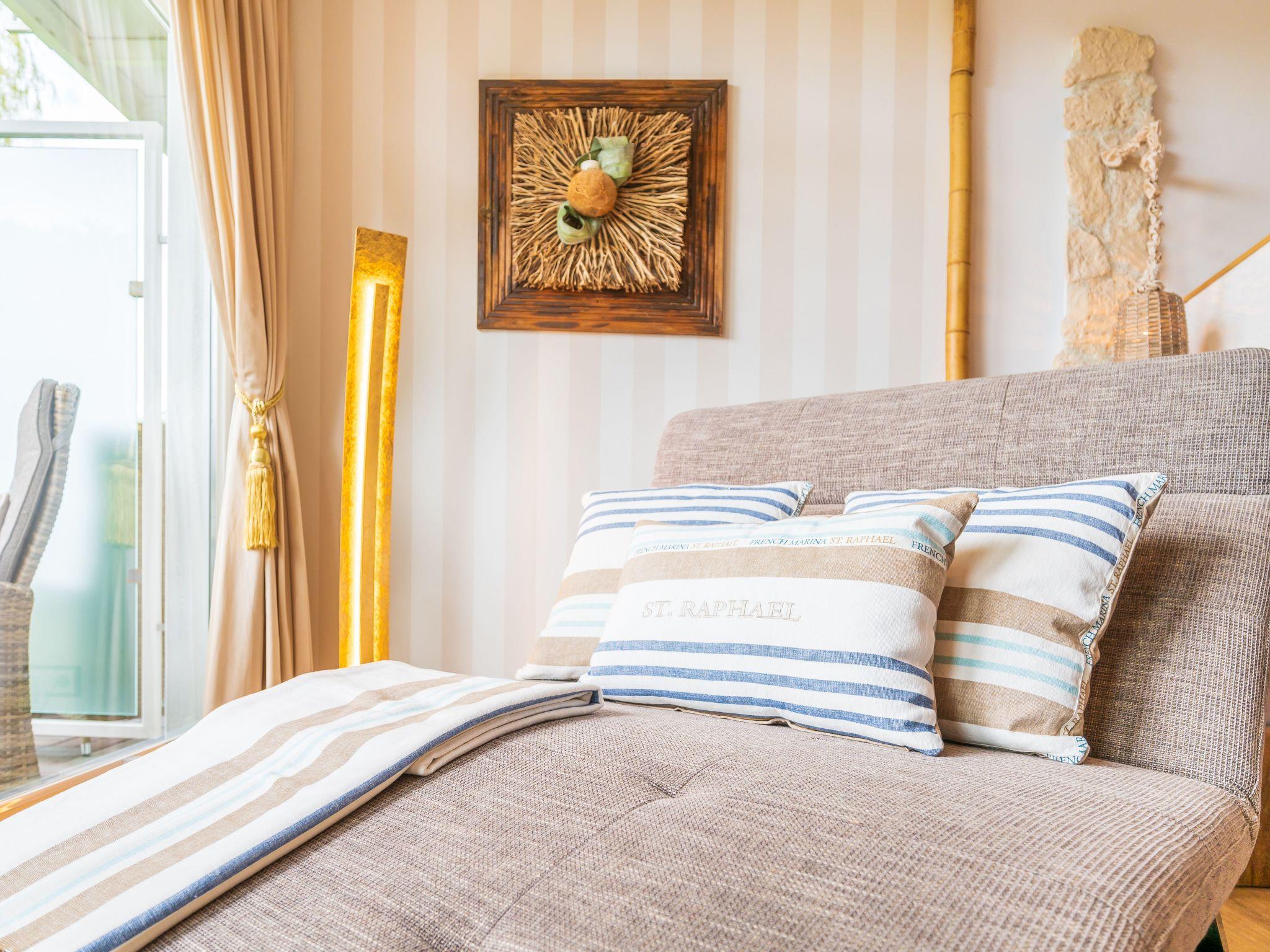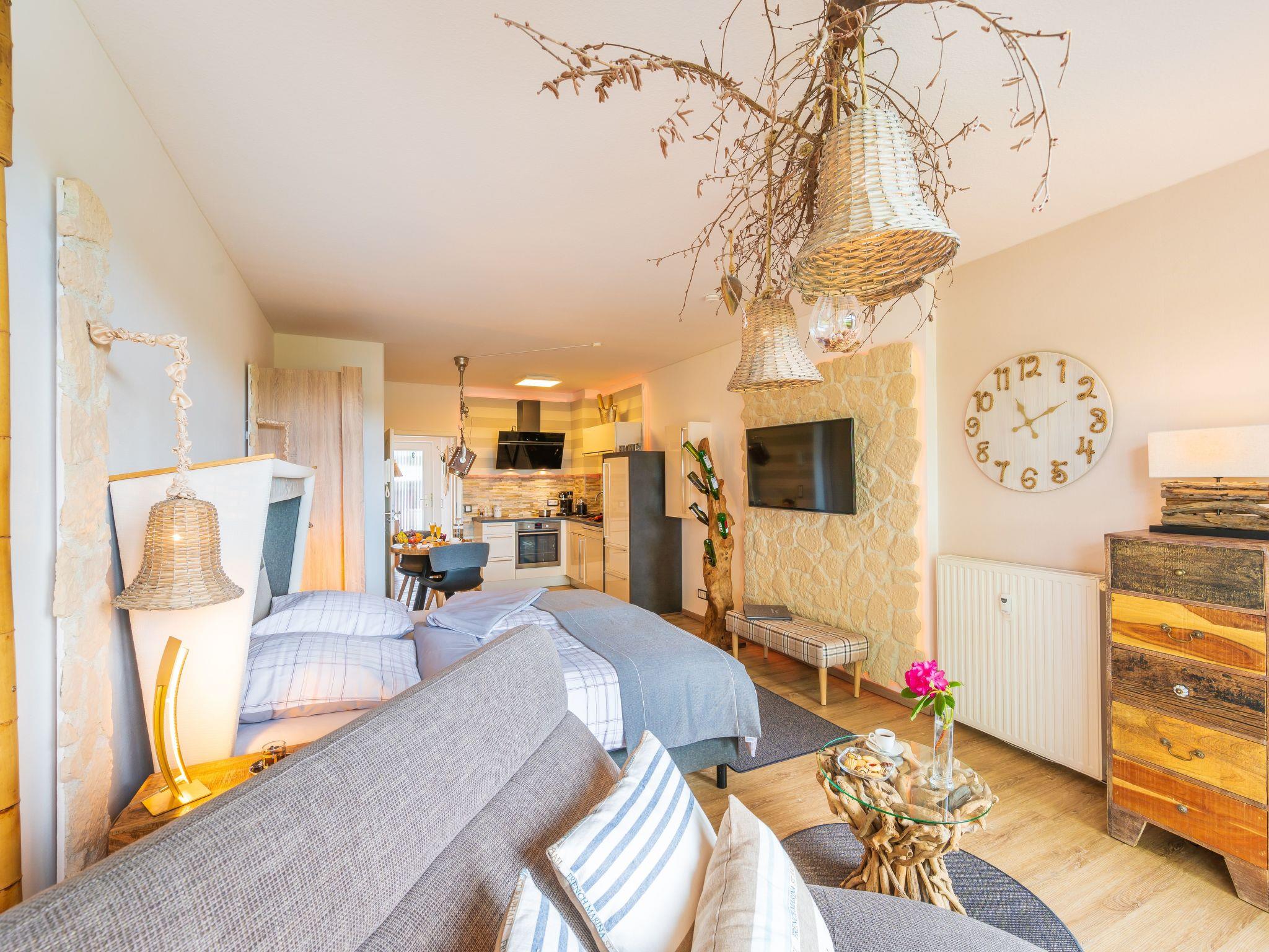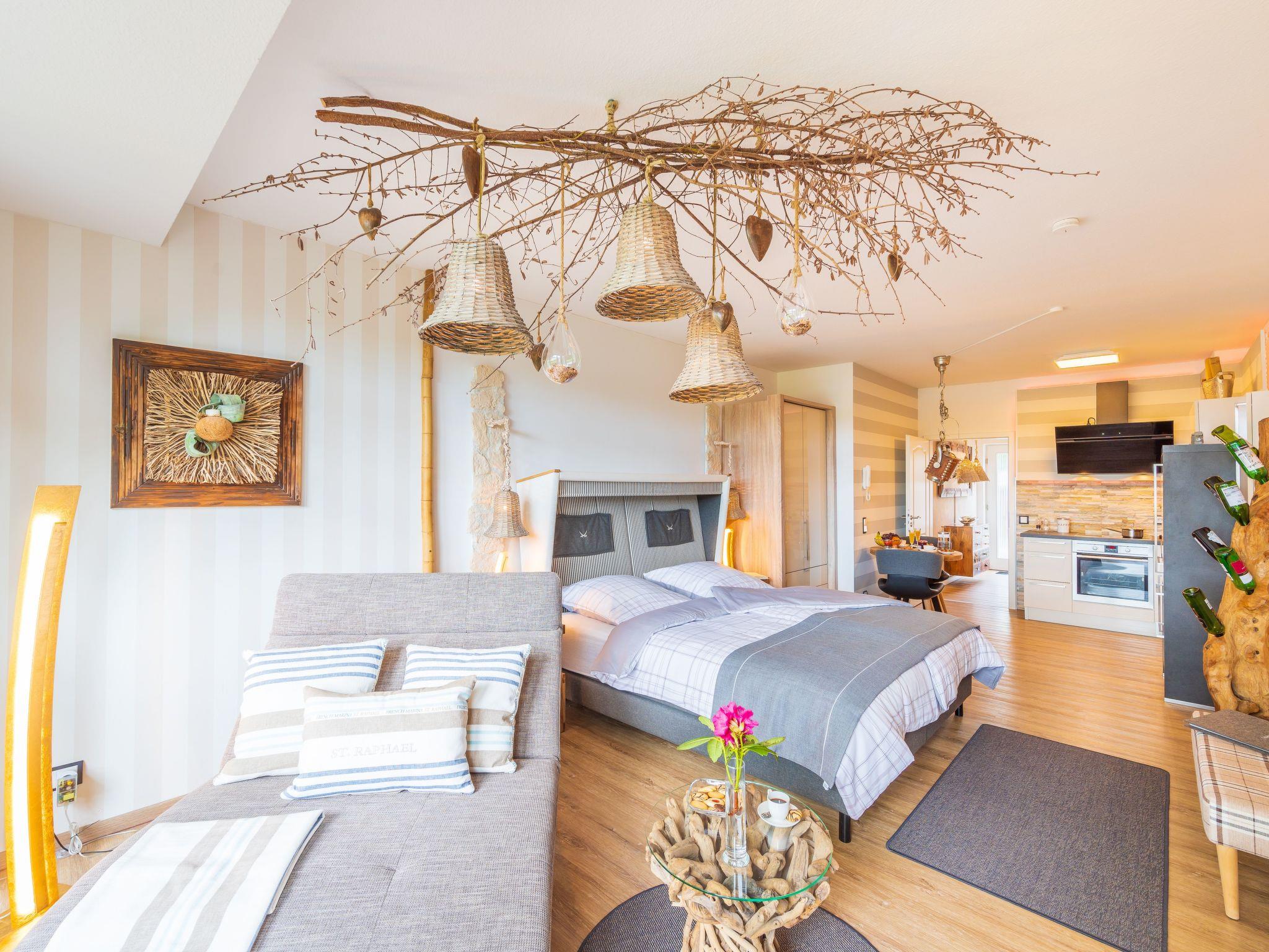 Die exklusive und mit viel Liebe eingerichtete Ferienwohnung Seeblick ist lichtdurchflutet. Sie verfügt über einen Wohnraum mit elektrisch verstellbarem Sitzmöbel, ein Sansibar-Boxspringbett (180 x 200 cm), einen 46-Zoll-LED-Fernseher, Kabel-TV, Digitalradio und kostenloses WLAN. Vom gesamten Wohnbereich aus haben Sie einen schönen Blick auf den Schmachter See.