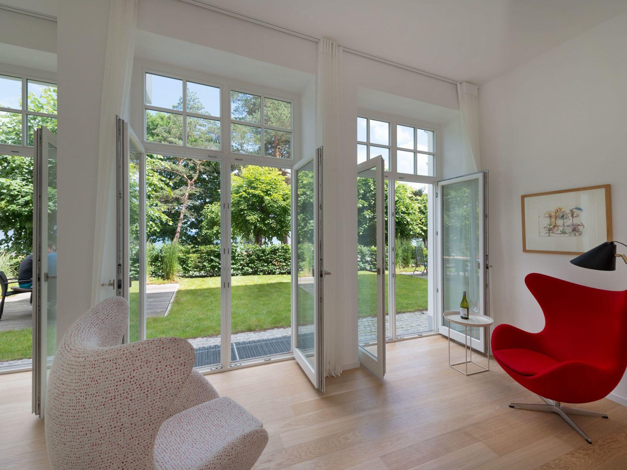 Diese Wohnung mit eigenem großen Garten befindet sich im Erdgeschoss der Villa. Die Wohnung für bis zu sechs Personen und mit einer Wohnfläche von 127 m² ist sehr hochwertig mit ausgewählten Design-Möbeln eingerichtet und verfügt über drei Zimmer. Aus dem gesamten Wohnbereich haben Sie einen atemberaubenden Blick auf die Ostsee. Die Wohnung hat zwei große, ineinander übergehende Wohnzimmer, in denen Sie herrlich entspannen können. Sie haben eine Wohnfläche von 65 m², einen Sony-Flachbildfernseher und eine offene Küche. Die hochwertigen Siemens-Geräte und die Vollausstattung in der modernen Küche mit Essbereich machen das Kochen zu einem Vergnügen. In den zwei großzügigen Schlafzimmern mit jeweils einem Doppelbett (180 cm breit) werden Sie bestens schlafen und die beiden top modernen Bäder sorgen für einen beschwingten Start in den Tag. Das eine Badezimmer ist mit Badewanne, Dusche und WC, das andere mit Dusche und WC ausgestattet. Die Böden der Ferienwohnung bestehen aus Eichenparkett. Ein Zustellbett (90 x 200 cm) sowie ein Doppelschlafsofa (180 x 200 cm) bieten die Möglichkeit der Aufbettung für mehr als vier Gäste. Im Abstellraum im Eingangsbereich können Gegenstände verstaut und auf ein wohnungseigenes Zustell- bzw. Babybett und den Hochstuhl zugegriffen werden.
