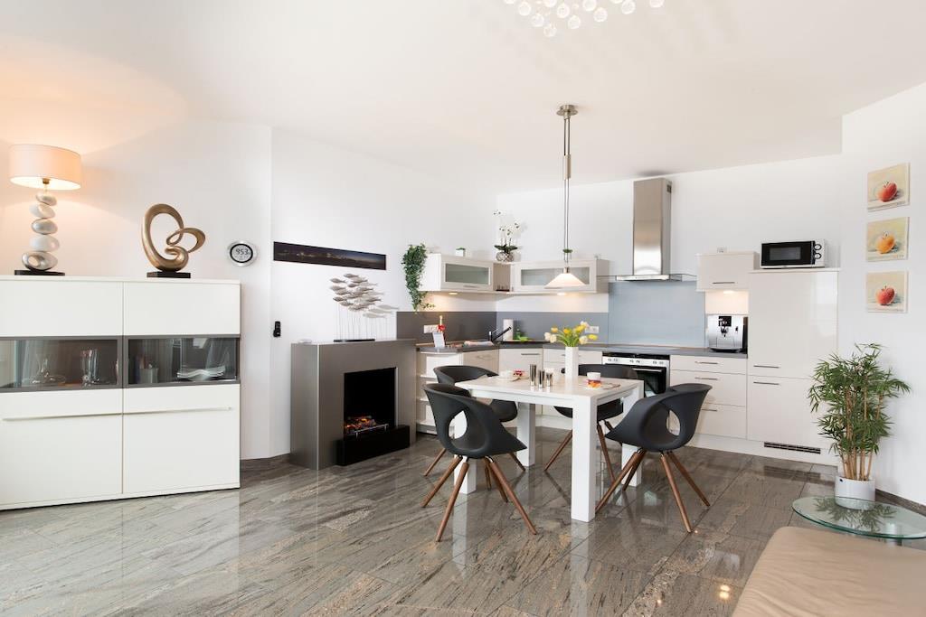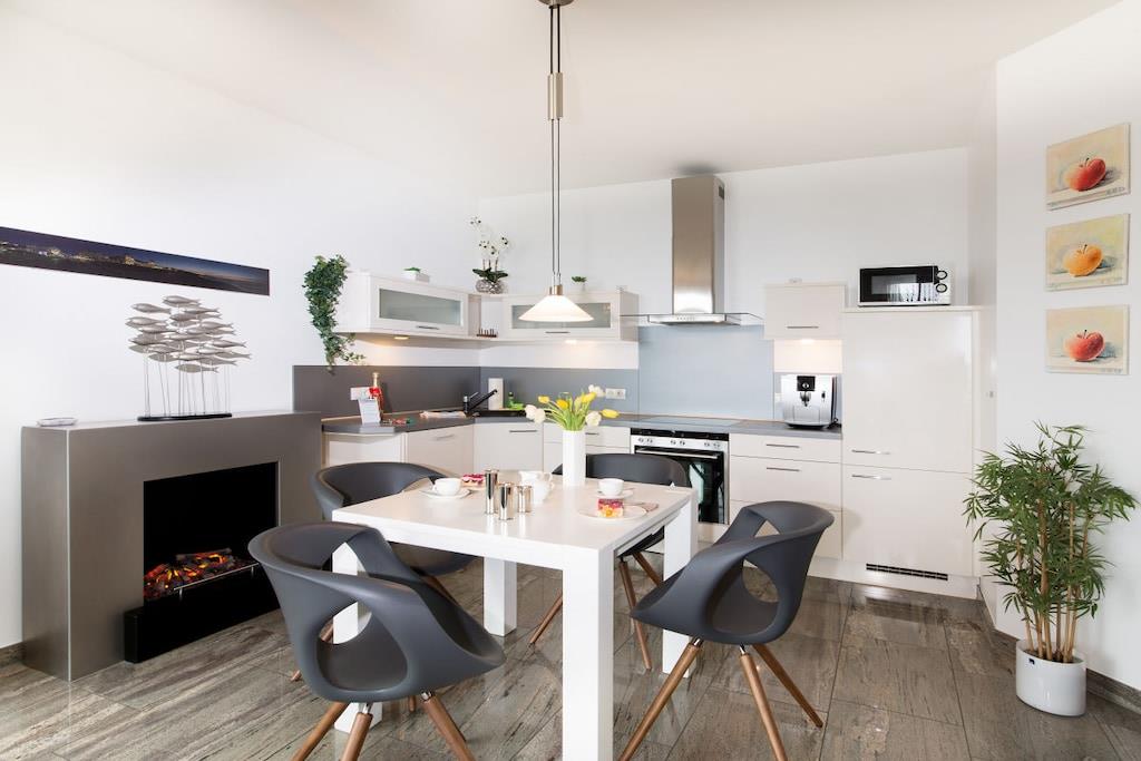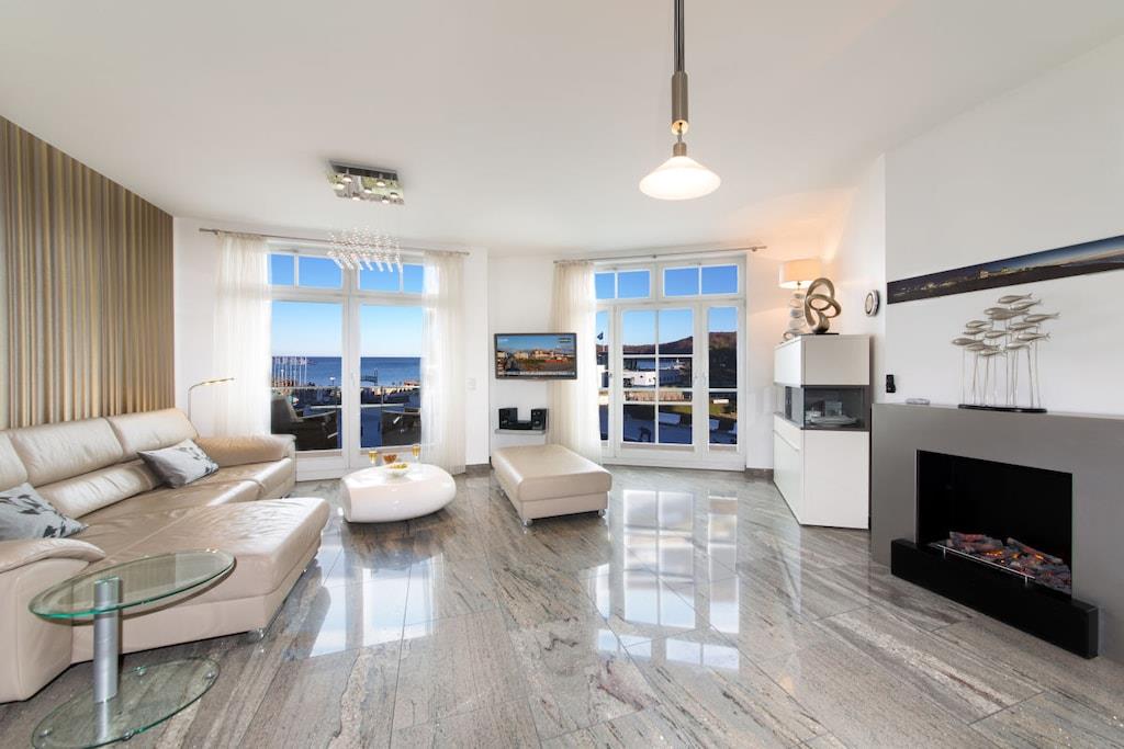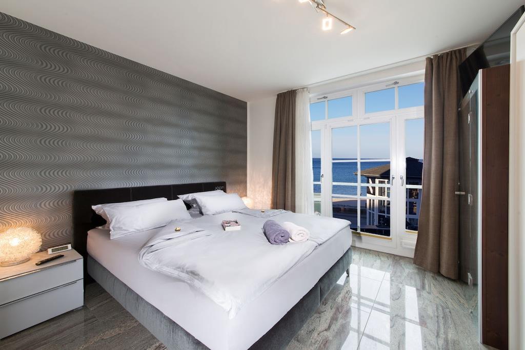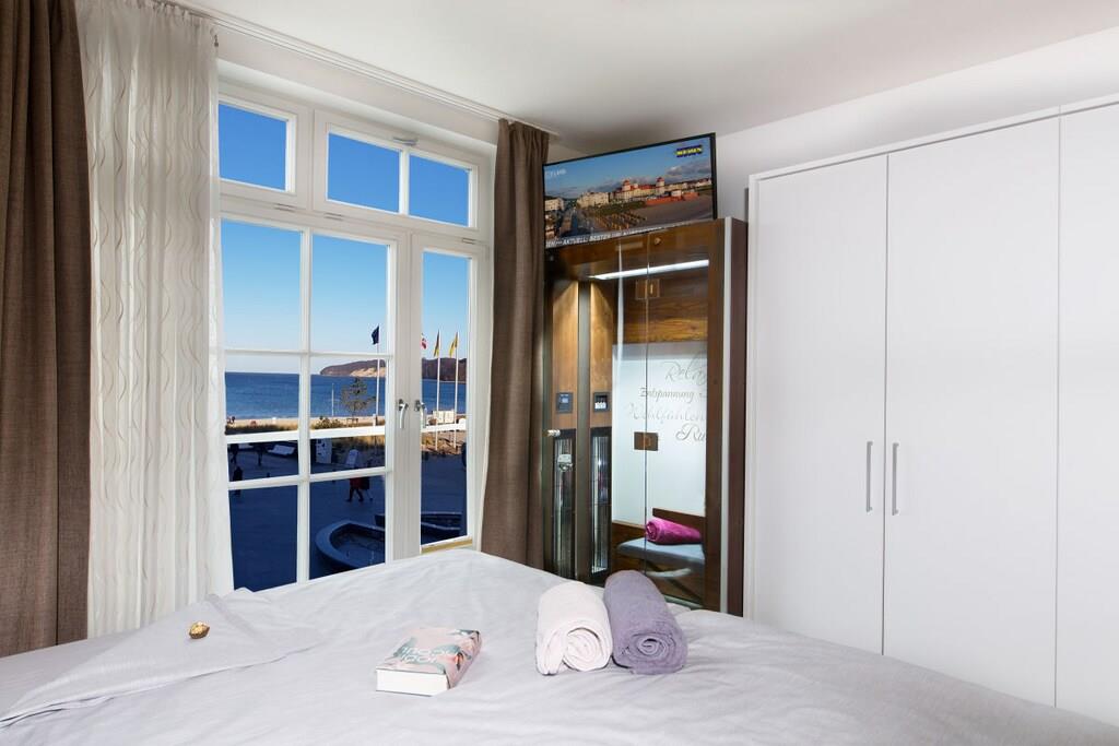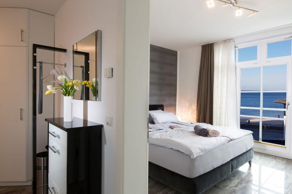 Wir garantieren einen erholsamen und unvergesslichen Urlaub in dieser exklusiven Residenz. Genießen Sie den einzigartigen Blick auf die Ostsee, die berühmten Kreidefelsen, die Strandpromenade und die Binzer Seebrücke. Diese luxuriöse Urlaubsresidenz verfügt über ein komfortables Schlafzimmer mit Joop Boxspringbett und traumhaften Blick auf die Ostsee, ein luxuriöses Granitbad, eine komplett ausgestattete Küche mit Backofen, Spülmaschine und Jura Kaffeevollautomat sowie ein geräumiges Wohnzimmer mit Kamin und ebenfalls traumhaften Ostseeblick aus zwei bodentiefen Panoramafenstern. In unserer Residenz befindet sich Ihre private Physiotherm Infrarotkabine mit Licht- u. Aromatherpie sowie Blick auf die Ostsee. Fußbodenheizung in allen Räumen. Balkon mit Meerblick.