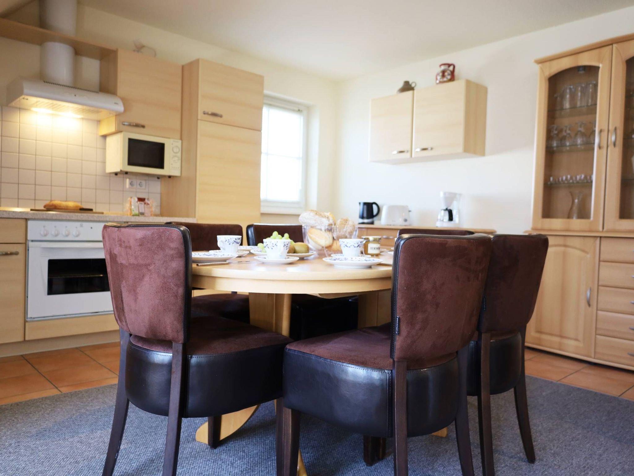 Die komplett ausgestattete Küchenzeile verfügt über einen Geschirrspüler, Backherd, Mikrowelle, Kühlschrank mit Gefrierfach und weiteren nützlichen Geräten wie Kaffeemaschine, Toaster, Wasserkocher etc. Die angrenzende großzügige Sitzgruppe bietet Platz für bis zu 6 Personen.