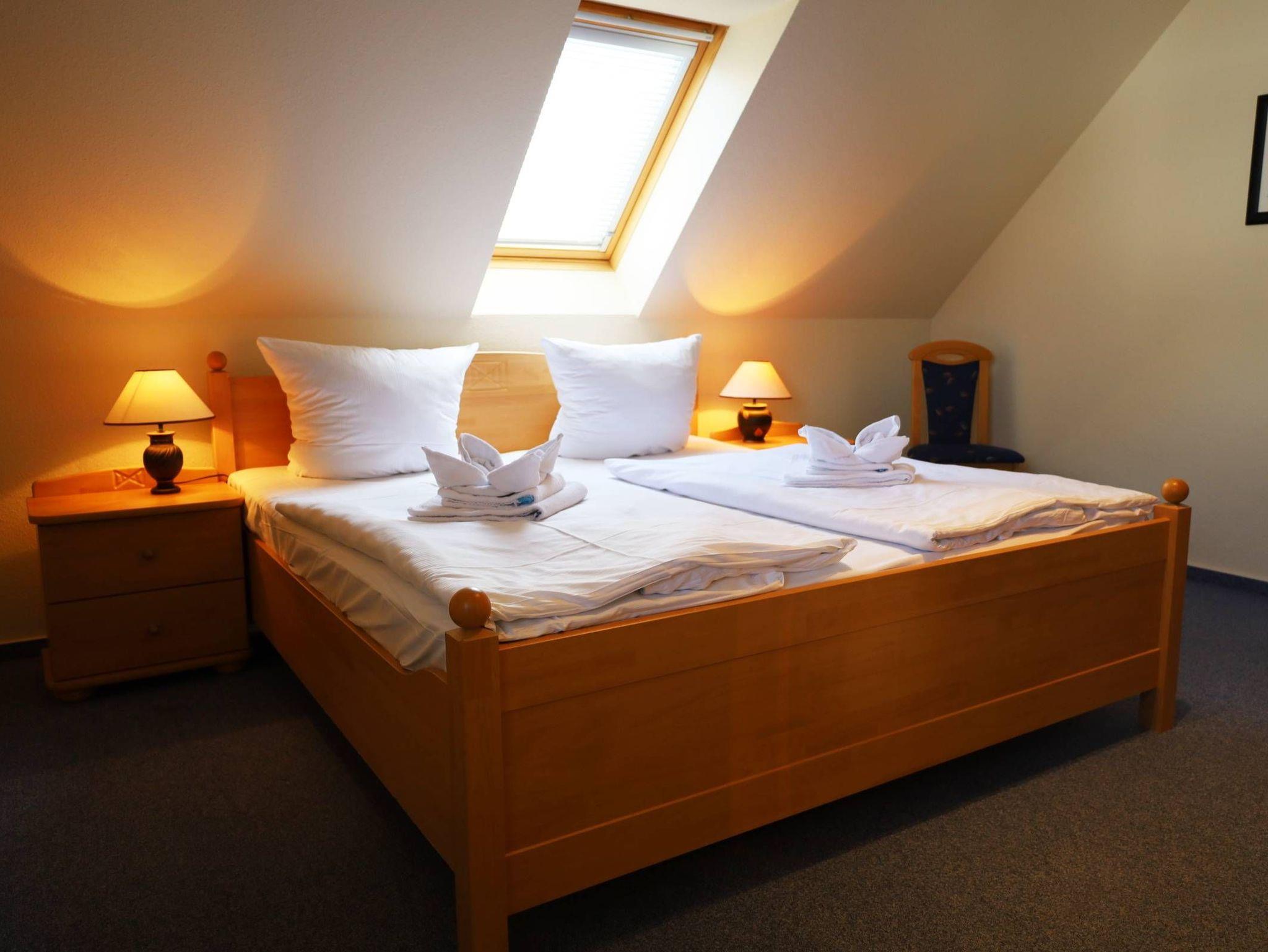 Zwei separate Schlafzimmer, wobei das 1. Schlafzimmer mit komfortablen Doppelbett sowie einem großräumigen Kleiderschrank und das 2. Schlafzimmer mit zwei zusammengestellten bequemen Schlafliegen (können auch getrennt gestellt werden) sowie einem Relaxsessel und einem zusätzlichen Flachbildfernseher ausgestattet sind. Das Badezimmer mit Fenster verfügt über eine Dusche. Zur Wohnung gehört ein eigener Pkw-Stellplatz hinterm Haus. Das Apartment ist eine Nichtraucherwohnung.