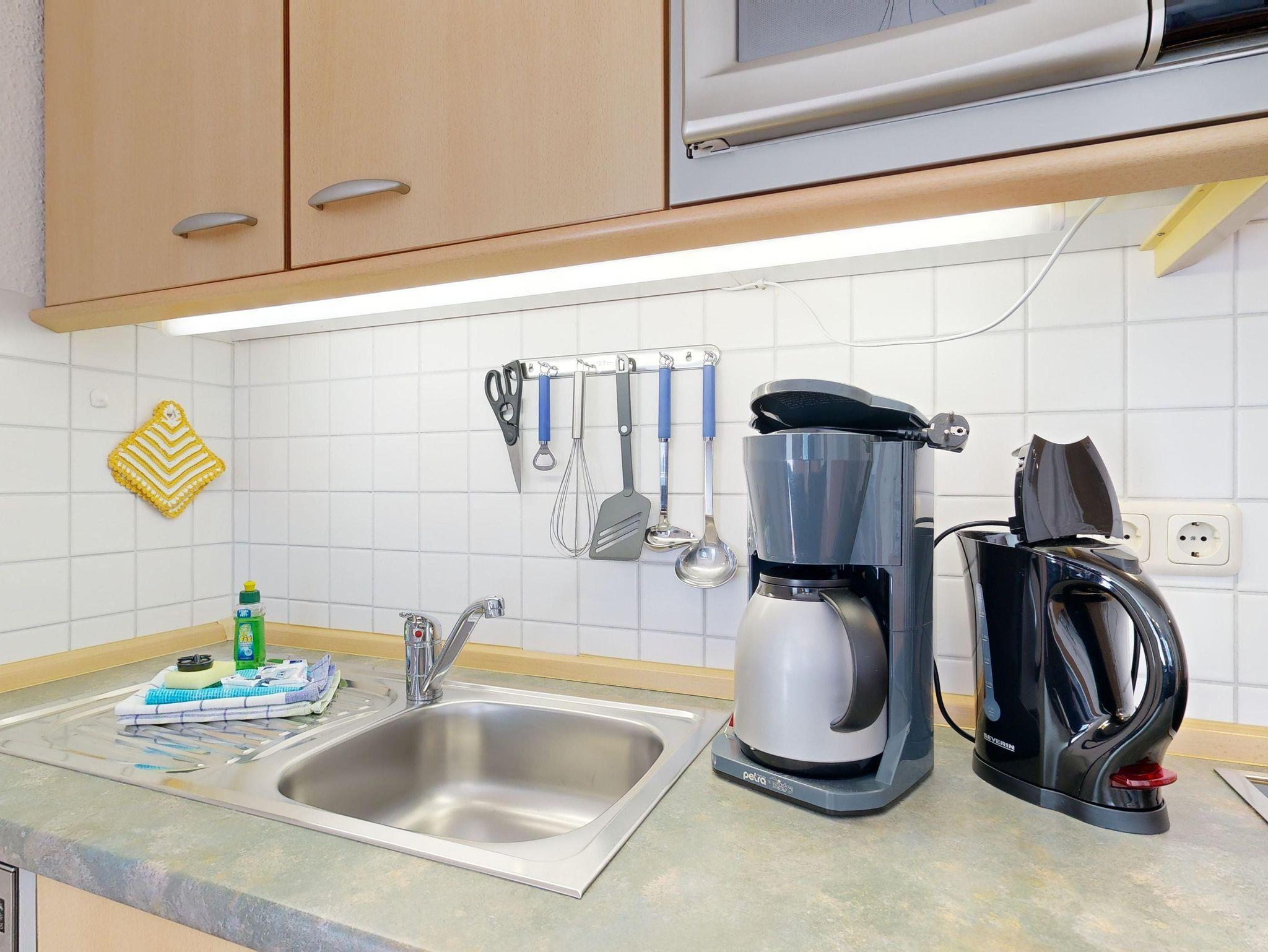Küchenzeile mit Spülmaschine, Ceranfeld, Mikrowelle, Kaffeemaschine, Toaster und Kühlschrank mit Gefrierfach