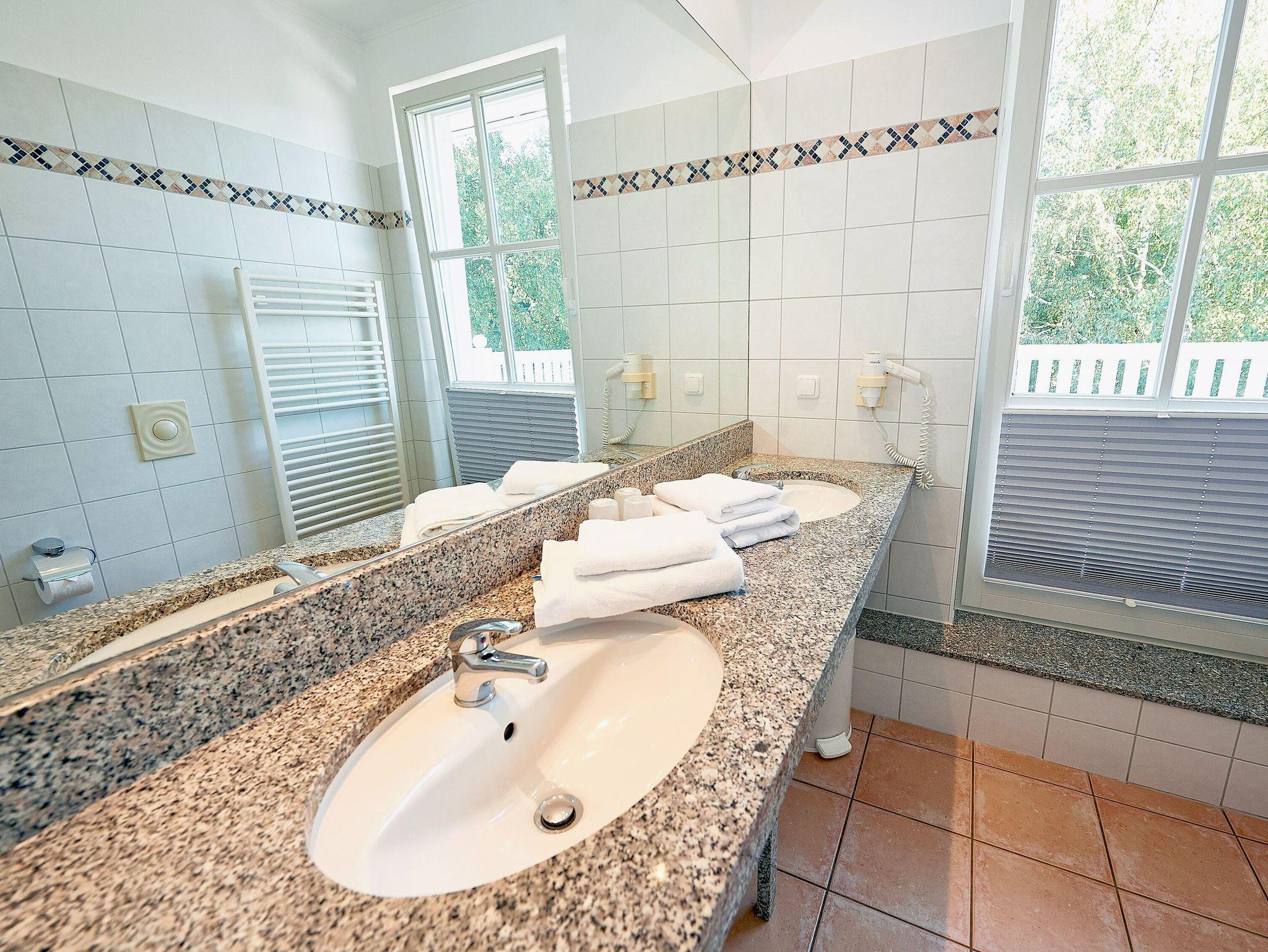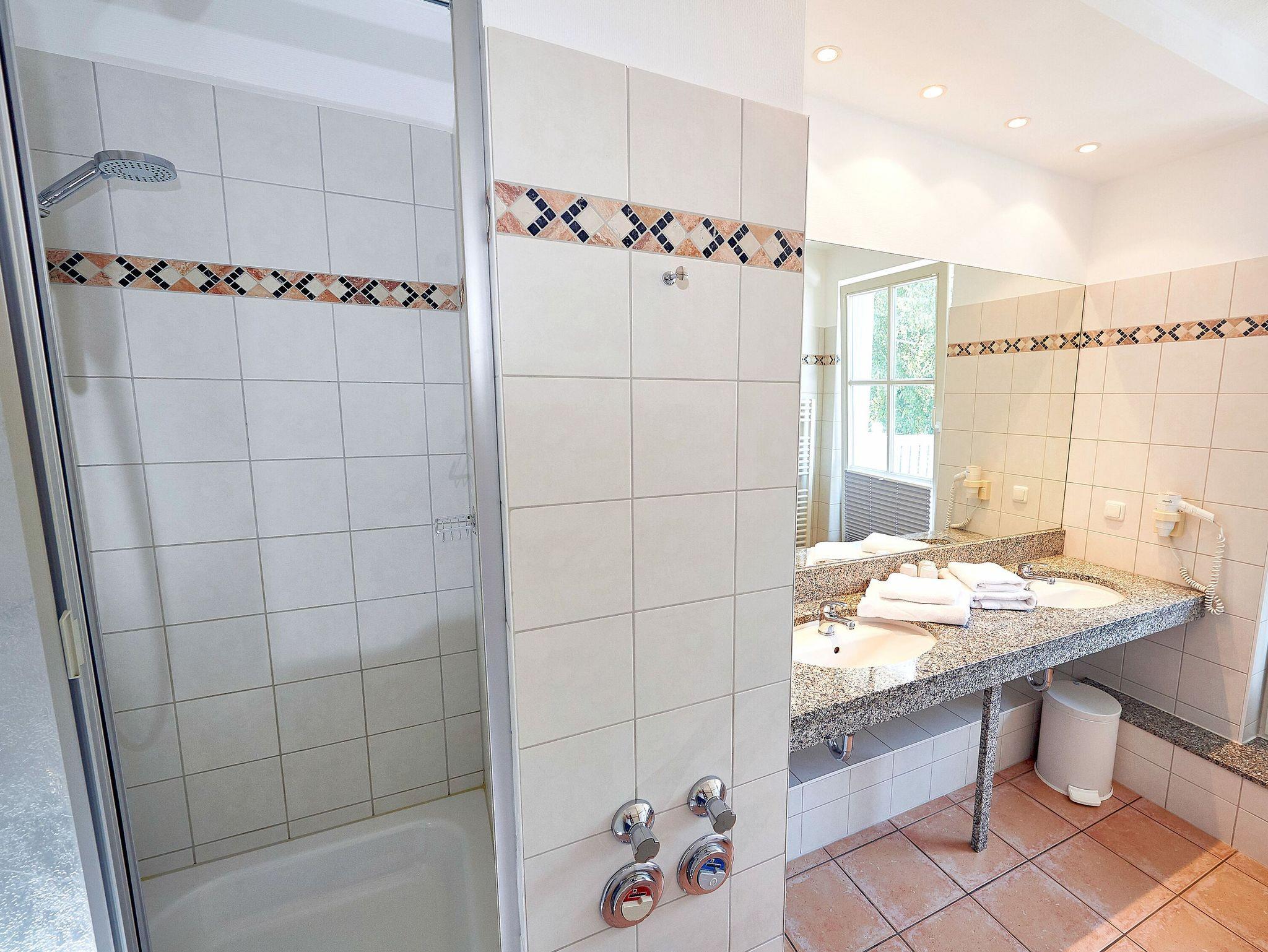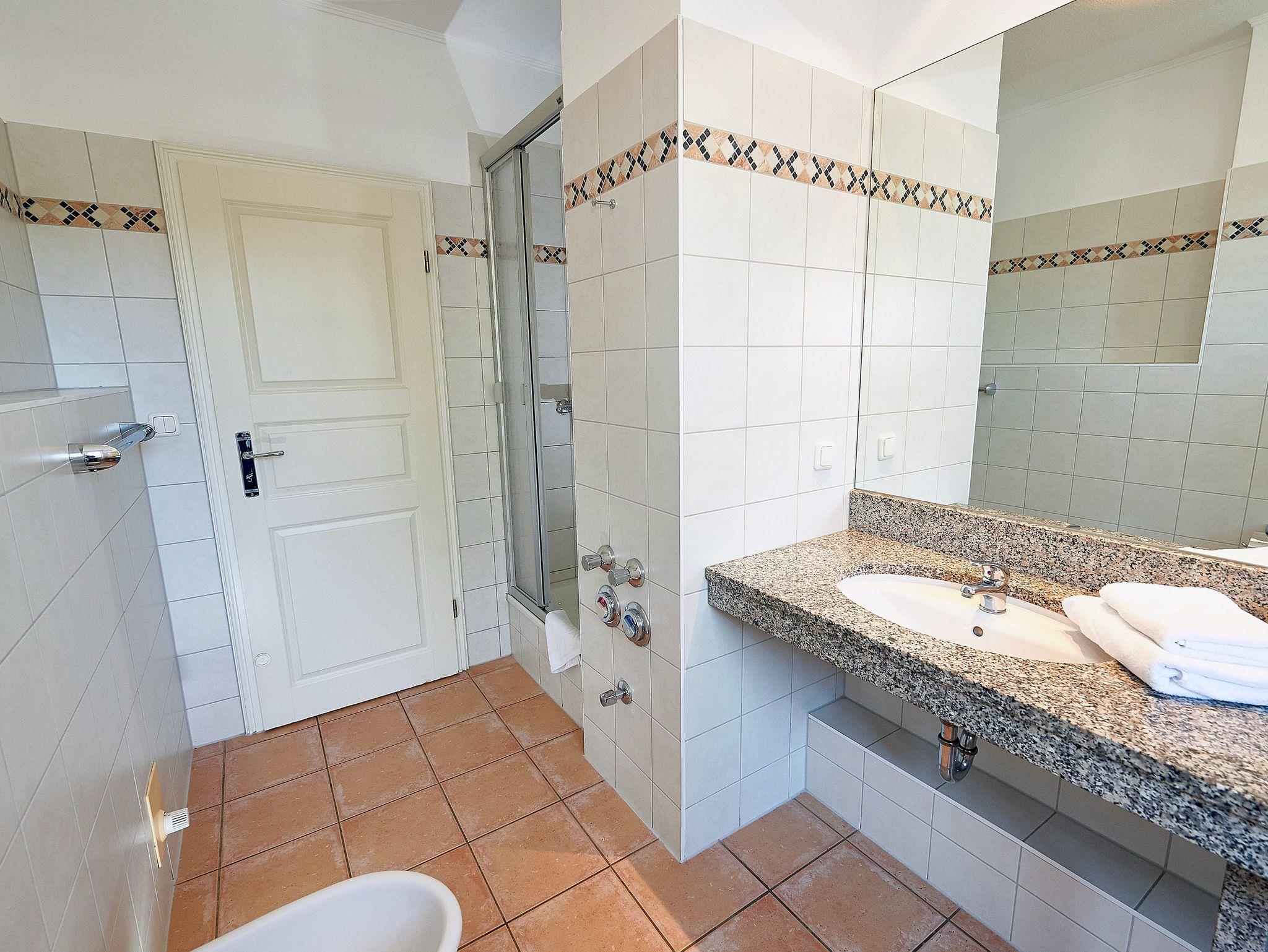 Das Appartement verfügt natürlich auch über ein modernes Badezimmer mit Fußbodenheizung. Dusche/WC und Bidet, ein beheizter Handtuchhalter, Fön sowie ein Granit-Doppelwaschtisch lassen keine Wünsche offen.