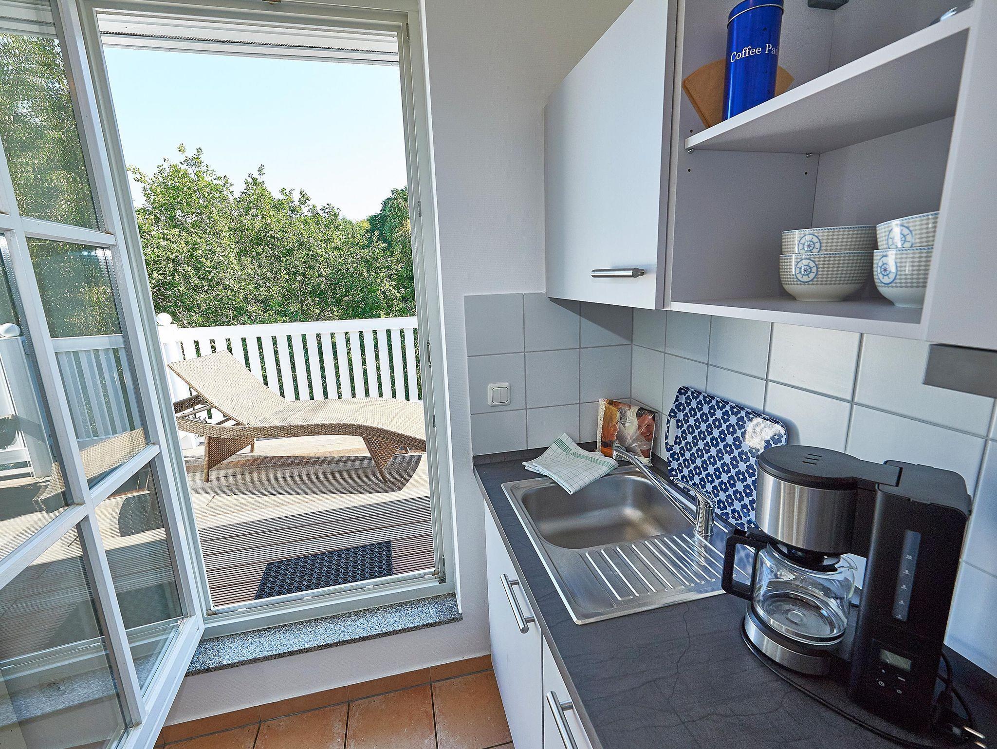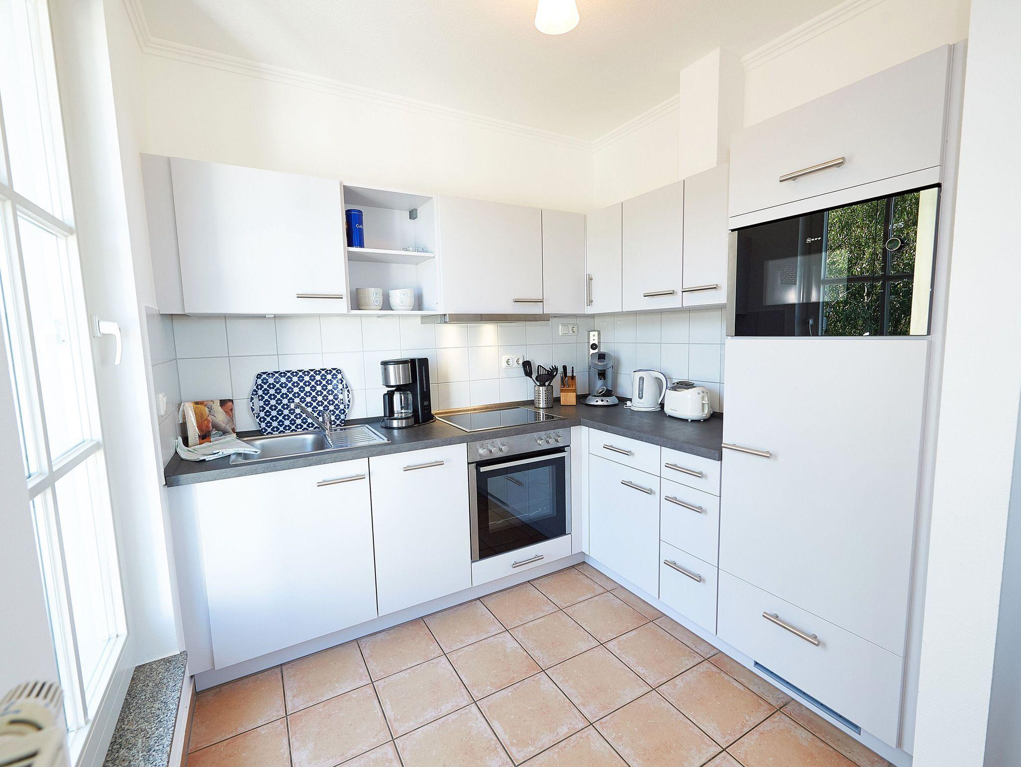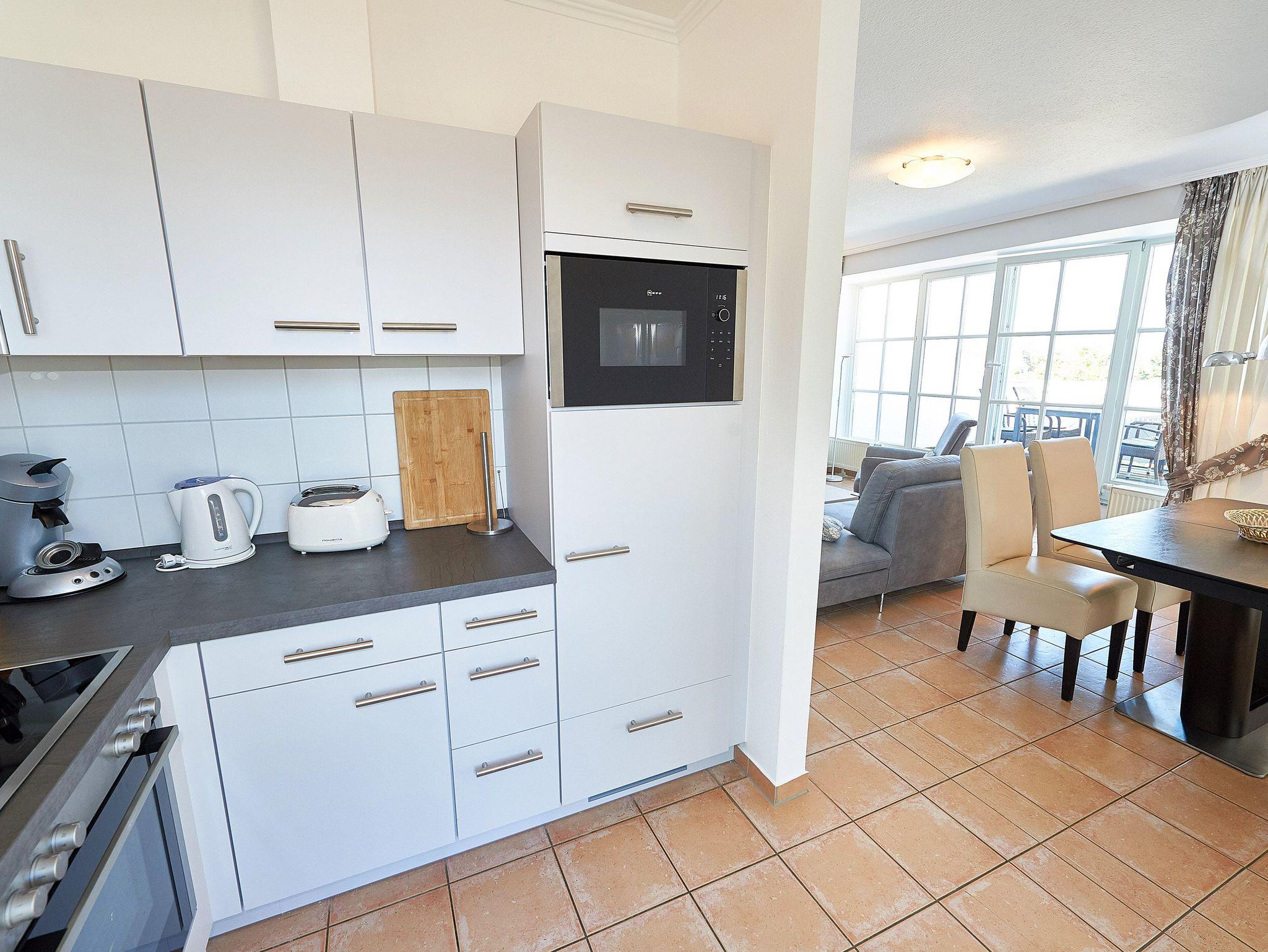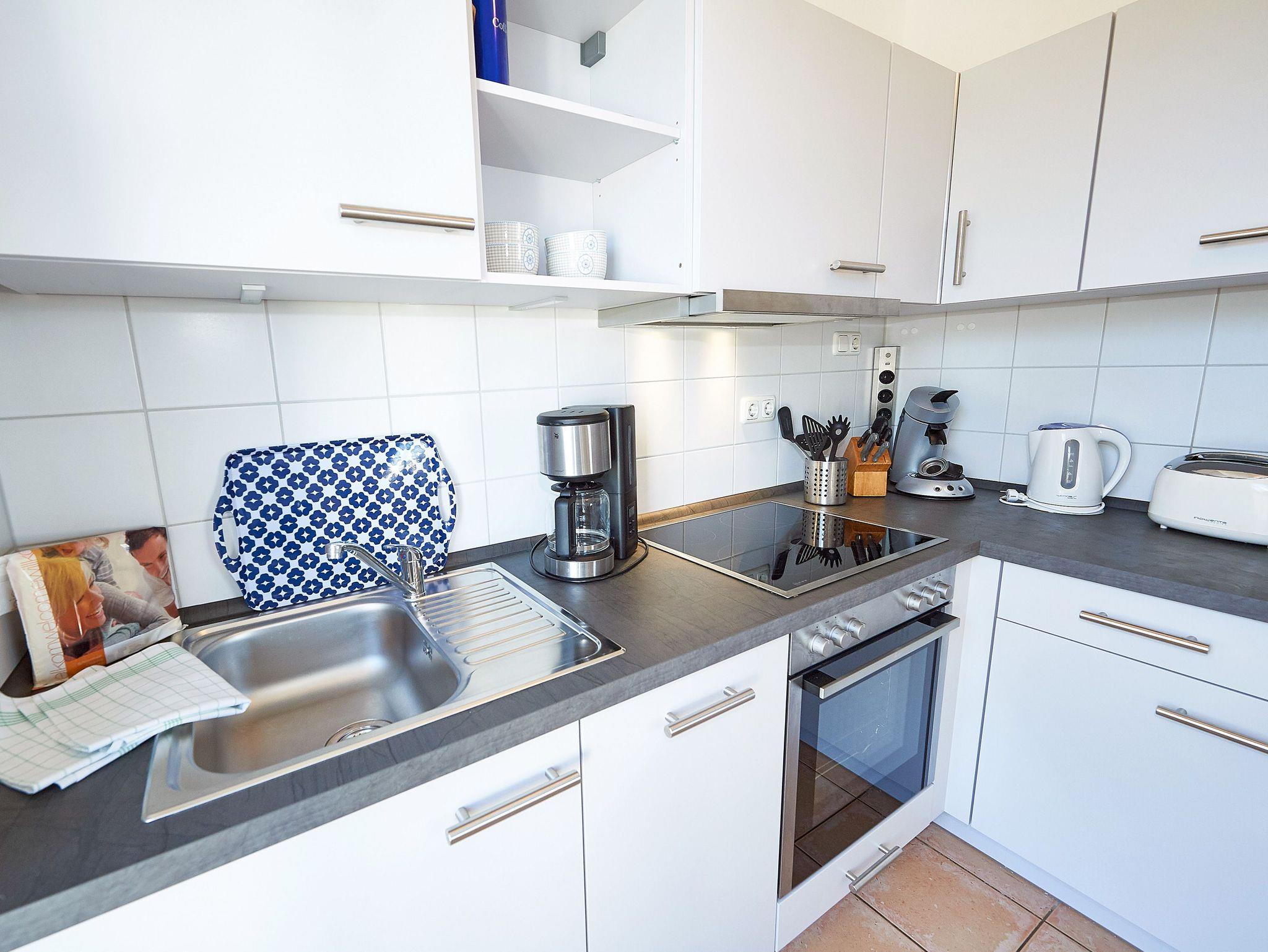 Die offene Wohnküche verfügt über einen Kühlschrank mit Gefrierfach, einen Backofen, ein 4-Zonen-Cerankochfeld, eine Mikrowelle, eine Spülmaschine und diverses Kleininventar, das die Küchenausstattung komplettiert.