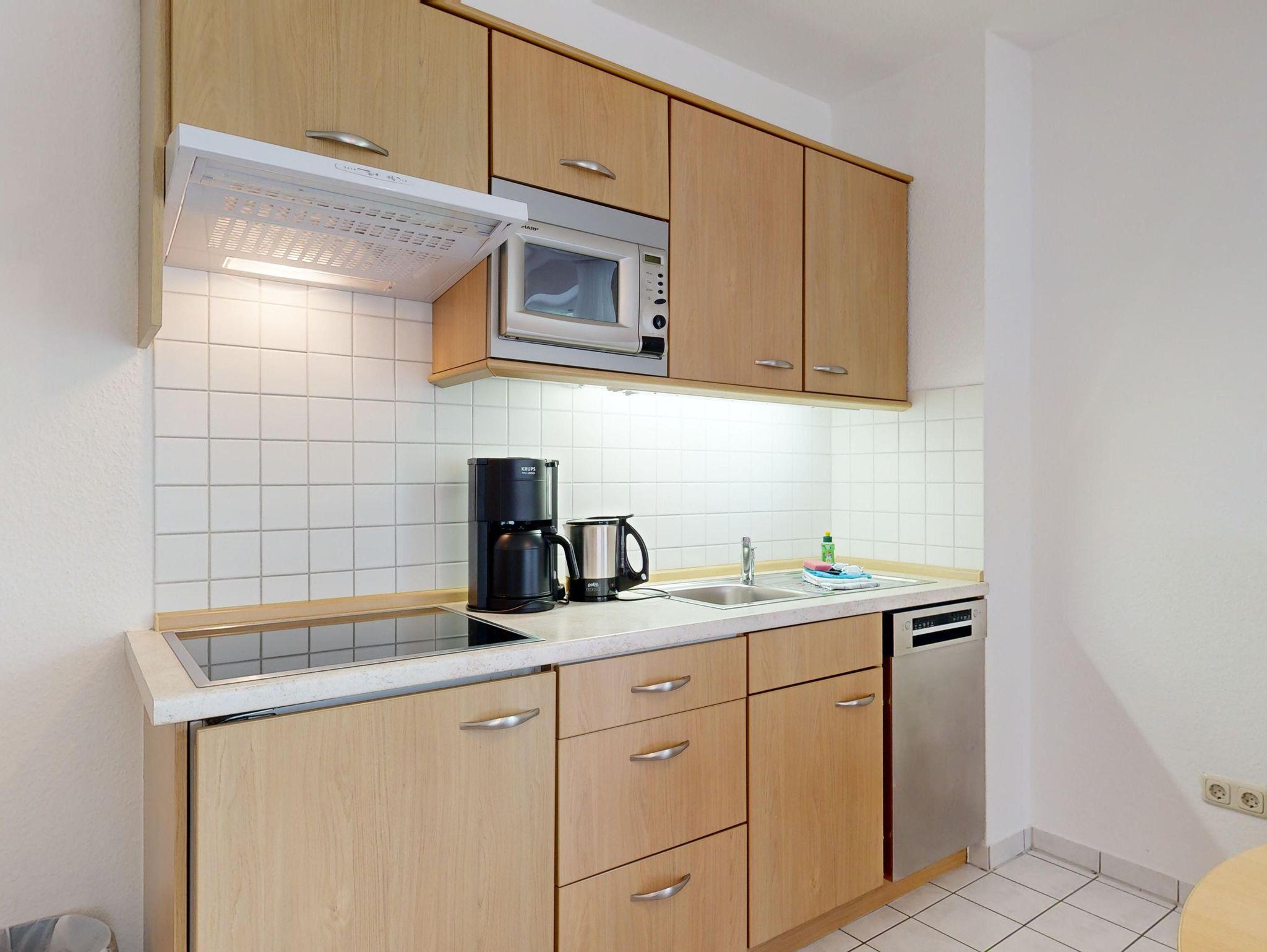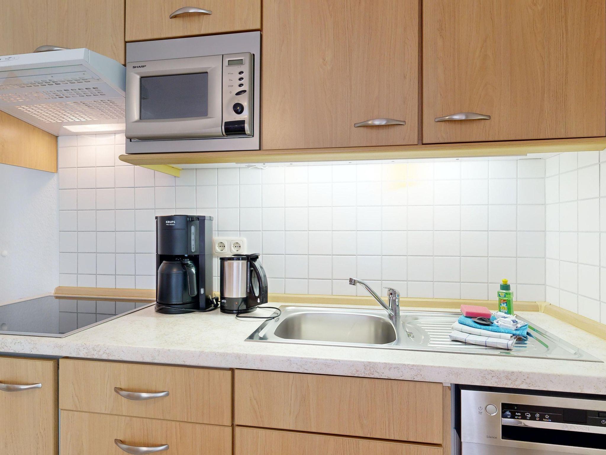 • Küchenzeile mit Spülmaschine, Ceranfeld, Mikrowelle, Kaffeemaschine, Toaster und Kühlschrank mit Gefrierfach