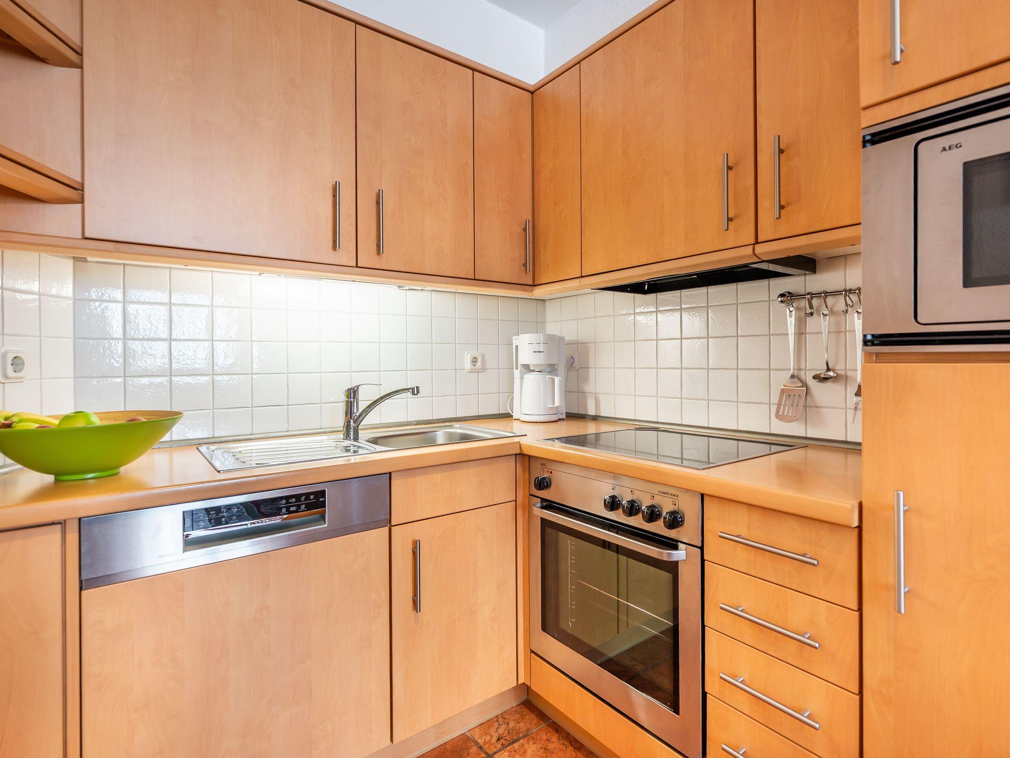 • Küche: Mikrowelle, Backofen, Geschirrspülmaschine, Kühlschrank mit Gefrierfach, Kaffeemaschine, Toaster und Wasserkocher
