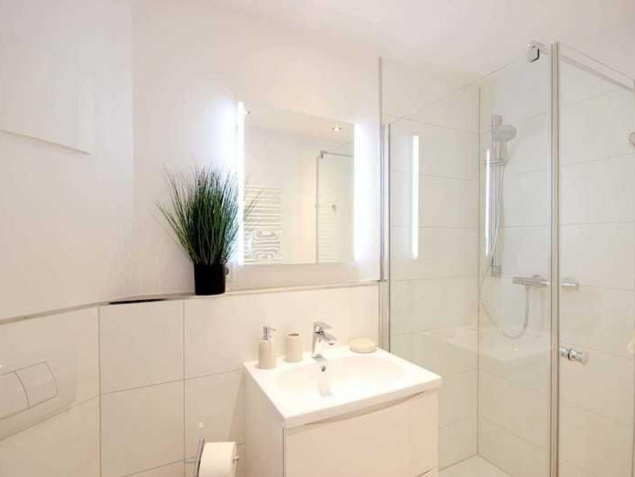 Das komplett sanierte Duschbad verfügt über Waschtisch, ebenerdige Dusche, Handtuchheiztrockner, Haartrockner und WC in Markenqualität. In der Wohnung befindet sich zusätzlich eine kleine Abstellkammer, die Ihnen genug Stauraum für Koffer oder Taschen bietet.