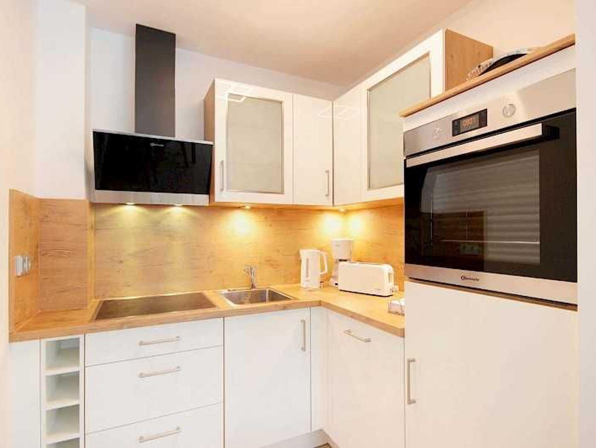 In der angrenzenden neuen Einbauküche finden Sie alle erforderlichen Kochutensilien. Ein Cerankochfeld, ein Backofen, ein Geschirrspüler und eine Kühl-/Gefrierkombination gehören ebenso zur Standardausstattung sowie der Essbereich mit einem 120 x 80 cm großem Tisch mit vier Stühlen.