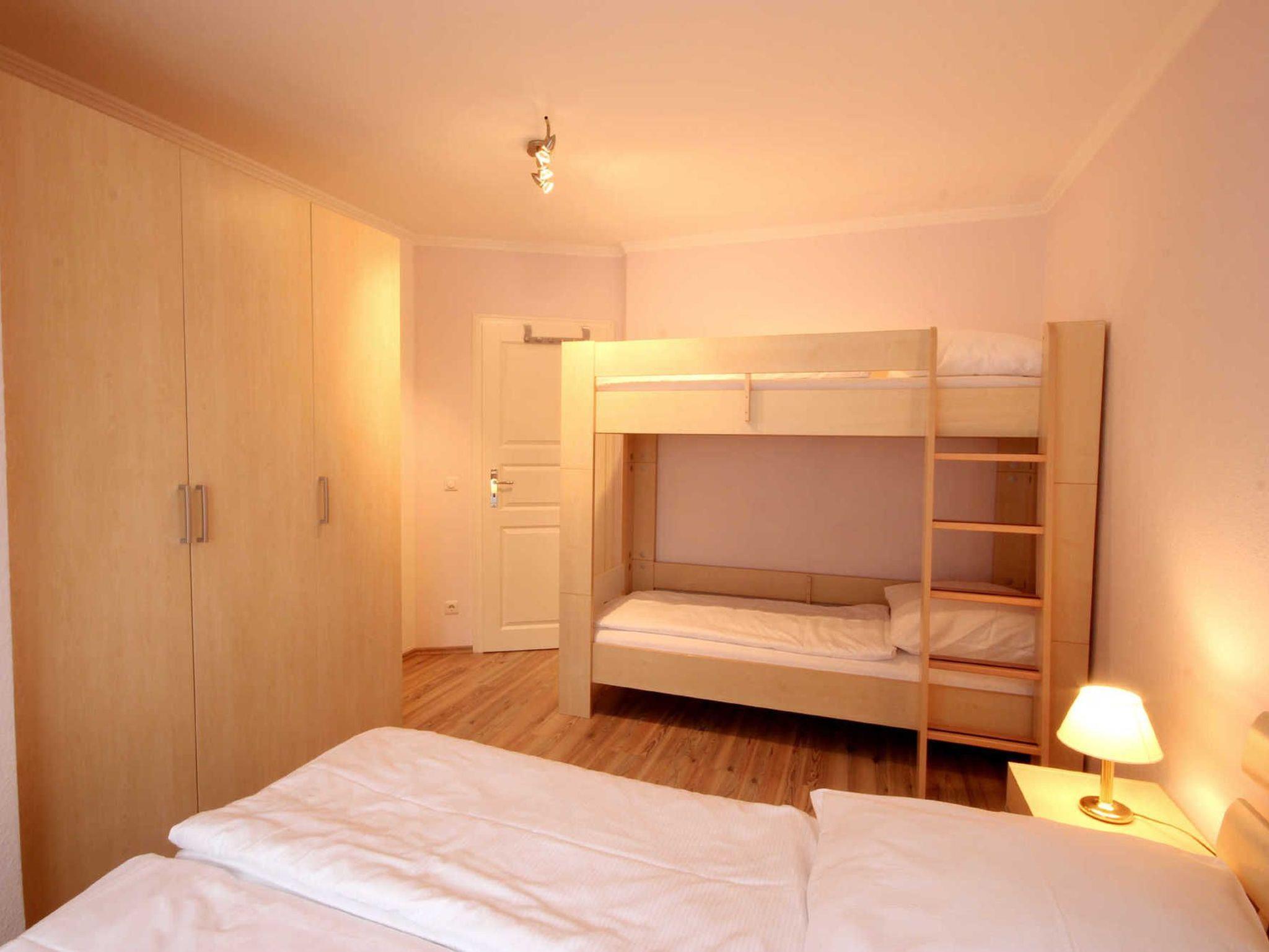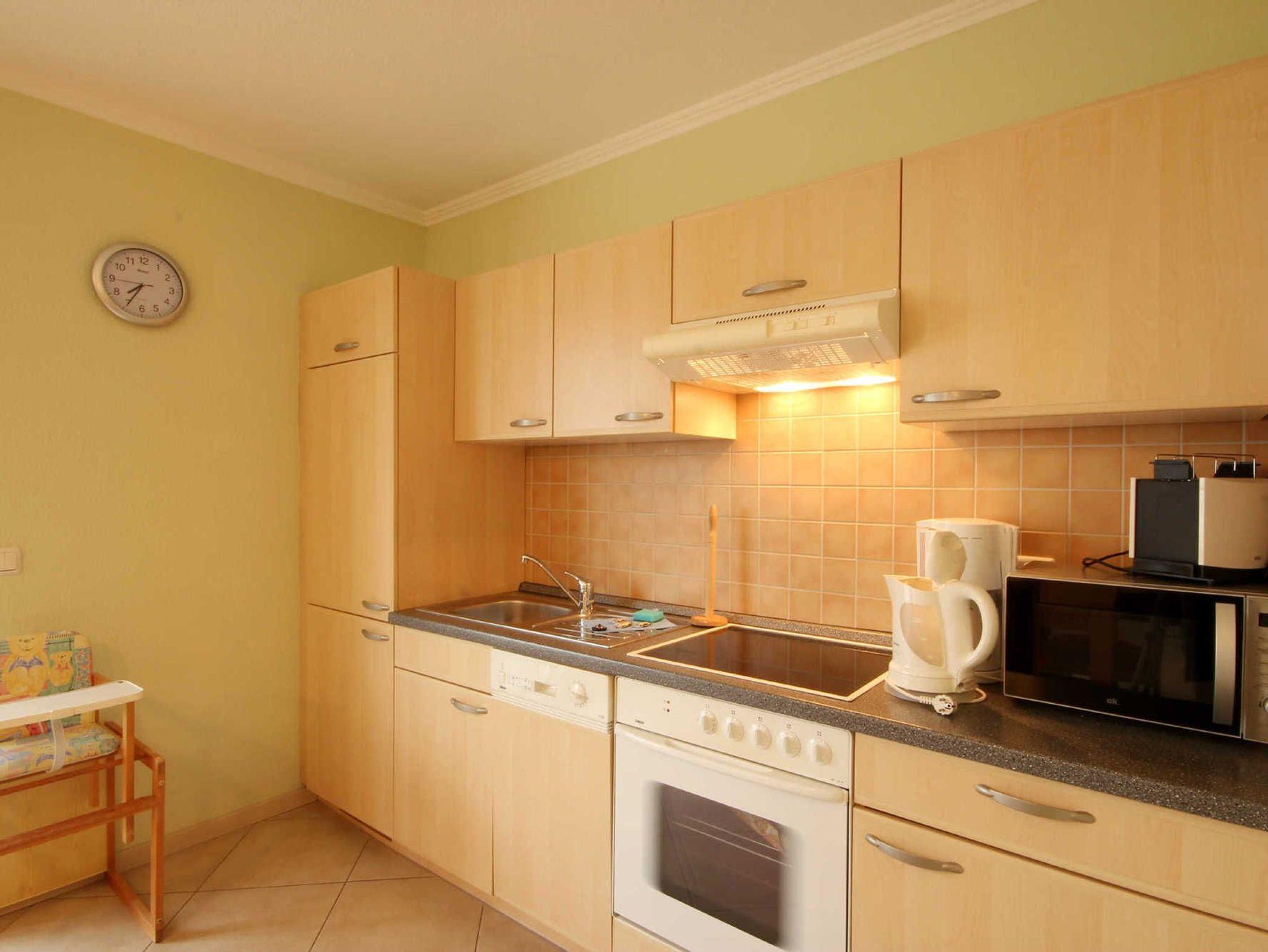 Neben dem gemütlichen Wohnraum mit integrierter Wohnküche gibt es einen Schlafraum sowie ein Badezimmer mit Eckbadewanne, Waschtisch und WC. Der Schlafraum ist mit einem französischen Doppelbett (Breite 140cm/durchgehende Matratze,, einem Doppelstockbett für die 3. und 4. Person sowie einem Kleiderschrank ausgestattet. Außerdem finden Sie im Wohnbereich neben der komfortablen Sitzecke mit TV, DVD-Player mit einer kleinen Auswahl an DVDs, auch einen separaten Essplatz. Die Küchenzeile verfügt über ein Ceranfeld, Backofen, Mikrowelle, Geschirrspüler, Kaffeemaschine, Toaster, Wasserkocher sowie weitere kleine Küchenhelfer. Von dem überdachten Balkon haben Sie einen schönen Blick in die Residenz mit gepflegter Gartenanlage. Ab sofort können alle unsere Gäste einen kostenfreien WLAN-Zugang nutzen.