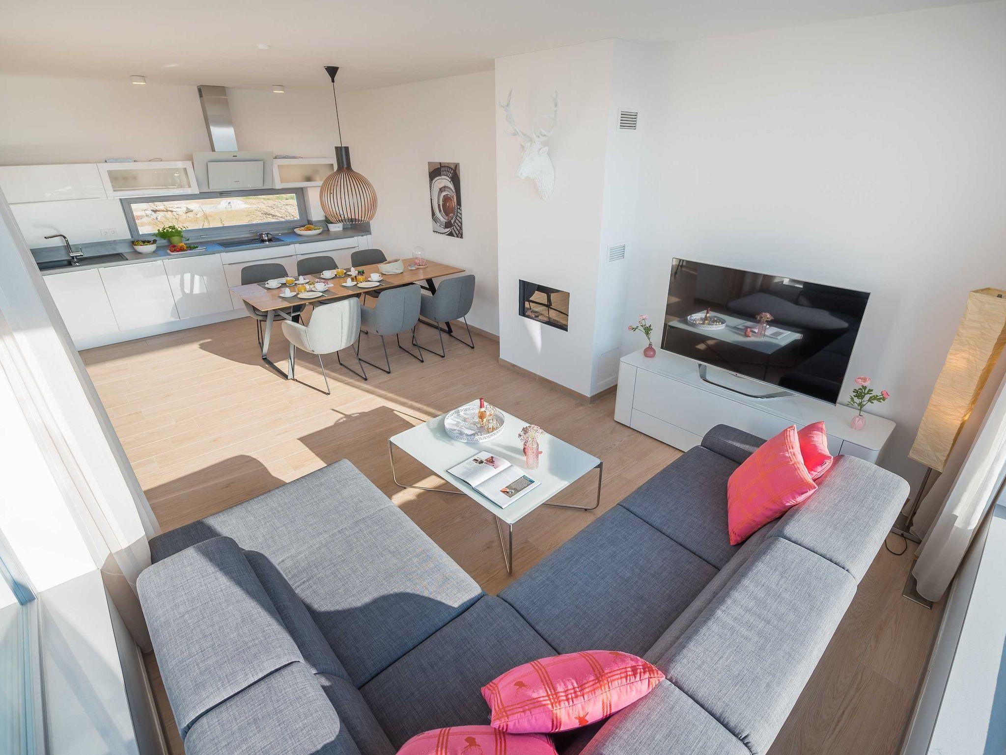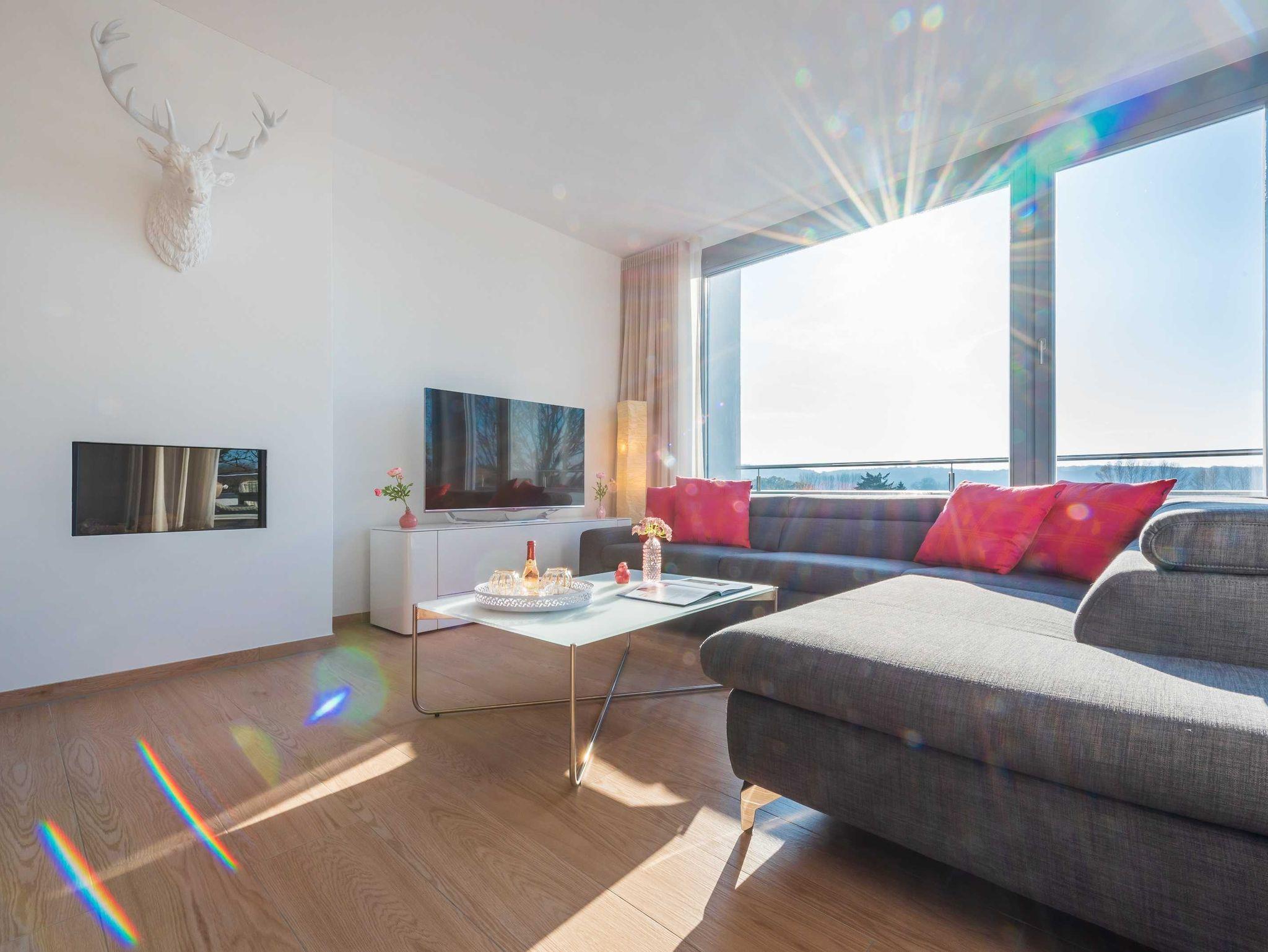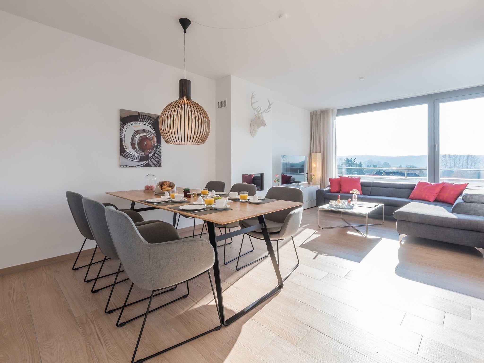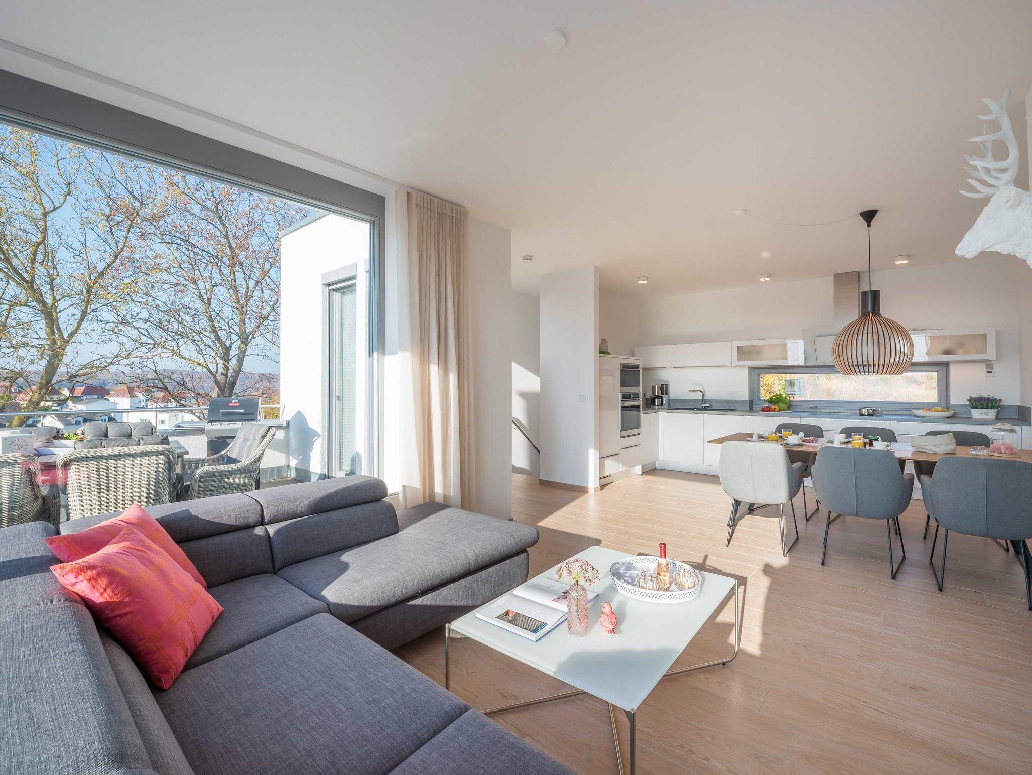 Wohnzimmer: Sehr großer und lichtdurchfluteter Wohnbereich mit gemütlicher große Eckcouchgarnitur, Kabel-TV, großer Esstisch für 6 Personen, sehr große Fensterfront zum südlich ausgerichteten Balkon