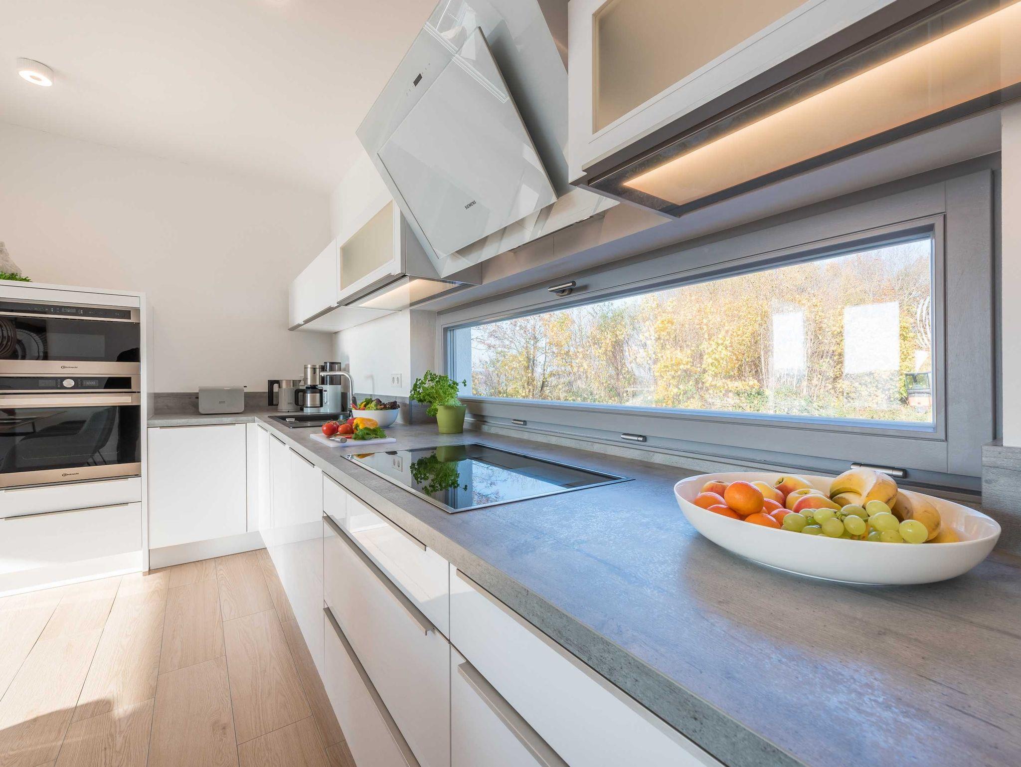 offener Küchenbereich mit modernster Ausstattung: Spülmaschine, Ceranfeld, großer Kühlschrank mit Gefrierfach, Mikrowelle, Backofen, Toaster, Kaffeemaschine, Wasserkocher