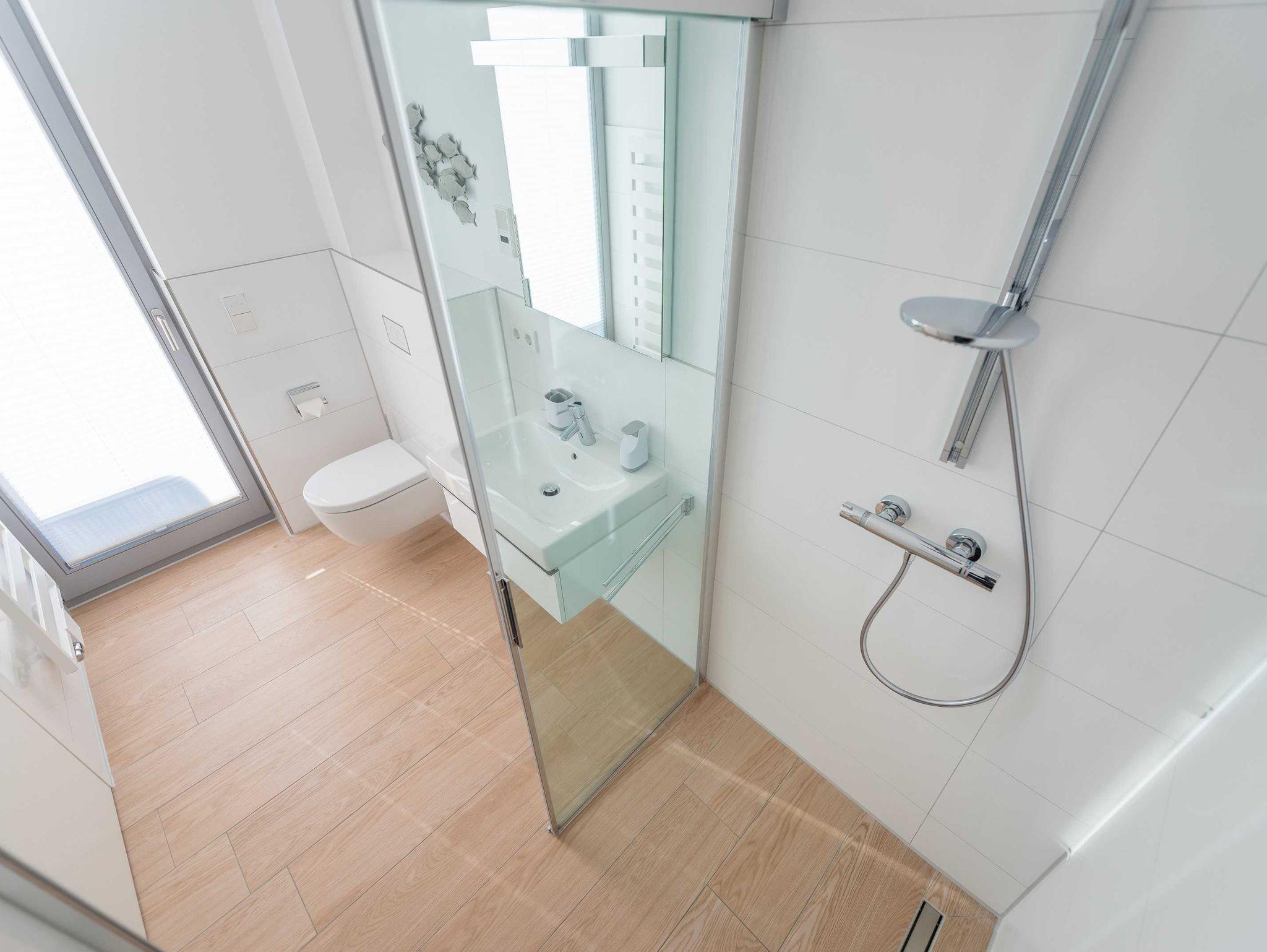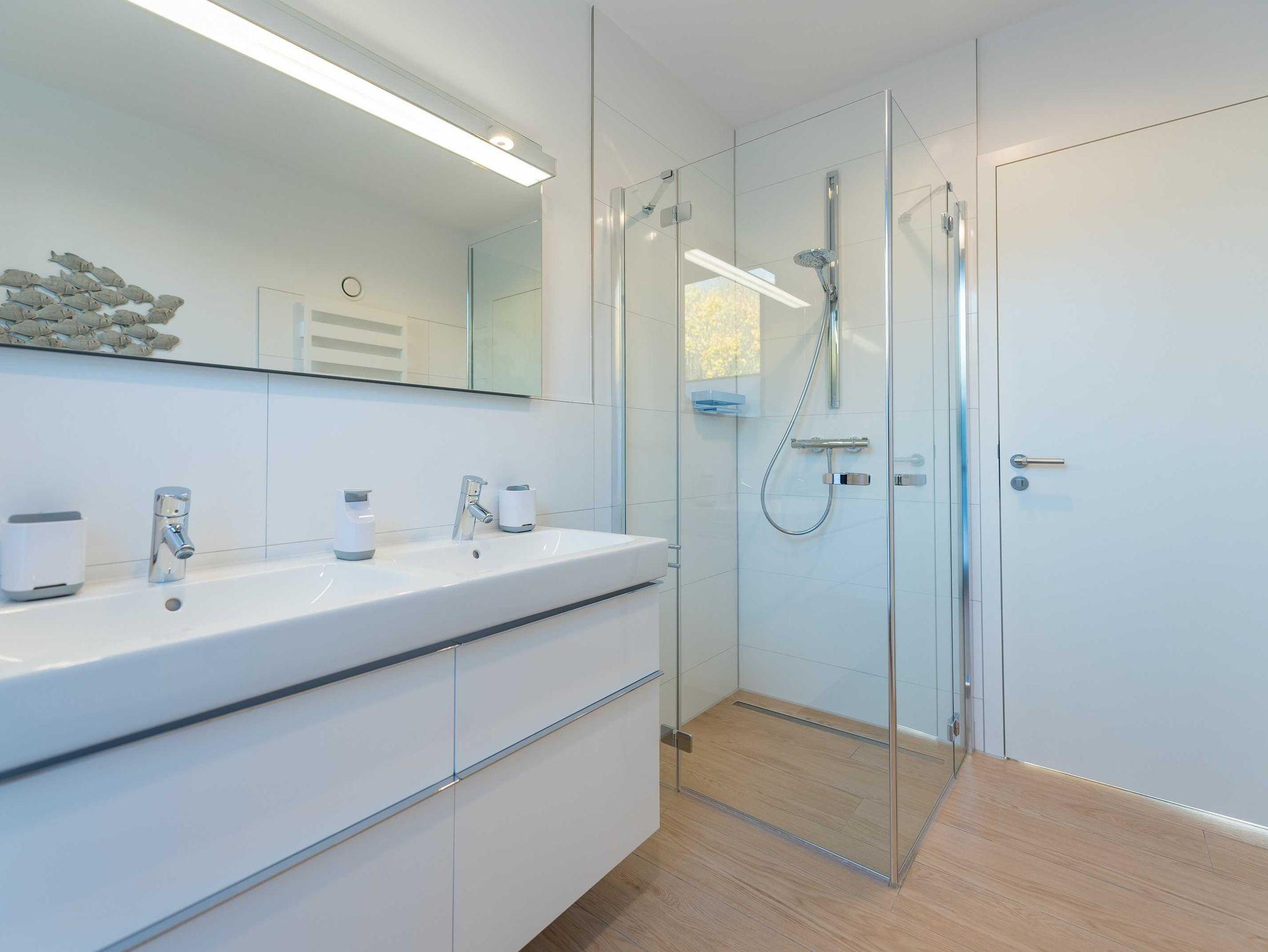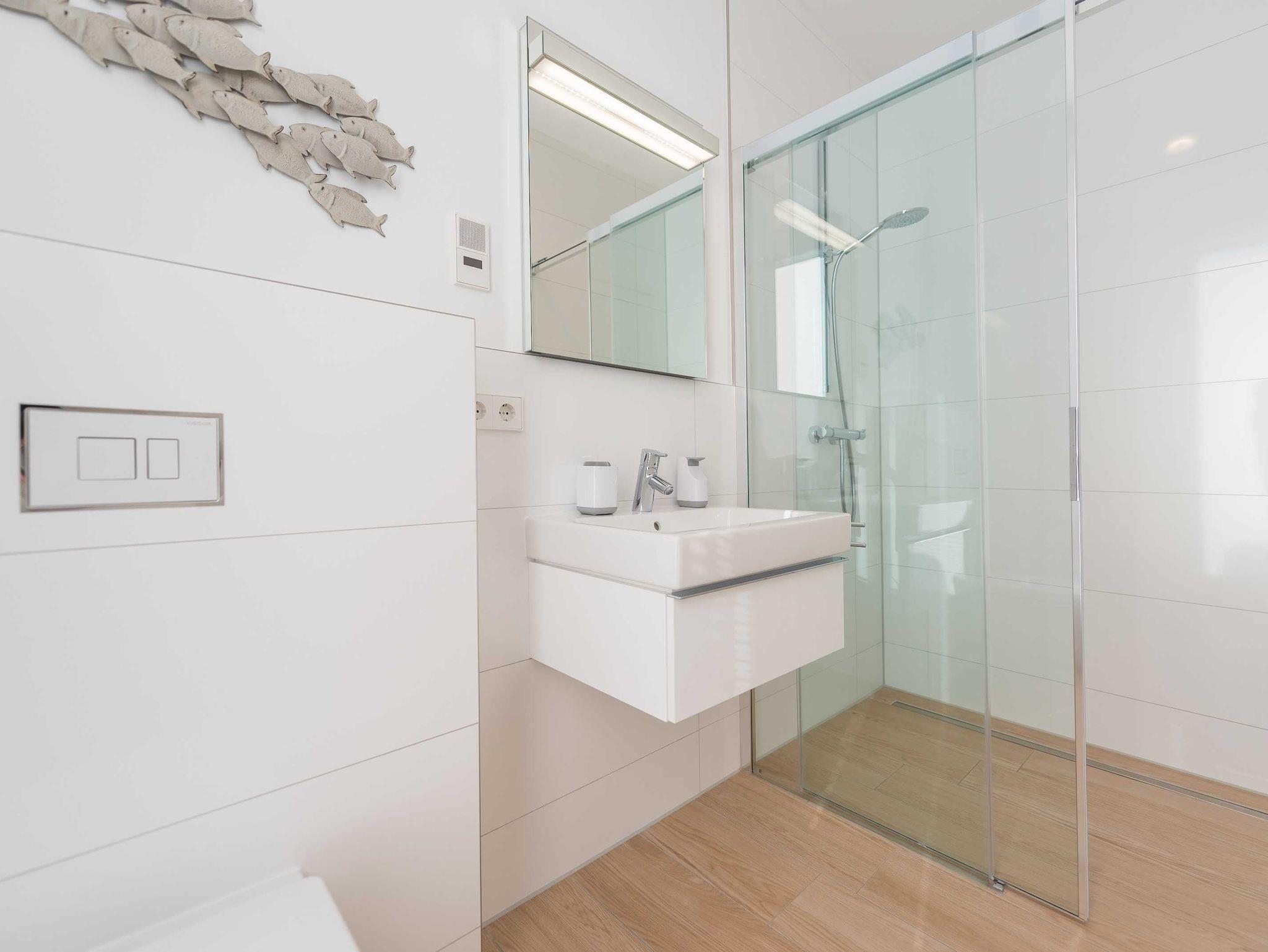 1 Badezimmer mit großzügiger Dusche (ebenerdiger Eintritt), WC, Föhn