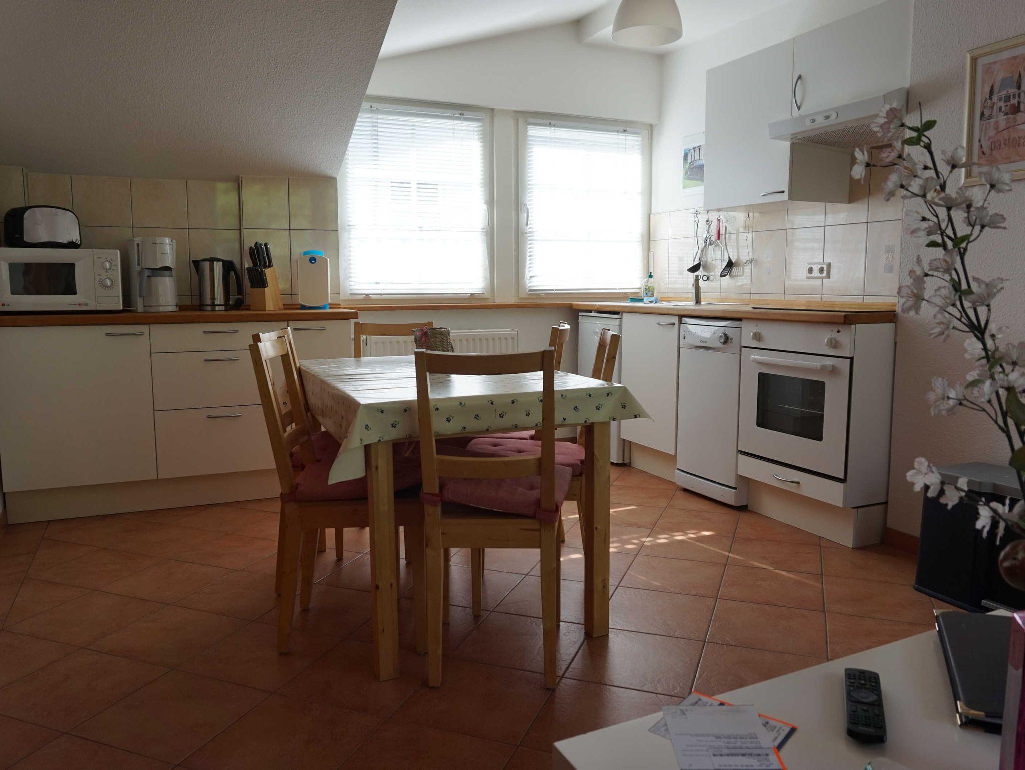 1Schlafzimmer mit 2 Einzelbetten (0,9x2,0m), Wohnküche (22 m²) als Durchgangszimmer mit Auszieh-Eckcouch für 2 Pers. (1,5x2,0 m) TV,Stereo mit CD u. MP3. Küchenzeile mit Kühlschrank, Geschirrspüler, Cerankochfeld, Backofen, Spüle, Wasserkocher,