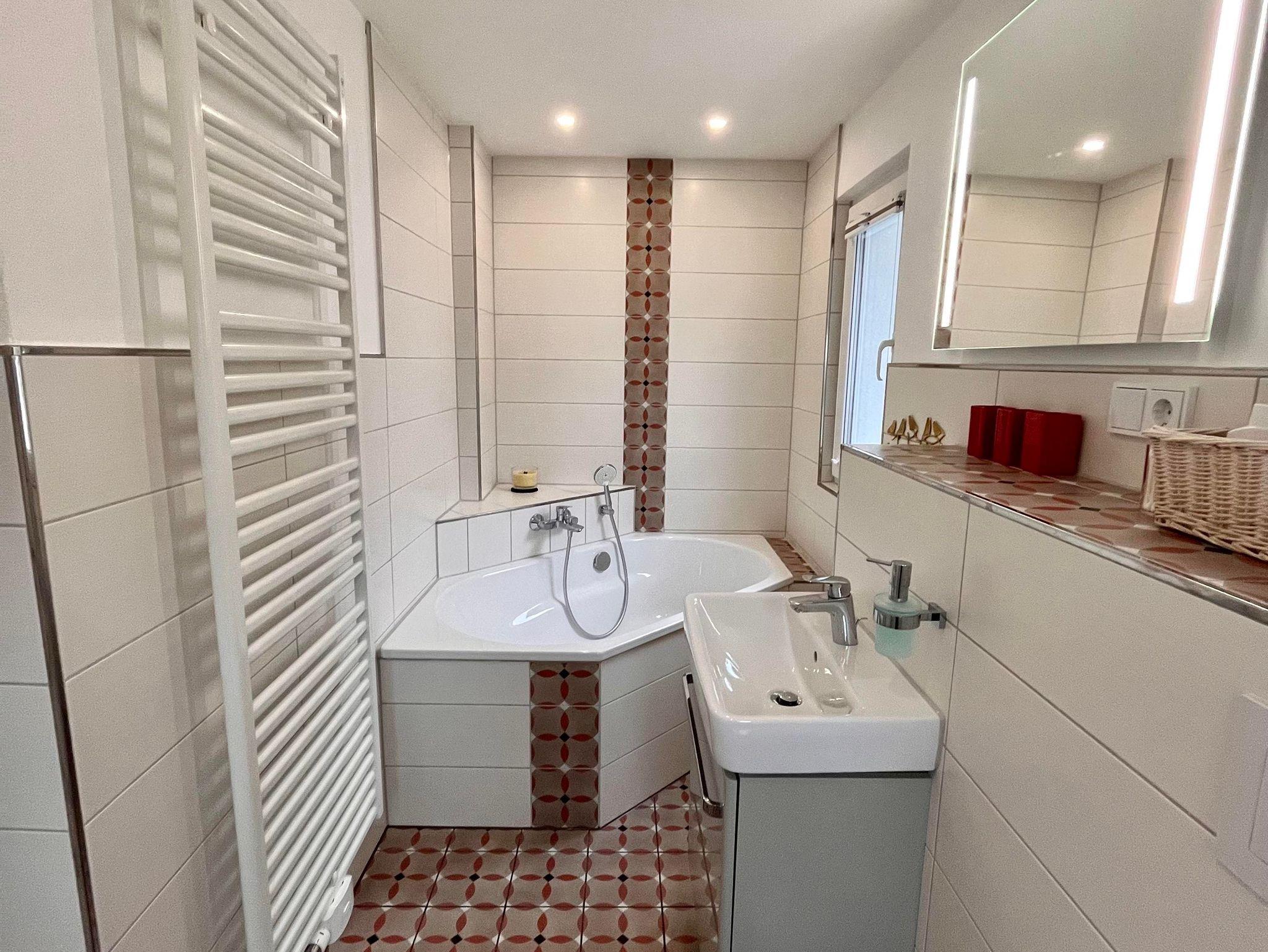 Beide Schlafzimmer haben jeweils ein angrenzendes Badezimmer verfügen. Eins mit Badewanne und das andere mit einer Dusche und Infrarot-Sauna. Diese bietet gerade zur kalten Jahreszeit durch ihre wohlige Wärme eine angenehme Tiefenentspannung und fördert das allgemeine Wohlbefinden.