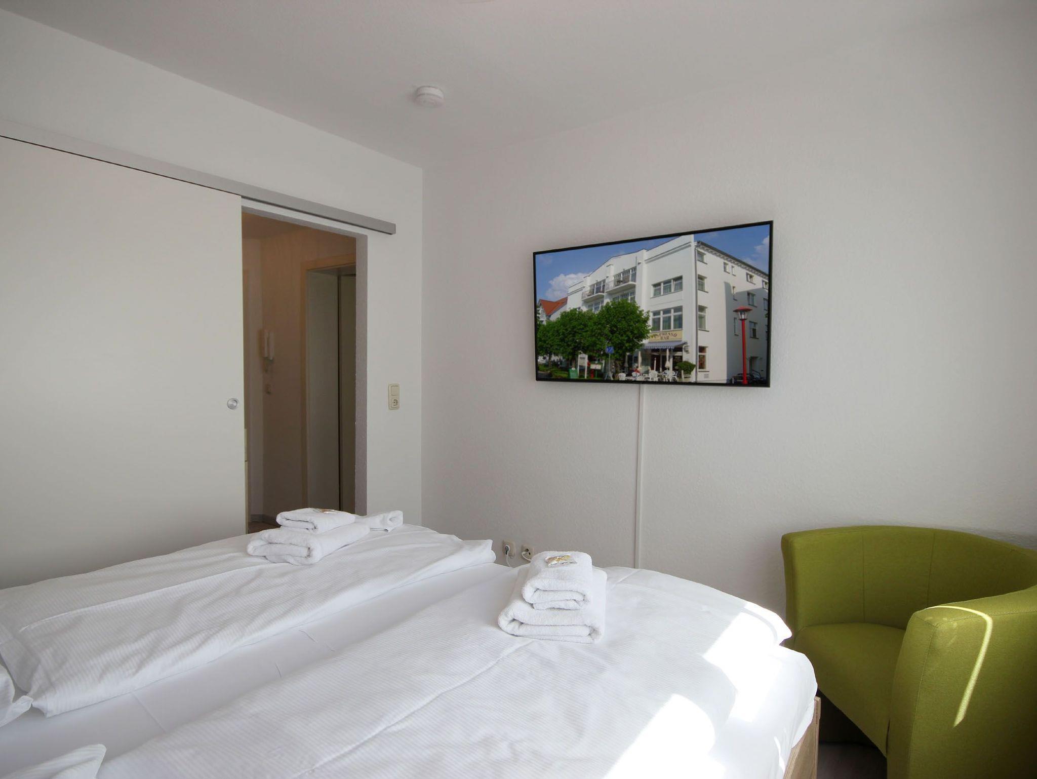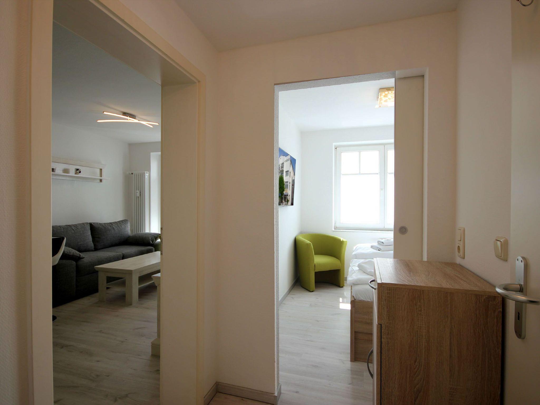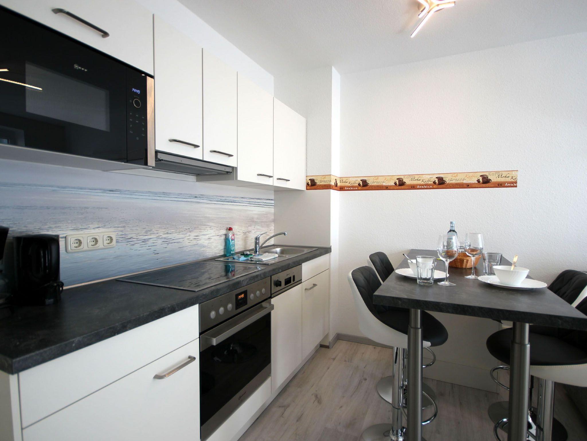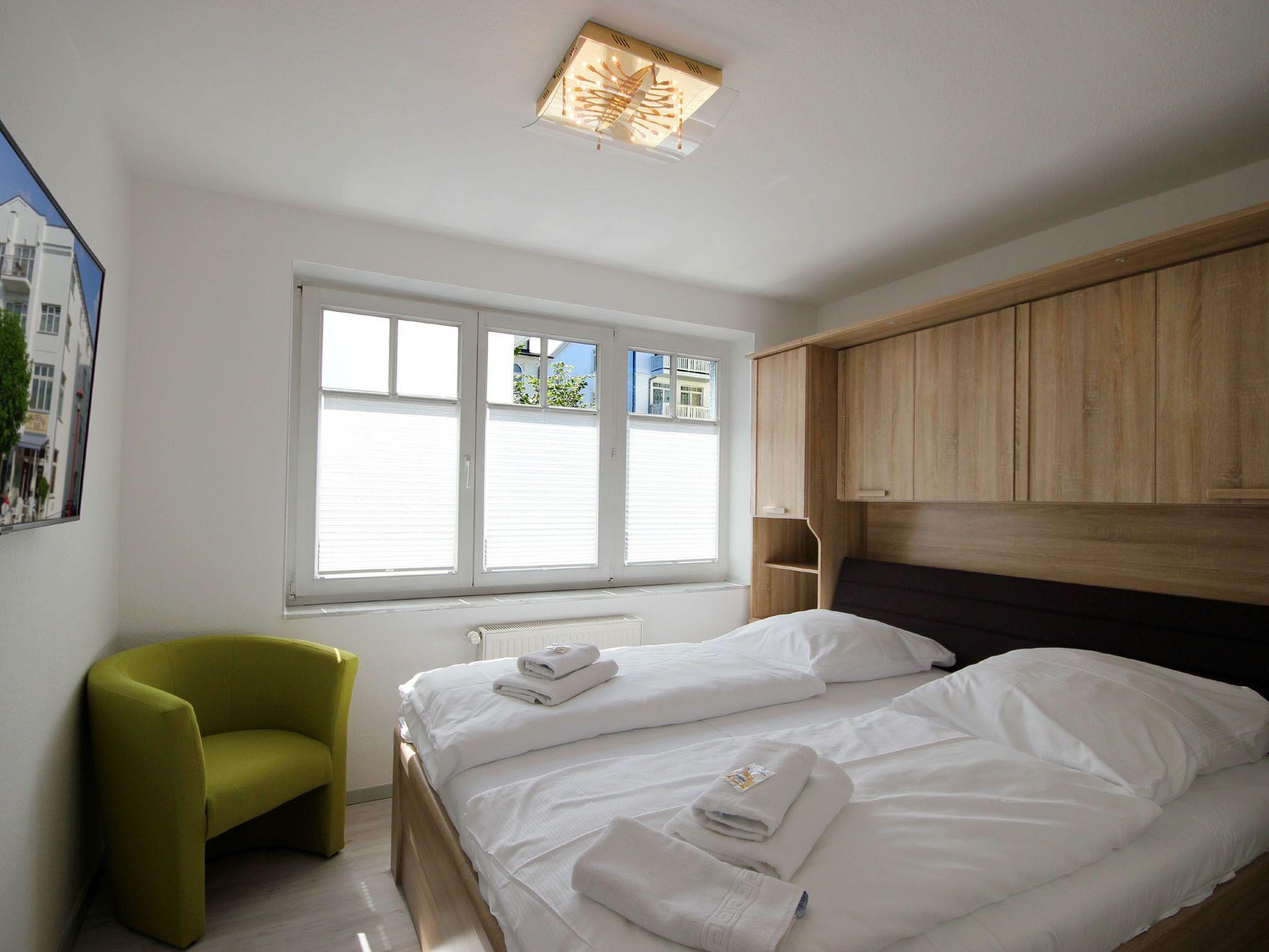 Ihre attraktive 2-Zimmerwohnung 23RB7 hat eine Größe von ca. 38 qm und ist für 4 Personen eingerichtet. Sie befindet sich im Hochparterre und verfügt über einen möblierten Balkon. Dem hellen Wohnraum schließt sich die moderne Wohnküche und der Essbereich an. Im separaten Schlafraum finden Sie ein modernes Doppelbett mit Überbau als zusätzlichen Stauraum sowie einen großen Flachbild-TV. Vom vorgelagerten Flur aus erreichen Sie das Badezimmer mit Waschtisch, Dusche, WC und Fön. Im Wohnraum erwartet Sie eine gemütliche Sitzecke mit Schlaffunktion für die 3. und 4. Person, kostenfreies WLAN sowie einen weiteren Flachbildfernseher. Die Küchenzeile verfügt über einen Backofen, Cerankochfeld, eine Mikrowelle, Kühlschrank, Geschirrspüler, Kaffeemaschine, Toaster und Wasserkocher. Ein kostenloser PKW-Stellplatz steht Ihnen auf dem Parkplatz Zentrum (ca. 400 m vom Objekt entfernt) während Ihres Aufenthaltes zur Verfügung.