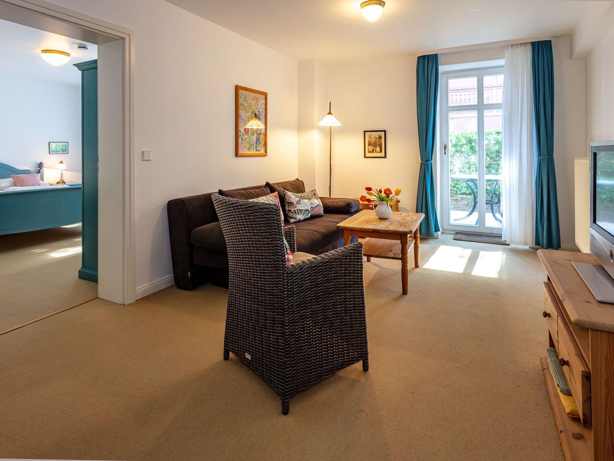 Die Wohnung 4 liegt im Erdgeschoss der historischen Villa Ruscha. Sie hat eine seitliche Terrasse sowie Gartenblick. Insgesamt befinden sich 13 Ferienwohnungen in der Villa Ruscha.