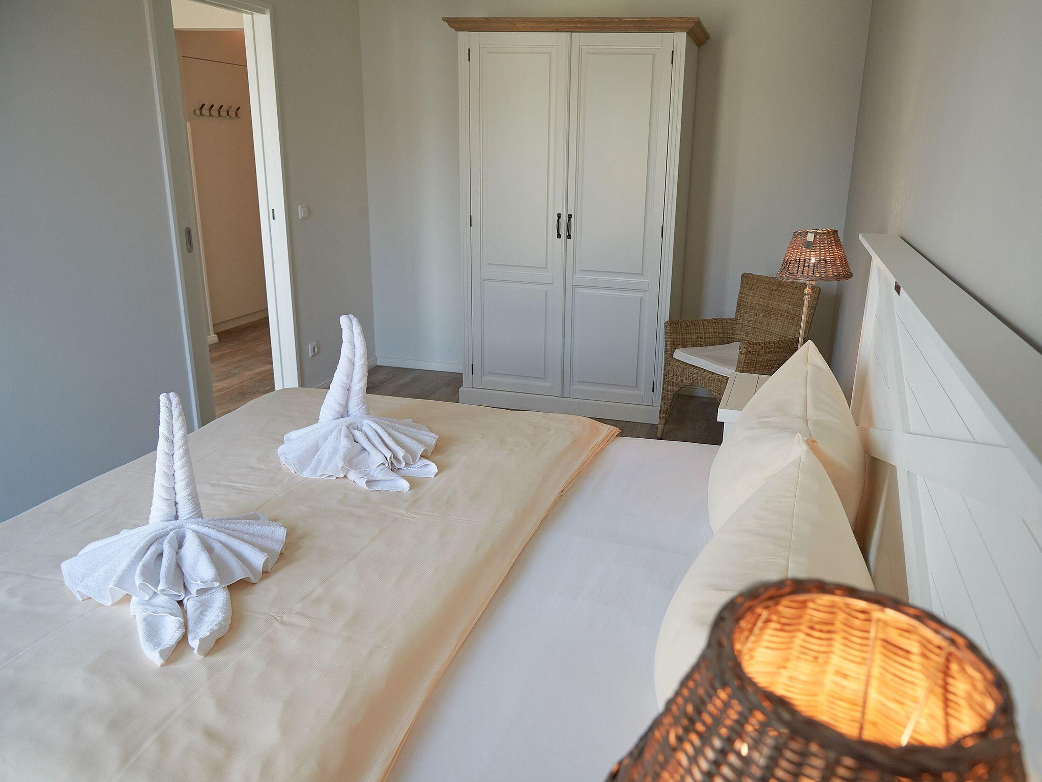 Während im Schlafzimmer mit seinem komfortablen Doppelbett (180 x 200 cm) ein großer Kleiderschrank das Stauraum-Angebot aus dem Flur ergänzt, überzeugt das schön geflieste Badezimmer mit einer geräumigen Dusche, einem beheizbaren Handtuchtrockner, einem beleuchteten Waschtisch sowie Fön und WC.