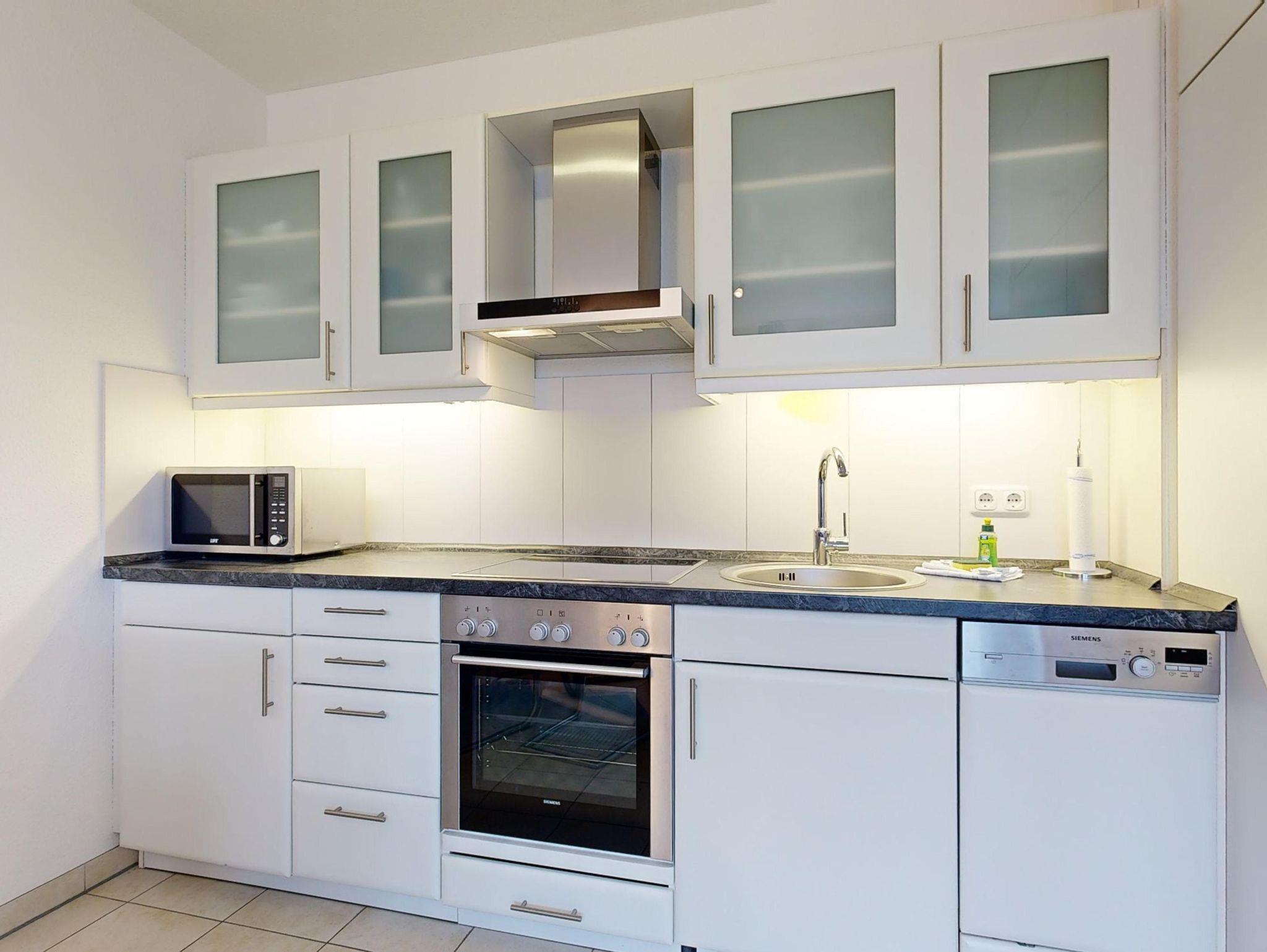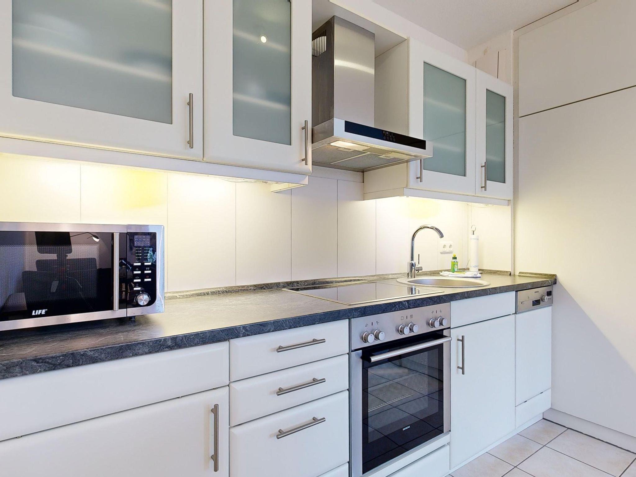 Küche mit Ceranfeld, Kühlschrank mit Gefrierfach, Backofen, Spülmaschine, Toaster, Wasserkocher, Kaffeemaschine