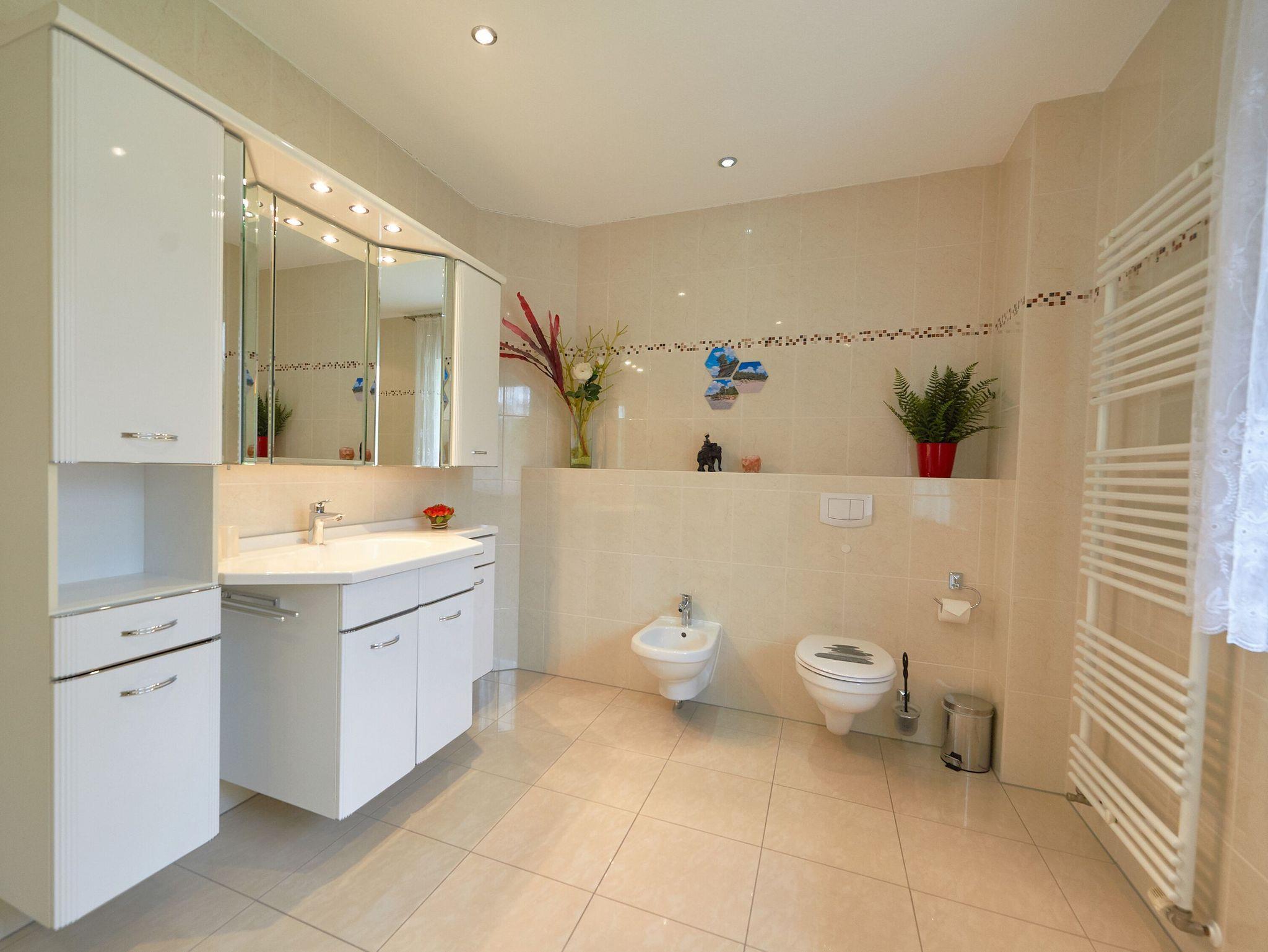 Das große Badezimmer Ihres Urlaubsdomizils ist mit einer ebenerdigen Dusche, einer Eck-Badewanne, einem Waschbecken und einem WC sowie Bidet eingerichtet. Zusätzlich gibt es ein zweites WC, wo Ihnen auch eine Waschmaschine, ein Wäschetrockner sowie Bügelutensilien zur Verfügung stehen.