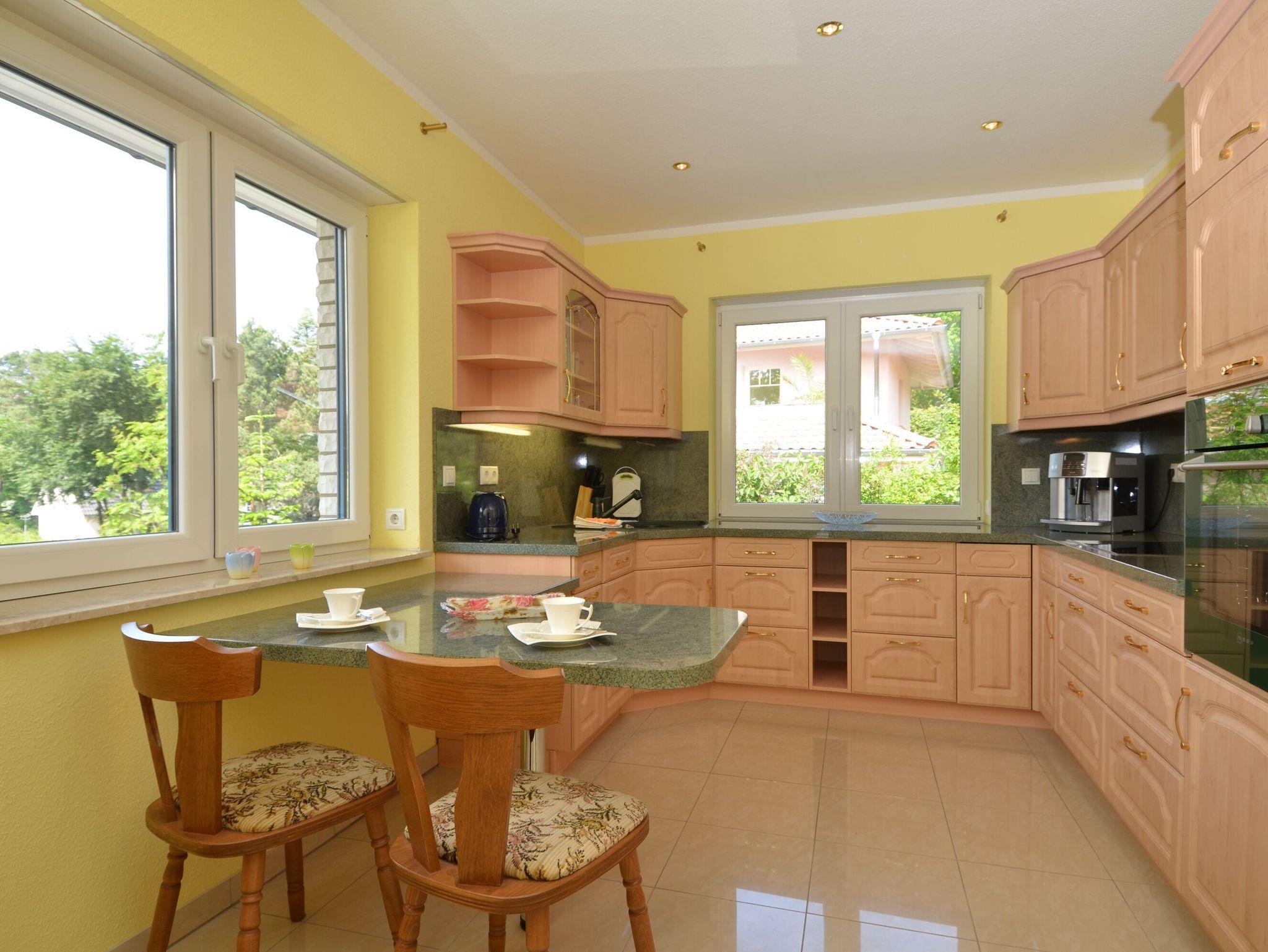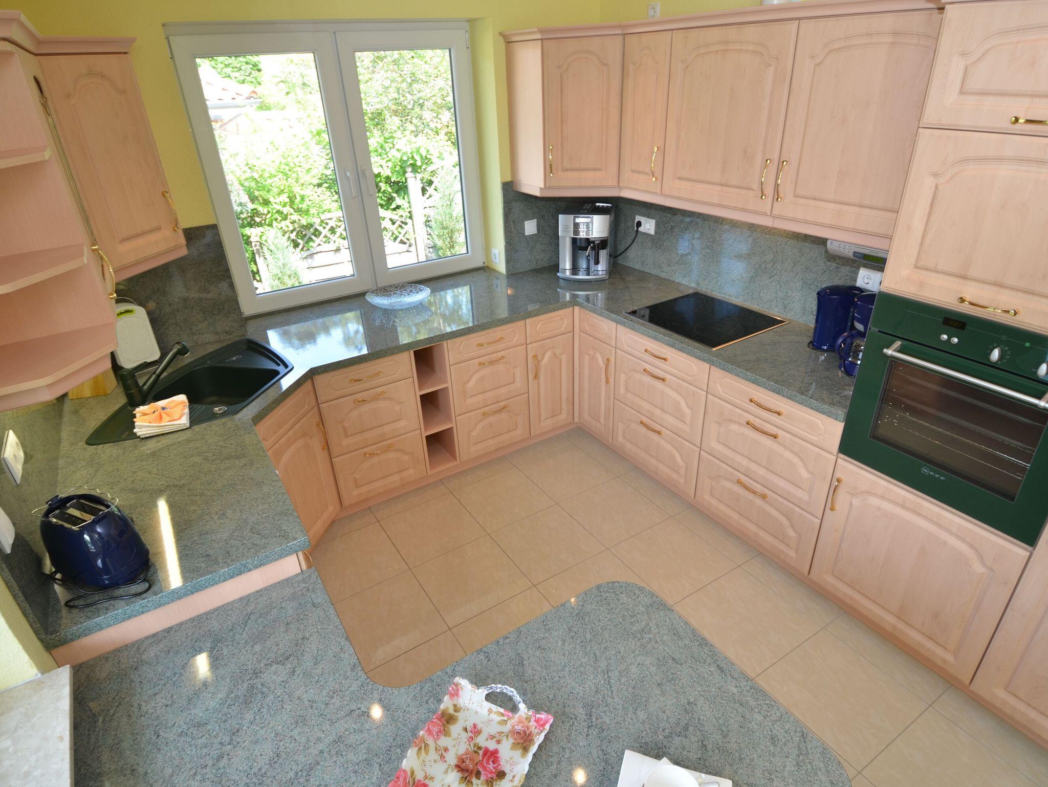 Die separate Küche ist modern eingerichtet mit einem 4-Zonen-Cerankochfeld, einem Backofen, einer Geschirrspülmaschine, einem Kühlschrank, einem Delonghi-Kaffeeautomaten, einem Wasserkocher, einem Toaster und diversem Kleininventar, welches die gute Ausstattung komplettiert. Ein kleiner Tisch mit zwei Stühlen steht für den morgendlichen Kaffee bereit.