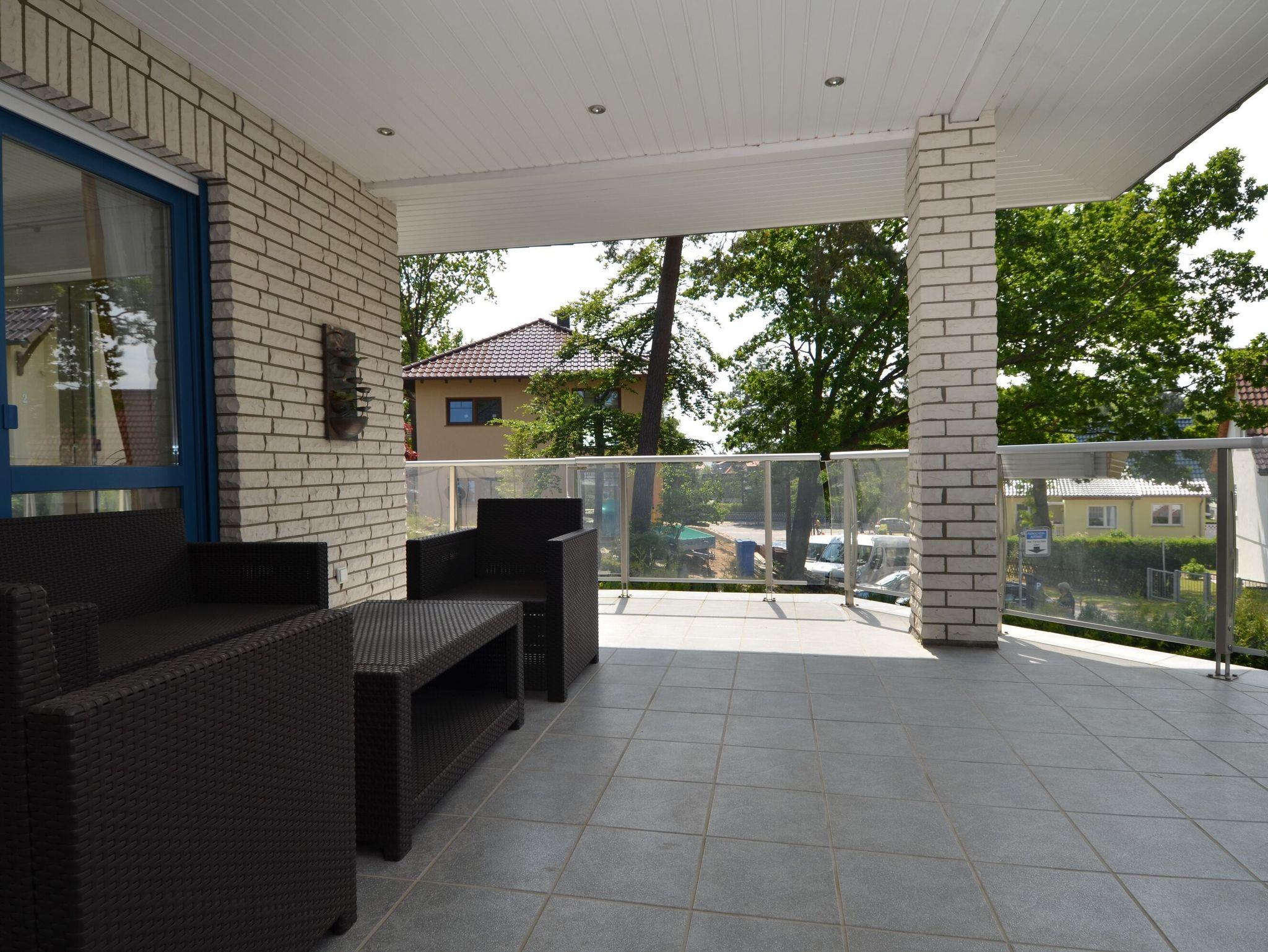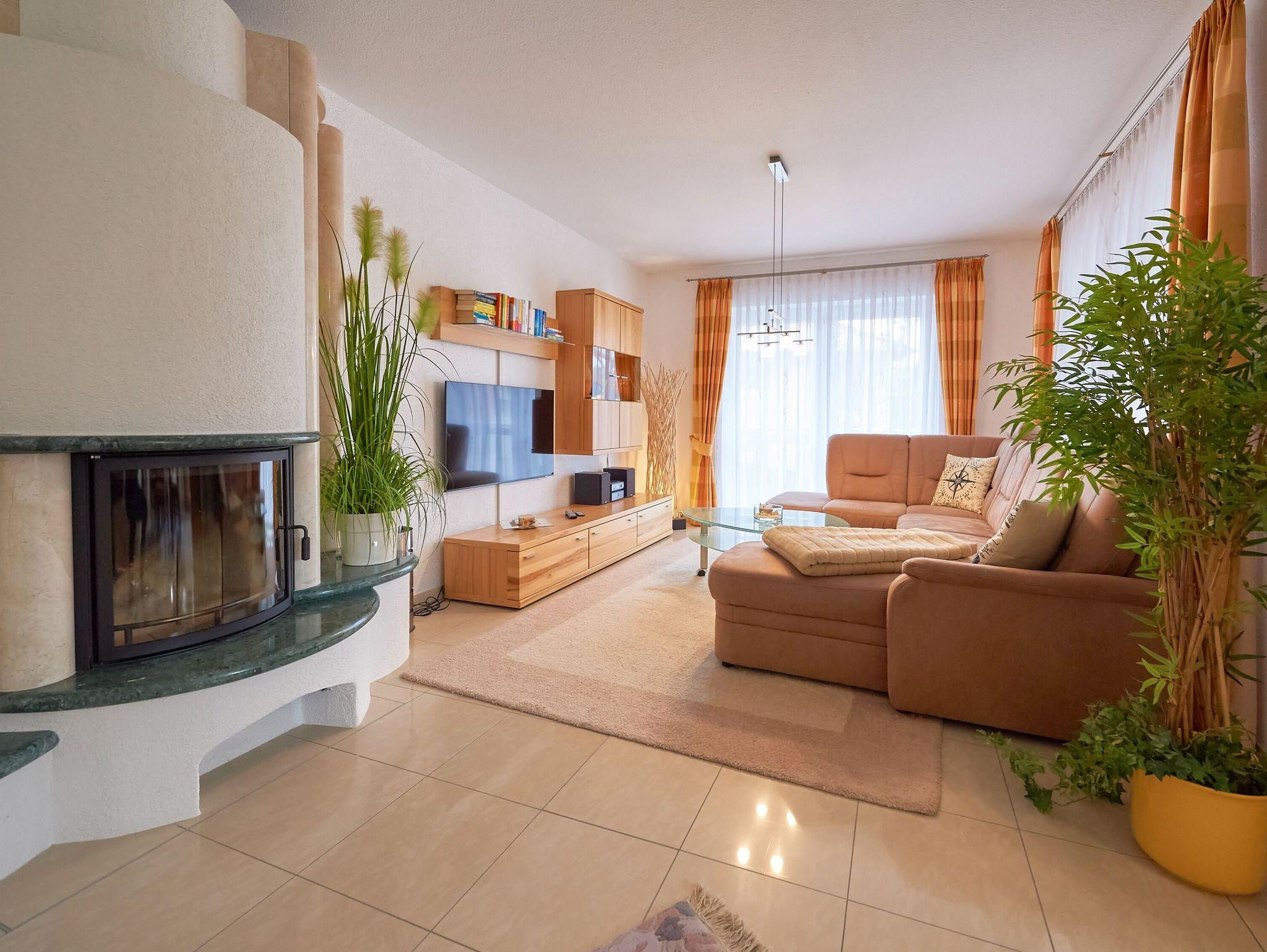 Das geräumige Wohnzimmer bietet mit gut 35 m² genügend Platz, um sich so richtig wohl zu fühlen. Ausgestattet mit einer bequemen Couch und Sesseln, einem Flachbild-TV, einer Stereoanlage mit Radio und CD-Player sowie einem großen Esstisch für 4 Personen, hält er für die besonders gemütlichen Stunden sogar einen Kamin bereit. Auch kostenfreies WLAN steht Ihnen zur Verfügung. Auf der vorgelagerten Terrasse lässt es sich wunderbar relaxen oder auch speisen. Die Balkon- bzw. Terrassenmöbel stehen saisonal - in der Regel von Mai bis Ende September - zur Verfügung.