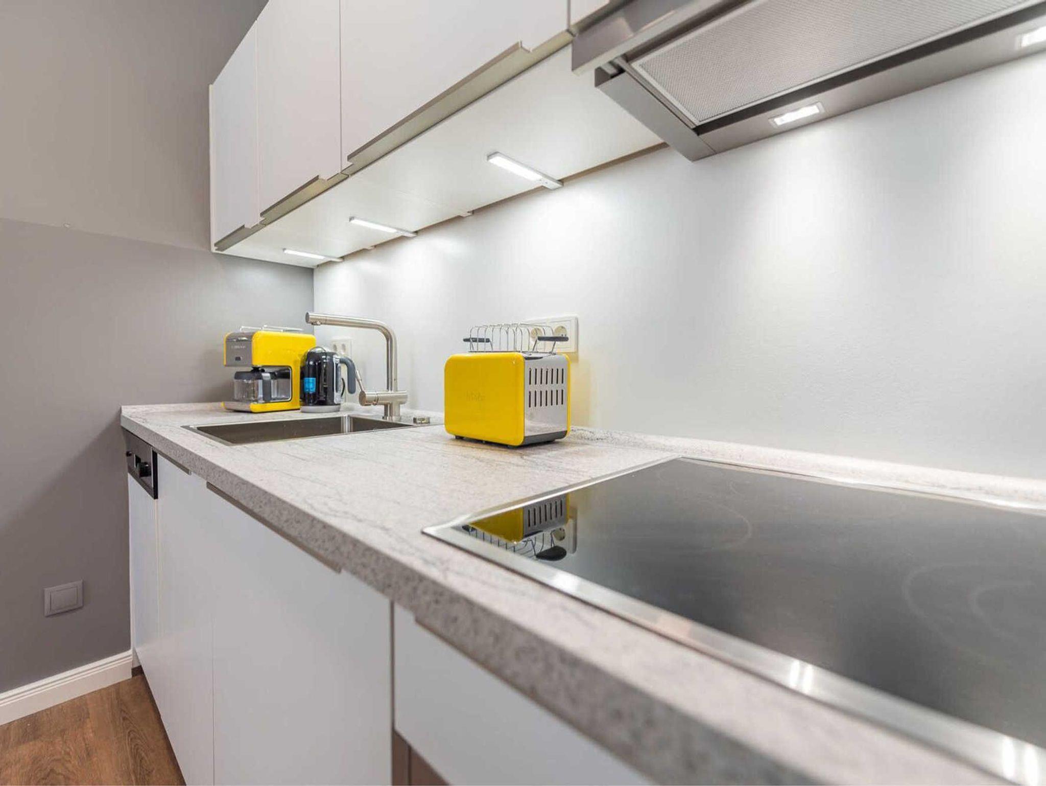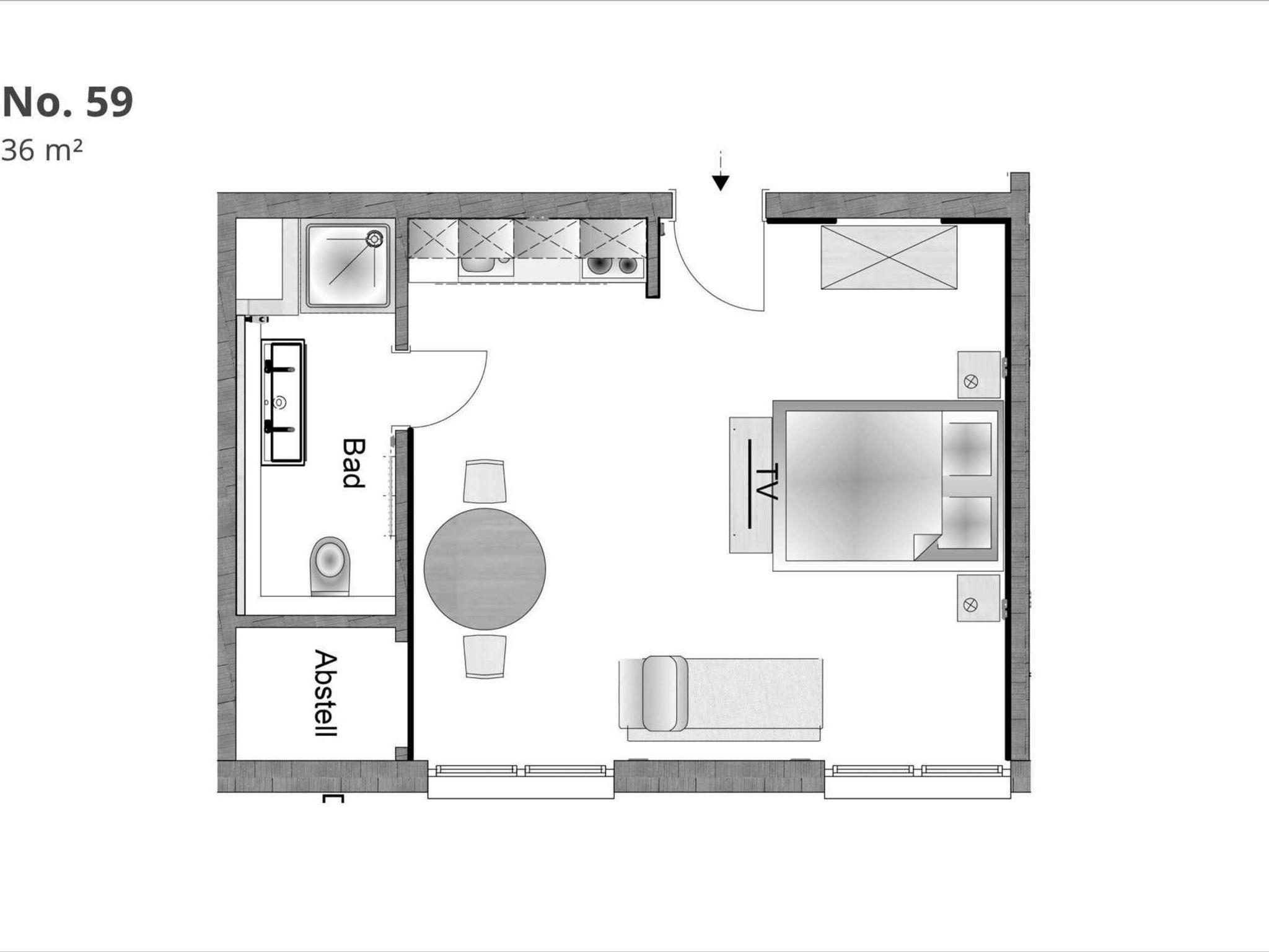 Neben dem kombinierten Wohn- / Schlafraumraum mit offener Küche und Essbereich, gibt es ein Badezimmer mit Waschtisch, Dusche, Handtuchheiztrockner und WC. Zur technischen Ausstattung gehört ein Flachbild-TV mit integriertem Radio und kostenlosem Internetzugang. Die neue Küche ist mit Geschirrspülmaschine, Backofen inkl. Mikrowellenfunktion, Cerankochfeld, Kühlschrank und diversen Kleingeräten perfekt ausgestattet.