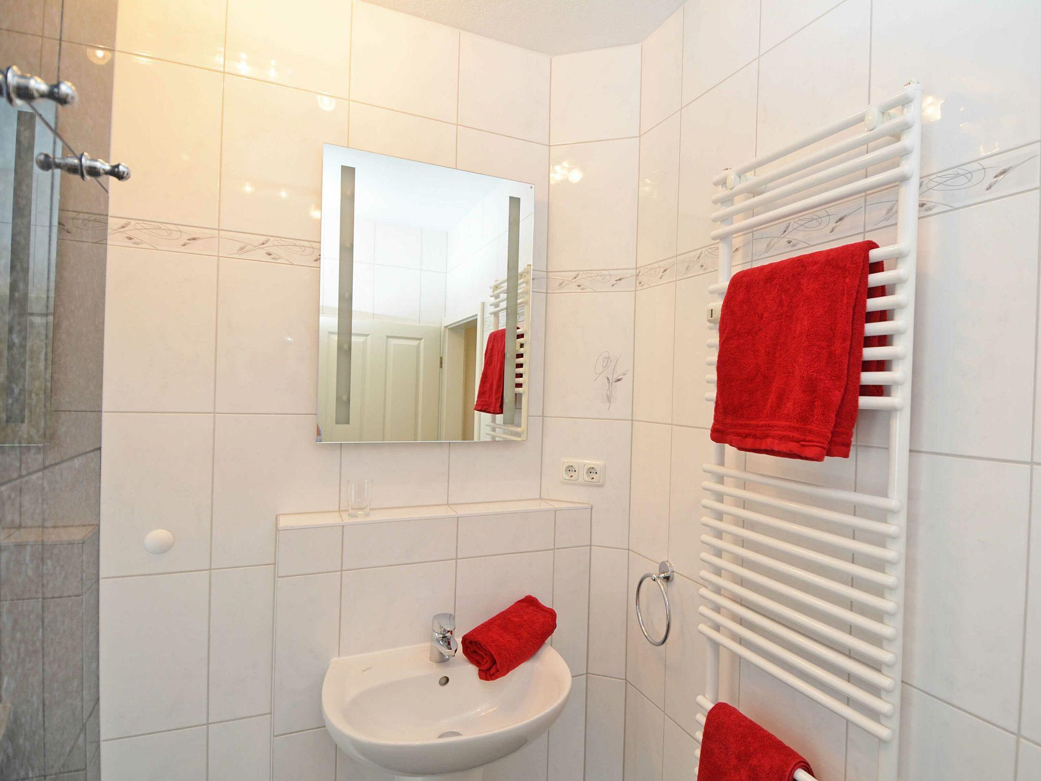 In dem modernen Tageslichtduschbad finden Sie neben einer großzügigen Dusche mit Glastür auch einen Handtuchwärmer und einen Haartrockner. Die gesamte Nichtraucherwohnung ist mit Bodenfliesen und Laminat ausgestattet.