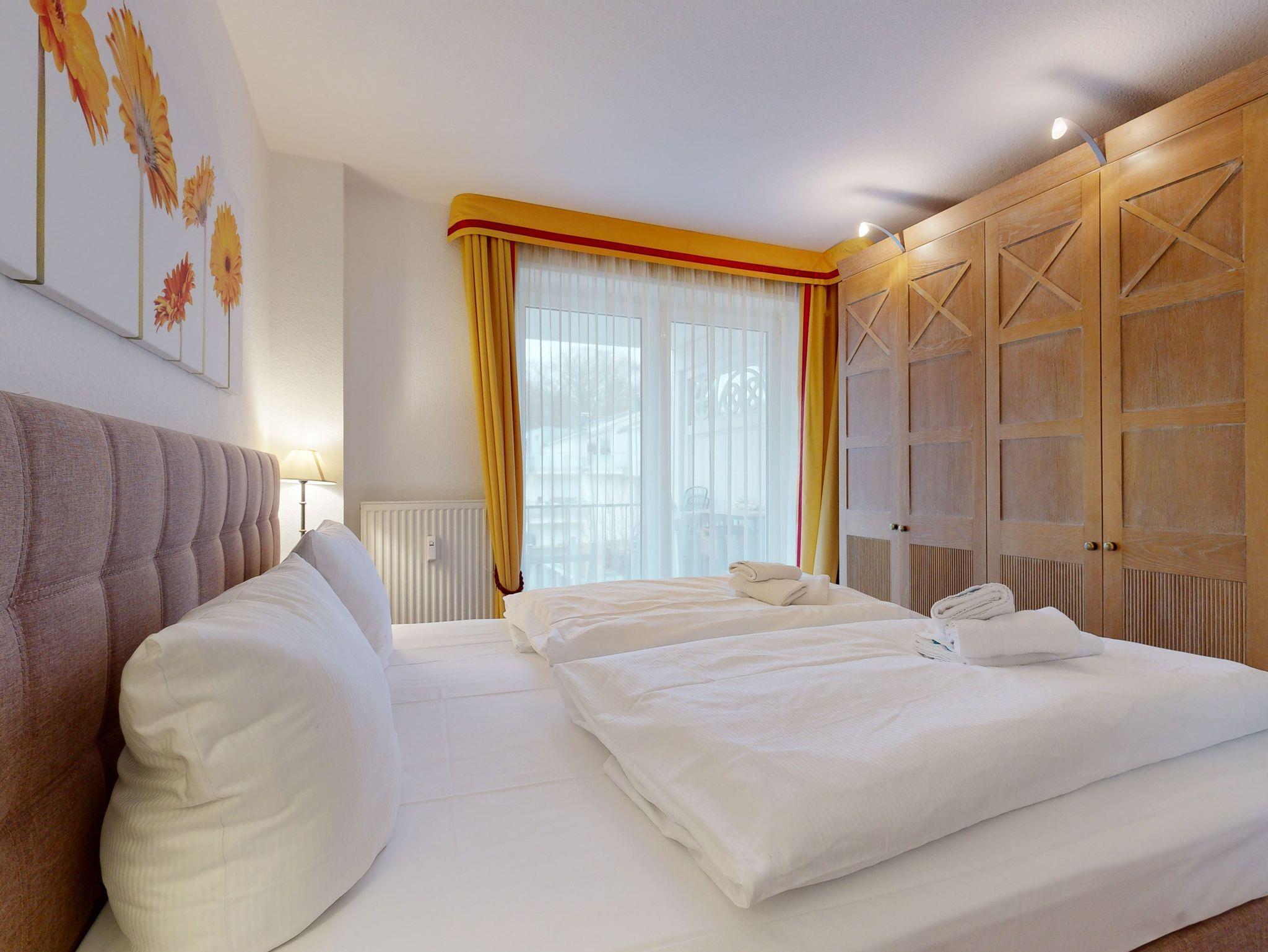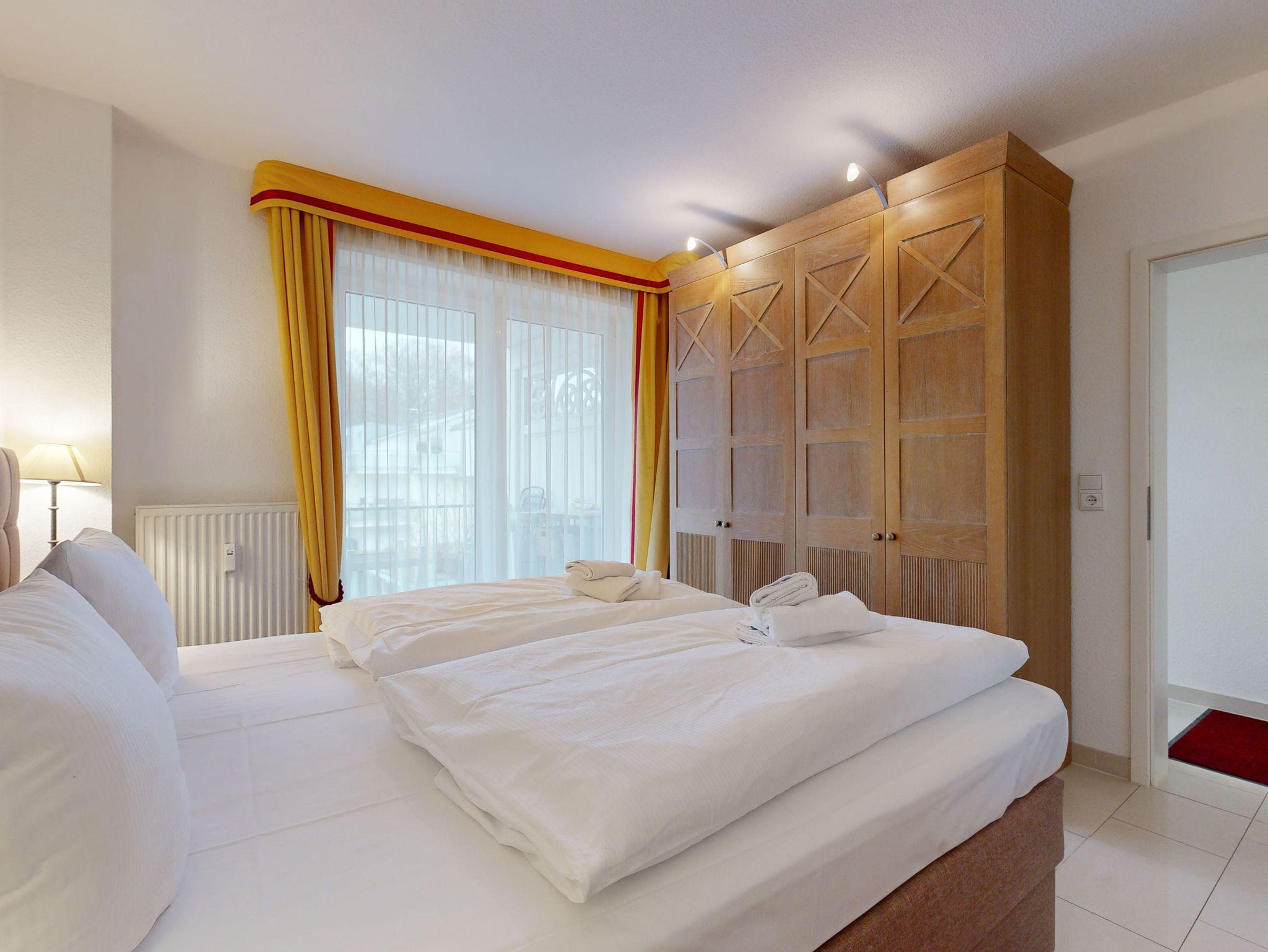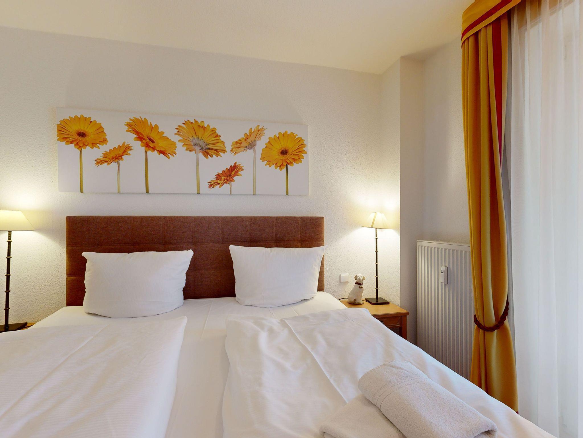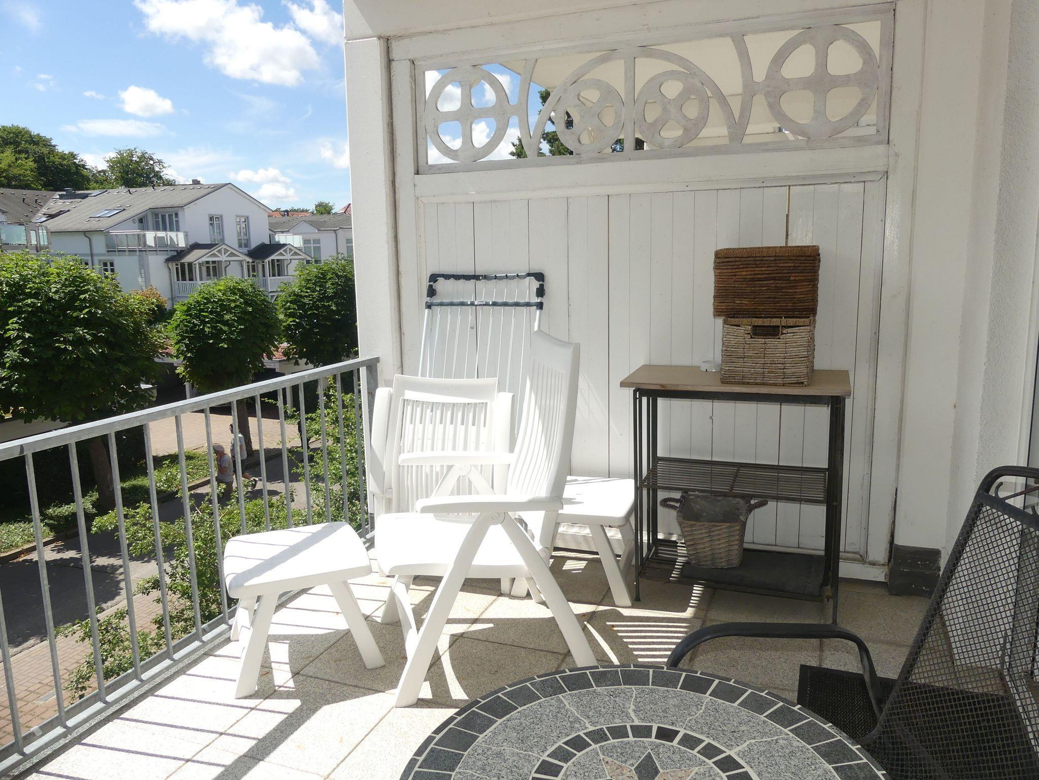 Komfort-Ferienwohnung in der Villa Freia in der 1. Etage (2 Zimmer / 47 m²) mit einem Schlafzimmer (Doppelbett (Boxspringbett), 1 Badezimmer und einem großen möblierten Balkon