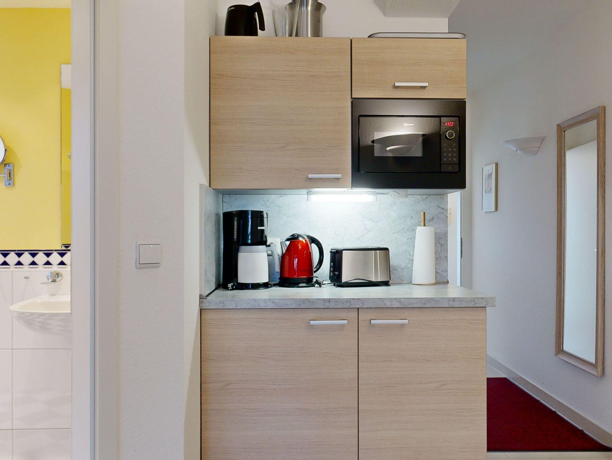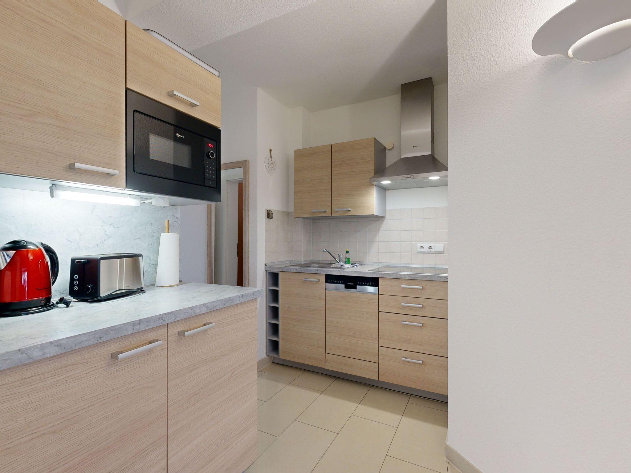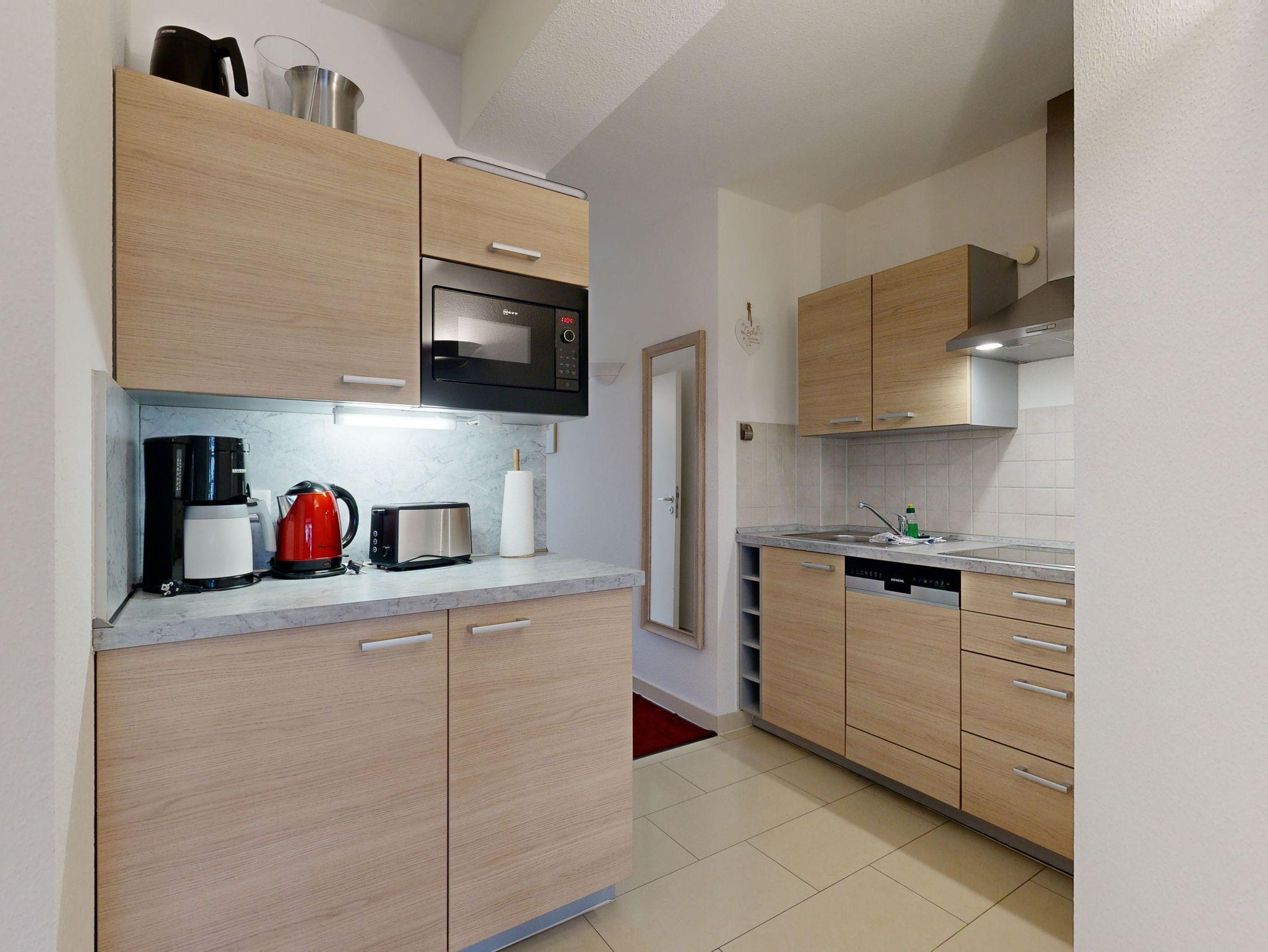 * Küche: Moderne Küchenzeile mit Ceran-Herd, Spülmaschine, Mikrowelle, Kaffeemaschine, Wasserkocher, Toaster