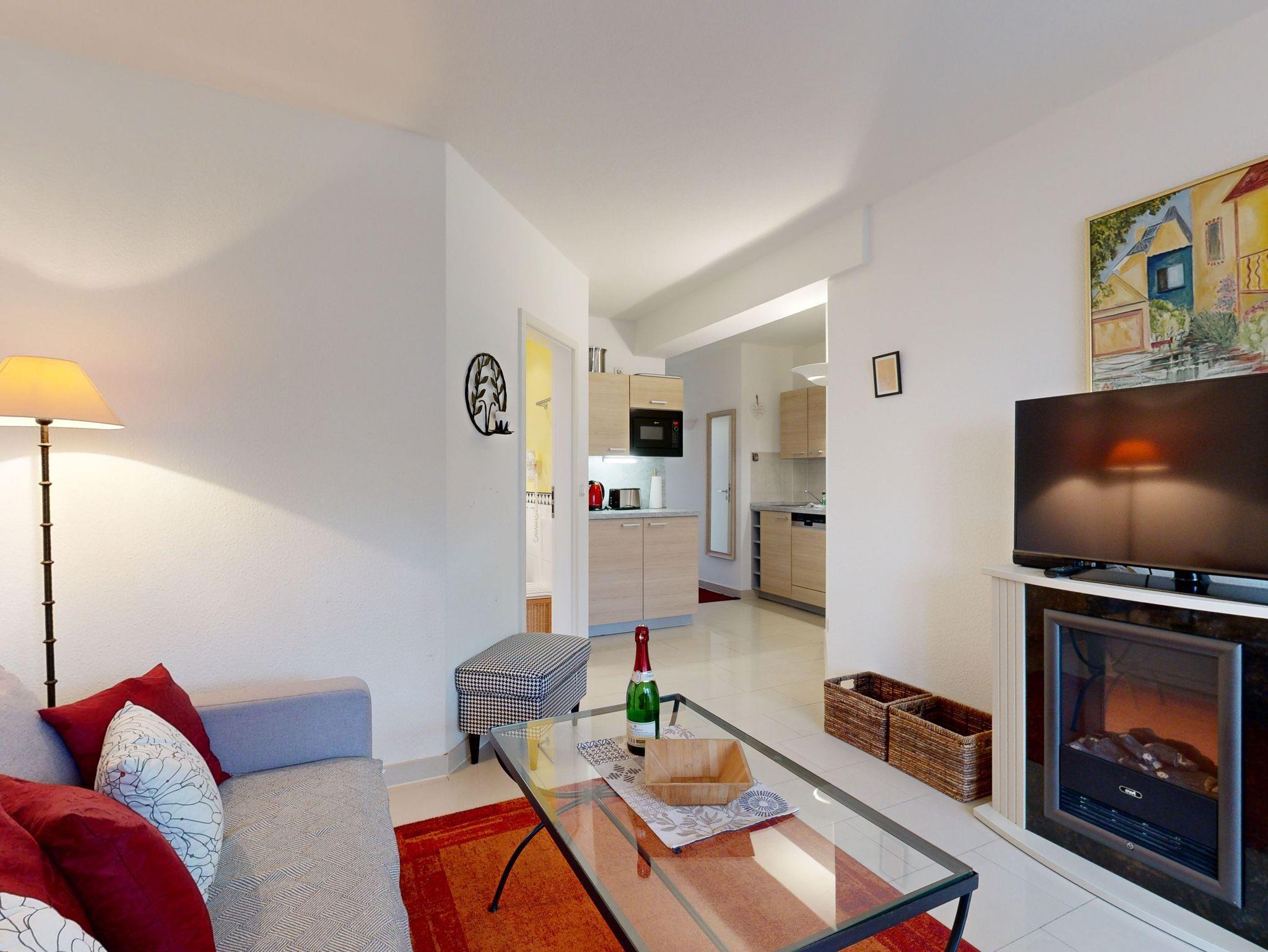 * Wohnzimmer: Couchgarnitur, Kamin (elektr.), Kabel-TV, Radio mit CD, DVD-Player, Internetanschluss, Essplatz, Meerblick