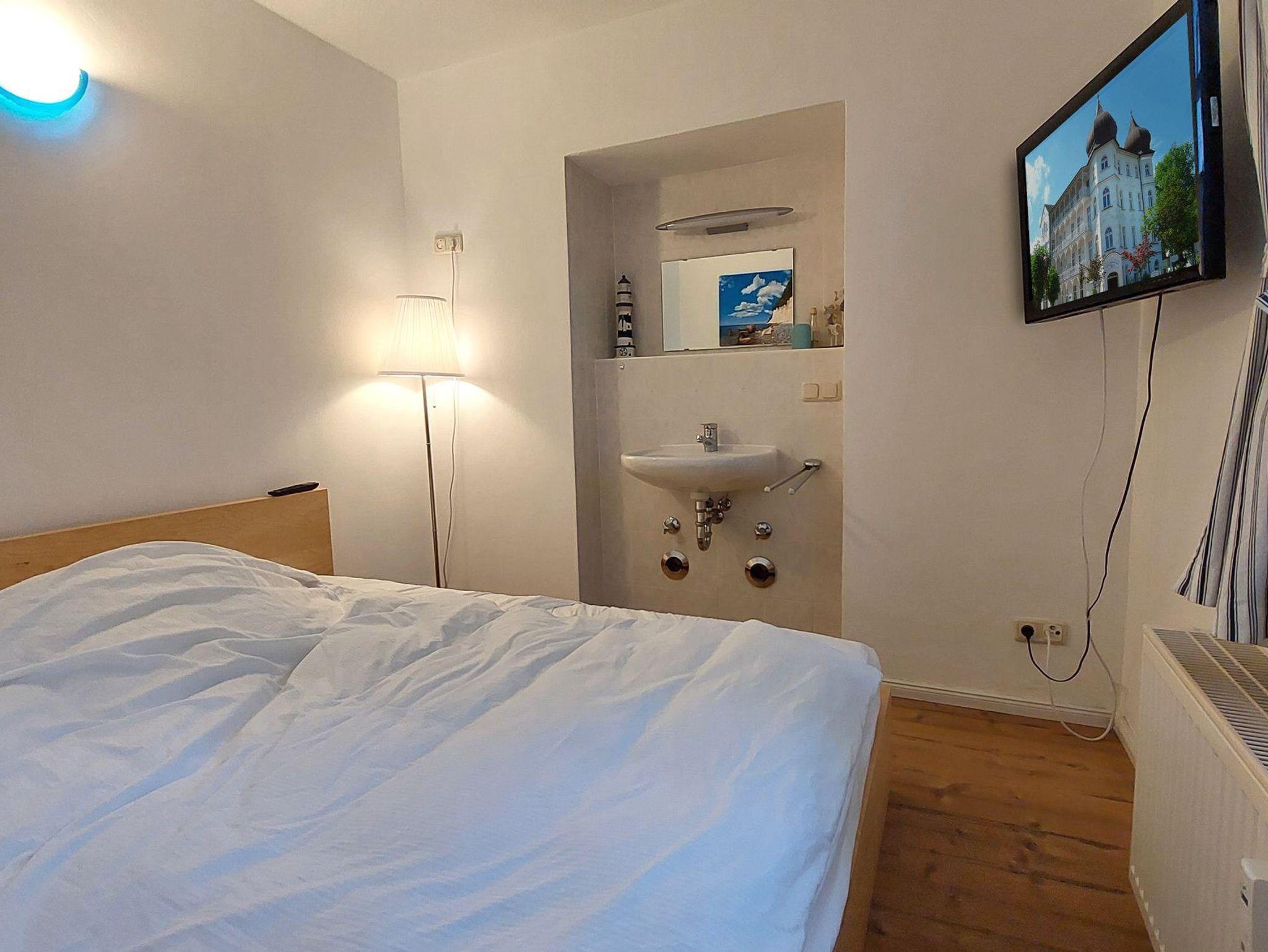 Das zusätzliche Schlafzimmer verfügt über ein französisches Bett, einen Flachbild-TV sowie über ein praktisches Waschbecken samt Spiegel.