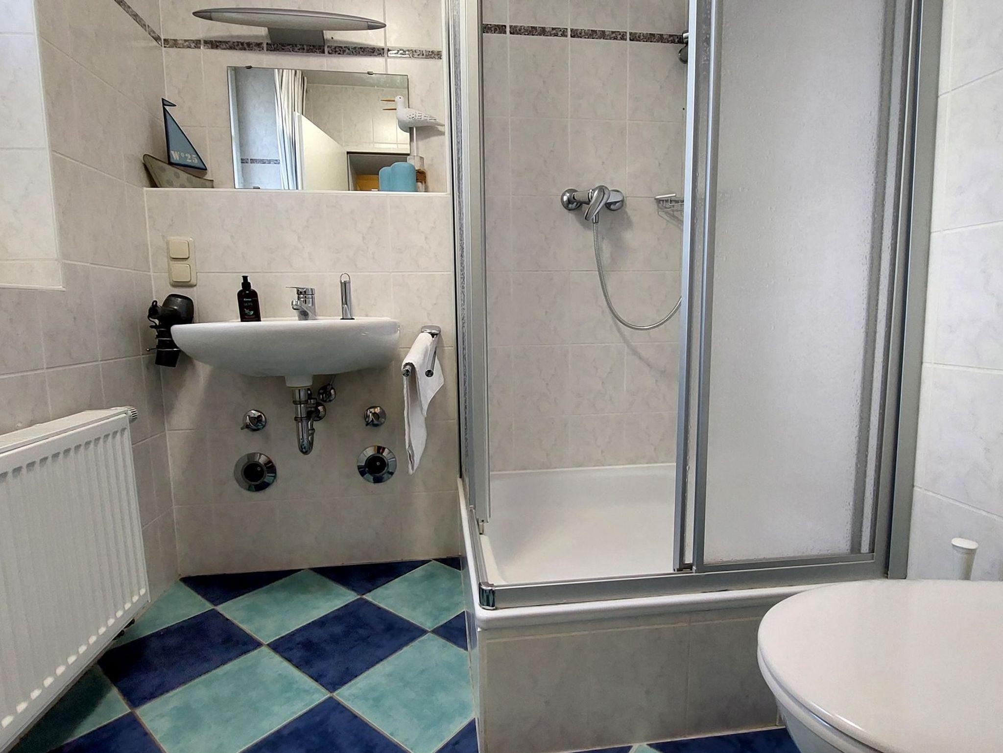 Im Tageslichtbad finden Sie Dusche, Waschbecken, WC und einen Föhn.