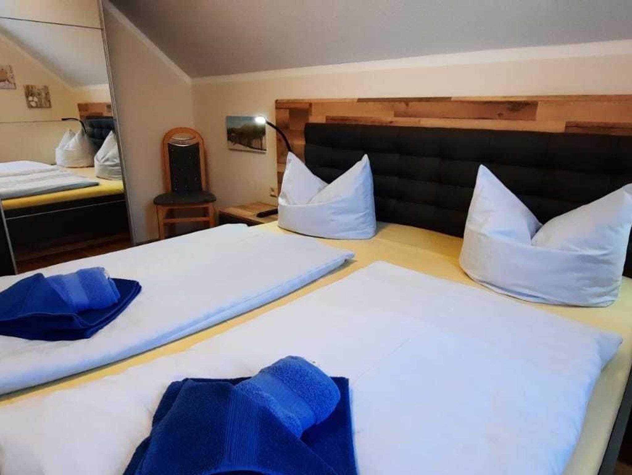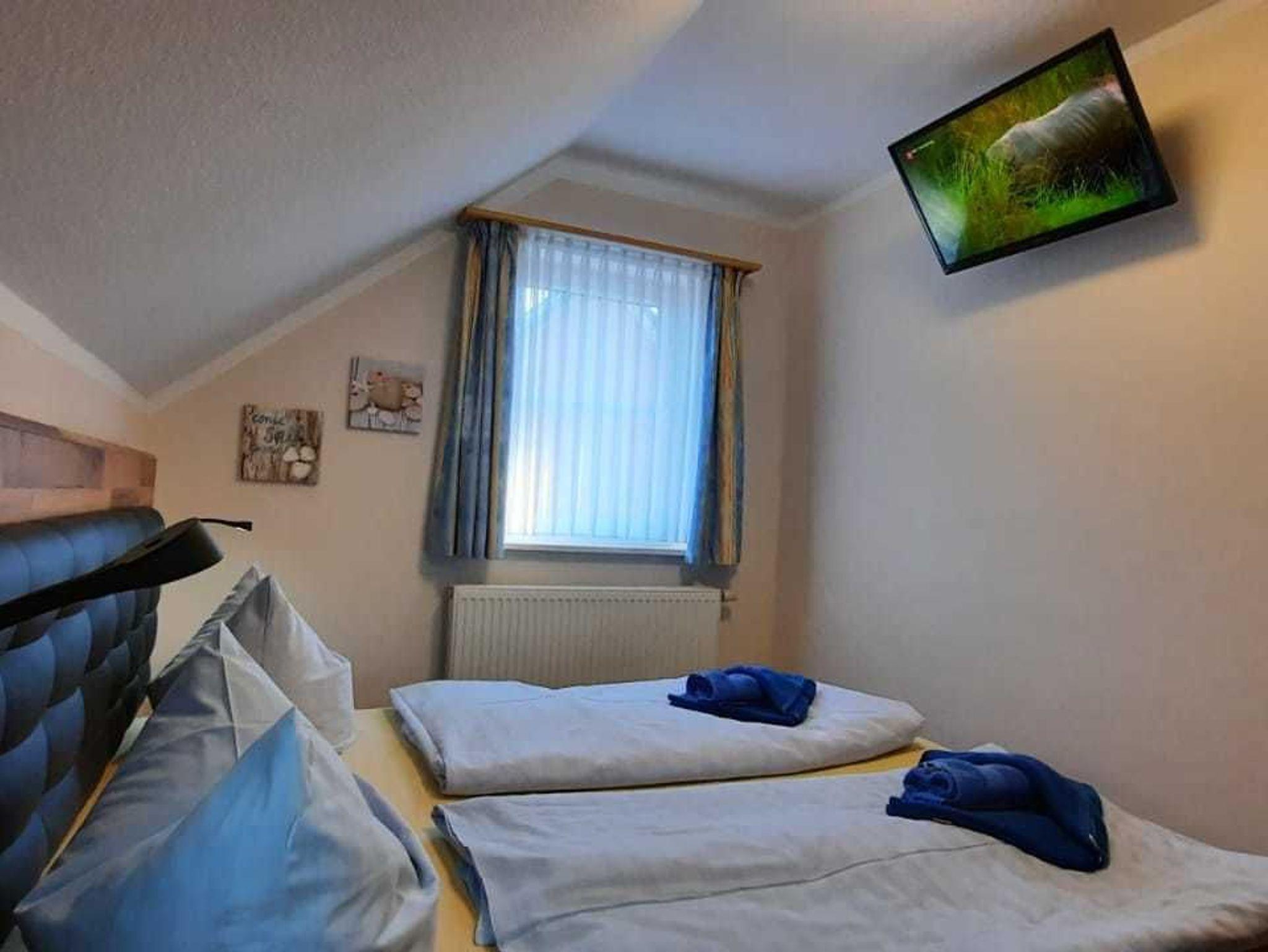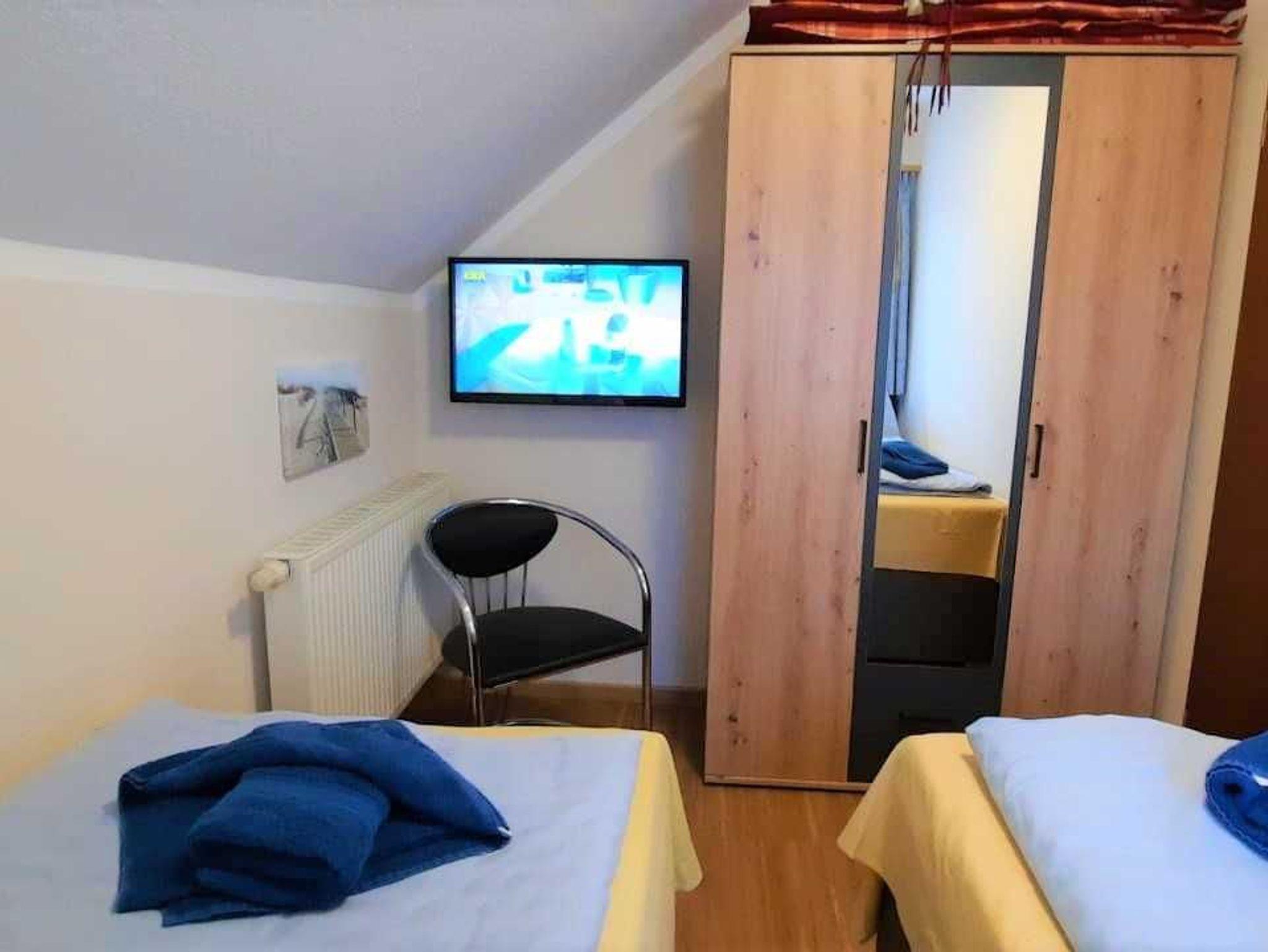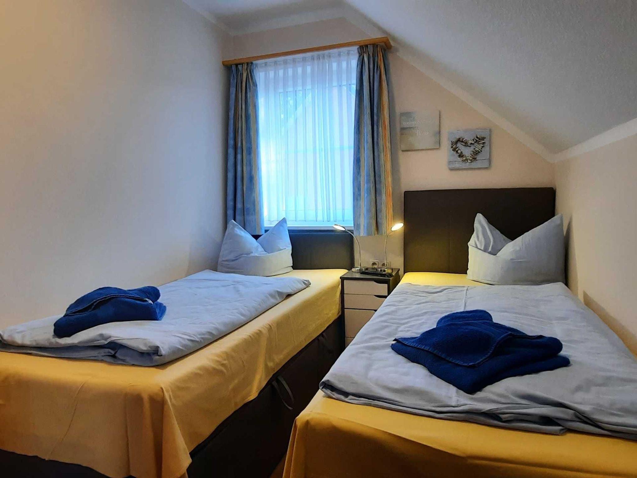 Unsere gemütlich eingerichtete 3-Zimmerwohnung (Nr. 4 oder Nr. 5) befindet sich im 1. Obergeschoss und verfügt über ca. 43 qm. Sie verfügt über einen möblierten Balkon und kann mit bis zu 4 Personen genutzt werden. Die Nichtraucherwohnung teilt sich auf in einen Wohnbereich, zwei Schlafzimmer, Tageslichtbad sowie eine im Wohnzimmer integrierte Küchenzeile mit Essbereich. Das Hauptschlafzimmer erwartet Sie mit Doppelbett sowie Kleiderschrank und TV. Im zweiten Schlafbereich stehen zwei Einzelbetten, Kleiderschrank und TV, zur Verfügung. Das Wohnzimmer ist mit Sofa, Sessel sowie mit einem Flachbild-Smart TV, WLAN und CD-Player mit Radio ausgestattet. Die Küchenzeile verfügt über einen Kühlschrank mit Gefrierfach, Backofen, Geschirrspüler, Geschirr, Besteck, Toaster, Mikrowelle, Ceranfeld, Kaffeemaschine und Wasserkocher. Das Tageslichtbad begrüßt Sie mit Dusche, Haartrockner und WC. Ein PKW- Stellplatz sowie Fahrradabstellmöglichkeit sind am Haus vorhanden.
