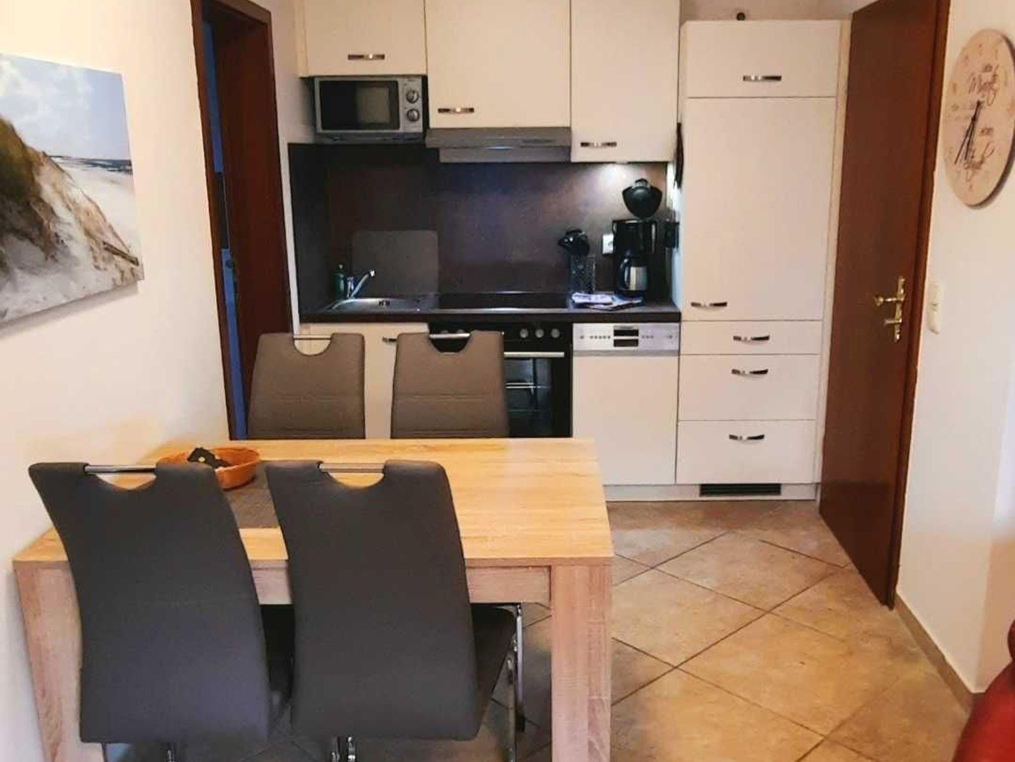Unsere gemütlich eingerichtete 3-Zimmerwohnung Nr. 4 befindet sich im 1. Obergeschoss und verfügt über ca. 43 qm. Sie verfügt über einen möblierten Balkon und kann mit bis zu 4 Personen genutzt werden. Die Nichtraucherwohnung teilt sich auf in einen Wohnbereich, zwei Schlafzimmer, Tageslichtbad sowie eine im Wohnzimmer integrierte Küchenzeile mit Essbereich. Das Hauptschlafzimmer erwartet Sie mit Doppelbett sowie Kleiderschrank und TV. Im zweiten Schlafbereich stehen zwei Einzelbetten, Kleiderschrank und TV, zur Verfügung. Das Wohnzimmer ist mit Sofa, Sessel sowie mit einem Flachbild-Smart TV, WLAN und CD-Player mit Radio ausgestattet. Die Küchenzeile verfügt über einen Kühlschrank mit Gefrierfach, Backofen, Geschirrspüler, Geschirr, Besteck, Toaster, Mikrowelle, Ceranfeld, Kaffeemaschine und Wasserkocher. Das Tageslichtbad begrüßt Sie mit Dusche, Haartrockner und WC. Ein PKW- Stellplatz sowie Fahrradabstellmöglichkeit sind am Haus vorhanden.
